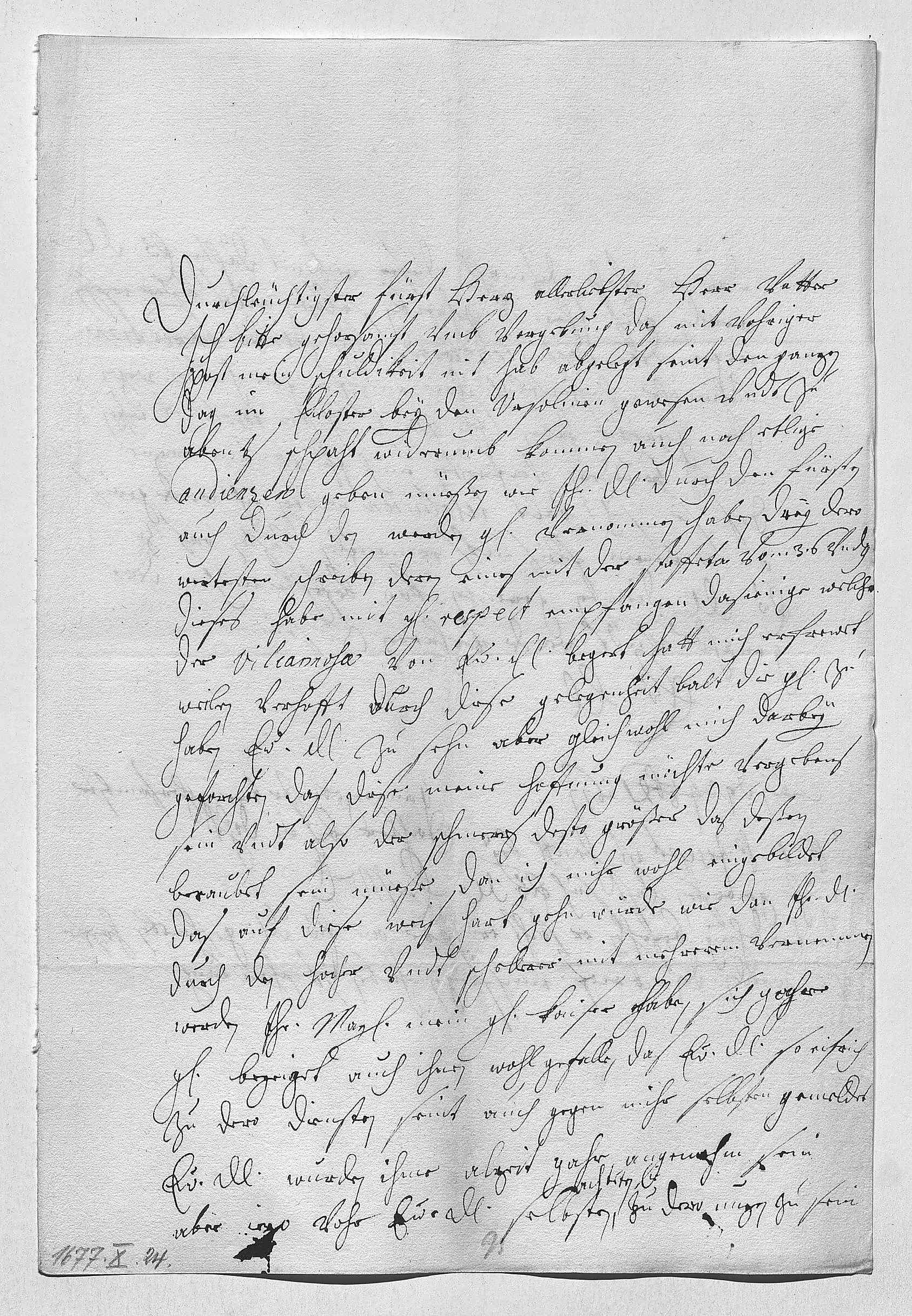 0001Durchleüchtigster Fürst, herz allerliebster herr vatter 0002Ich bitte gehorsamst vmb vergebung, das mit vohriger 0003post mein schuldikeit nit habe abgelegt. Seint den ganzen 0004dag im closter bey den vrsolinen gewesen vndt zu 0005abentz schpaht widerumb kommen. Habe auch noch etlige 0006audienzen geben müeßen, wie ihr Durchlaucht durch den Fürsten 0007auch durch den werden gnädig vernommen haben. Drey dero 0008wertesten schreiben, deren eines mit der staffeten vom 3, 6 vnd 90009dieses habe mit gehorsamsten respect empfangen. Dasienige welches0010der Viliannosa von ewer Durchlaucht begert, hatt mich erfrewet, 0011weilen verhofft, durch diese gelegenheit balt die gnad zu 0012haben, ewer Durchlaucht zu sehn, aber gleichwohl auch darbey 0013geforchten, das diese meine hoffnung möchte vergebens 0014sein vndt also der schmerz desto größer, das deßen 0015beraubet sein müeße, dan ich mihr wohl eingebildet, 0016das auf diese weis hart gehn würde, wie dan ihr Durchlaucht 0017durch den Hocher vndt Schellerer mit mehrerem vernemmen 0018werden. Ihr Mayestät, mein gnädigster Kaiser, haben sich gahr 0019gnädig bezeiget, auch ihnen wohl gefallen, das ewer Durchlaucht so eifrich 0020zu dero diensten seint, auch gegen mihr selbsten gemeldet, 0021ewer Durchlaucht wurden ihme alzeit gahr angenehm sein, 0022aber iezo vohr ewer Durchlaucht selbsten achteten, zu dero nuzen zu sein,