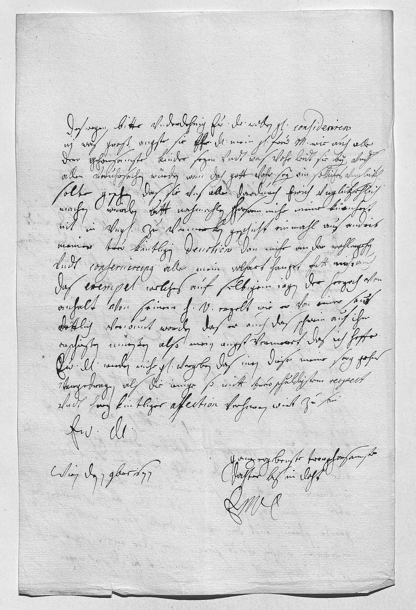 0023deswegen bitte vndterdehnig, ewer Durchlaucht wollen gnädigst consideriren, 0024in was groß angste sie ihr Durchlaucht, mein geliebste fraw mutter, wie auch alle 0025dero gehorsamste kinder sezen, vndt was vohr leidt sie bey vns 0026allen veruhrsachen würden, wan, dah gott vohr sey, ein solliches vnglükh 0027solte geschen, das sie vns alle dardurch ewich vnglüksehlich 0028machen würden. Bitt nochmahlen ghorsam, mihr meine küenheit 0029nit in vngnaden zu vermerken, geschicht einmahl aus andrib 0030meiner trew kintligen deuotion, dan mihr an der wohlergehn 0031vndt conseruirung alle mein wolfart hanget. Hatt mihr auch 0032das exempel, welches auf selbigem iagen der Herzoch von 0033Anhalt von seinem herrn vater erzelt, wie er von einer sau 0034döttlich verwunt worden, das er auch das schwein auf ihm 0035erschießen müeßen, also mein angst vermeret, das ich hoffe, 0036ewer Durchlaucht werden mihr gnädig vergeben, das inen diese meine sorg gahns 0037vorgedragen, als die ienige, so mitt trew schuldigstem respect 0038vndt herz kintliger affection verharren wirt zu sein 0039ewer Durchlaucht 0040ganz ergebenste trewgehorsamste 0041dochter bis in doht 0042EMT 0043Wien den 7 novembris 1677