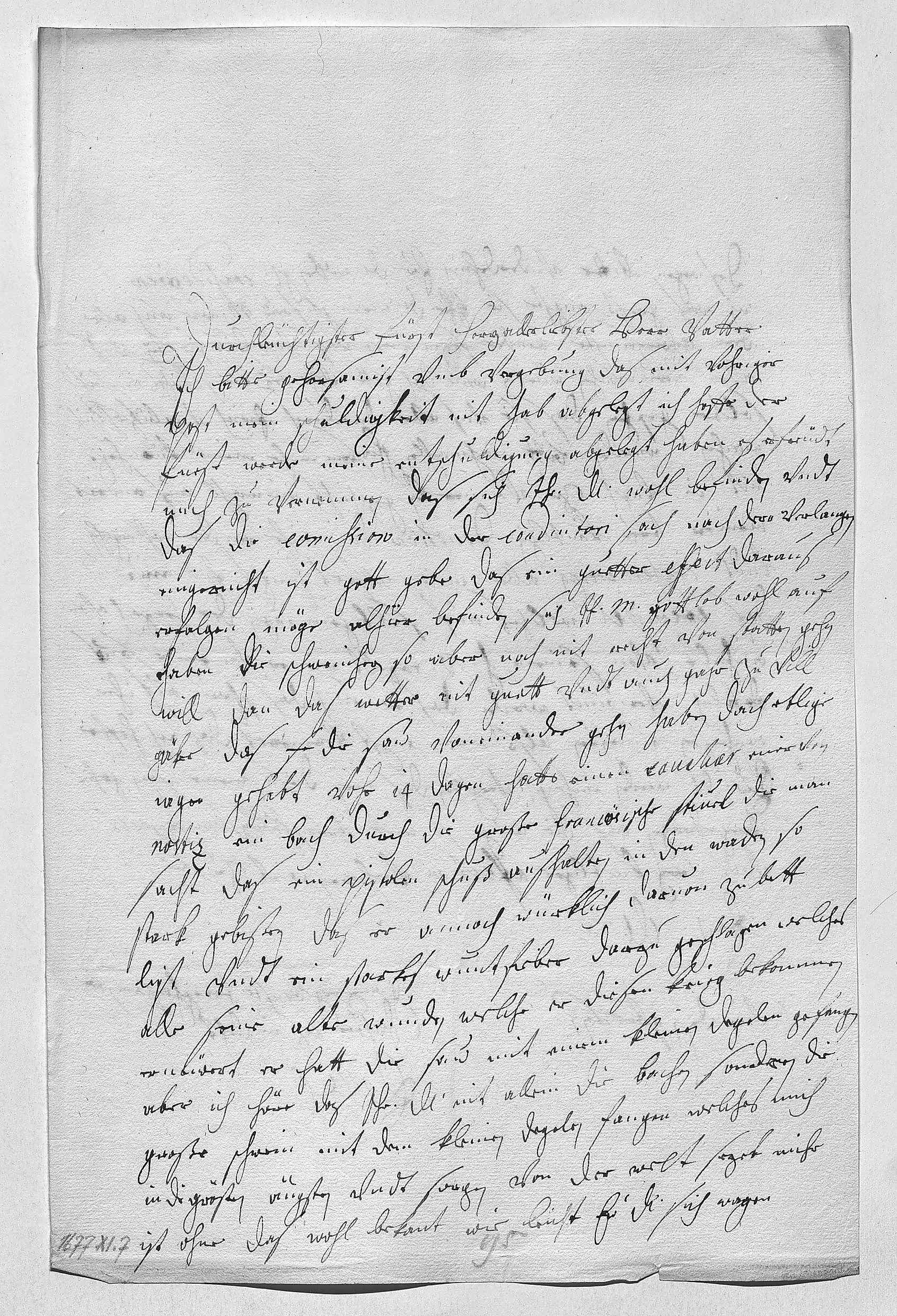 0001Durchleüchtigster Fürst, herzallerliebster herr vatter 0002Ich bitte gehorsamist vmb vergebung, das mit vohriger 0003post mein schuldigkeit nit hab abgelegt, ich hoffe, der 0004Fürst werde meine entschuldigung abgelegt haben. Es erfreüdt 0005mich zu vernemmen, das sich ihr Durchlaucht wohl befinden vndt 0006das die comission in der coadiutori sach nach dero verlangen 0007eingericht ist. Gott gebe, das ein guetter effect daraus 0008erfolgen möge. Alhier befinden sich ihr Mayestät gottlob wohl auf. 0009Haben die schweinhez, so aber noch nit recht von statten gehn 0010will, dan das wetter nit guett vndt auch gahr zu vill 0011gäker, das se die sau voneinander gehn. Haben dach etlige 0012iagen gehabt. Vohr 14 dagen hatte einen caualir, einer von 0013Nostiz, ein bach durch die große francösische stiuel, die man 0014sacht das ein pistolen schuß aushalten, in den waden so 0015stark gebißen, das er annoch würklich daruon zubett 0016ligt vndt ein starkes wuntfieber darzu geschlagen, welches 0017alle seine alte wunden, welche er diesen krieg bekommen, 0018ernewert. Er hatt die sau mit einem kleinen degelen gefangen, 0019aber ich höre, das ihr Durchlaucht nit allein die bachen, sondern die 0020große schwein mit dem kleinen degelen fangen, welches mich 0021in die grösten ängsten vndt sorgen von der welt sezet. Mihr 0022ist ohne das wohl bekant, wie leicht ewer Durchlaucht sich wagen,