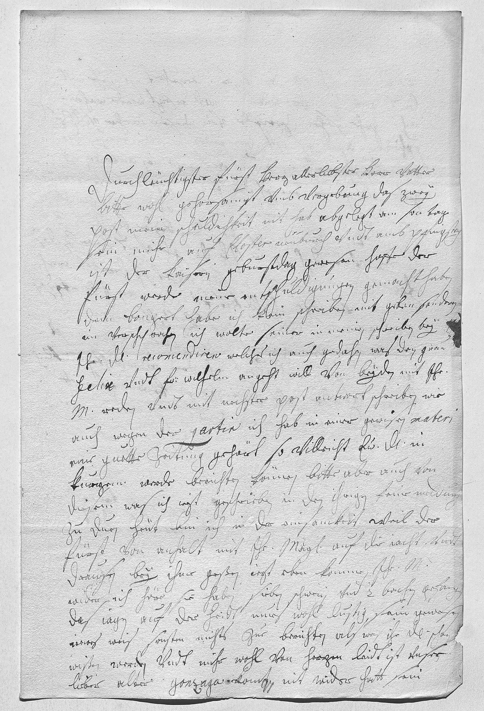 0001Durchleüchtigster Fürst, herz allerliebster herr vatter 0002Bitte wohl gehorsamist vmb vergebung, das zwey 0003post mein schuldichkeit nit hab abgelegt. Am sontag 0004sein mihr auf Closter Neüburch, vndt amb pfingstag 0005ist der Kaiserin geburstdag gewesen. Hoffe, der 0006Fürst werde meine entschuldigungen gemacht haben. 0007Dem Bongert habe ich kein schreiben mit geben, sondern 0008im verschprochen, ich wolte seiner in meinen schreiben bey 0009ihr Durchlaucht recomendiren, welches ich auch gedahn. Was den Grau 0010Felix vndt Fürst Wilhelm angeht, will von beyden mit ihr 0011Mayestät reden vnd mit nechster post antwort schreiben, wie 0012auch wegen der qartir. Ich hab in einer gewisen materi 0013eine guette zeitung gehört, so villeicht ewer Durchlaucht in 0014kurzem werde berichten können, bitte aber auch von 0015diesem, was ich iezt geschrieben, in dem ihrigen keine meldung 0016zu duen. Heüt bin ich in der einsamkeit, weil der 0017Fürst von Anhalt mit ihr Mayestät auf die iacht vndt 0018drausen bey ihme geßen. Iezt eben kommen ihr Mayestät 0019wider, ich höre, sie haben sieben schwein vnd 2 bachen gefangen, 0020das iagen auf der heidt mues wohl lustig sein gewesen. 0021Newes weis sonsten nichts zue berichten als was ihr Durchlaucht schon 0022wißen werden, vndt mihr wohl von herzen leidt ist. Vnser 0023lieber alter Gonzaga komt nit wider, hatt sein