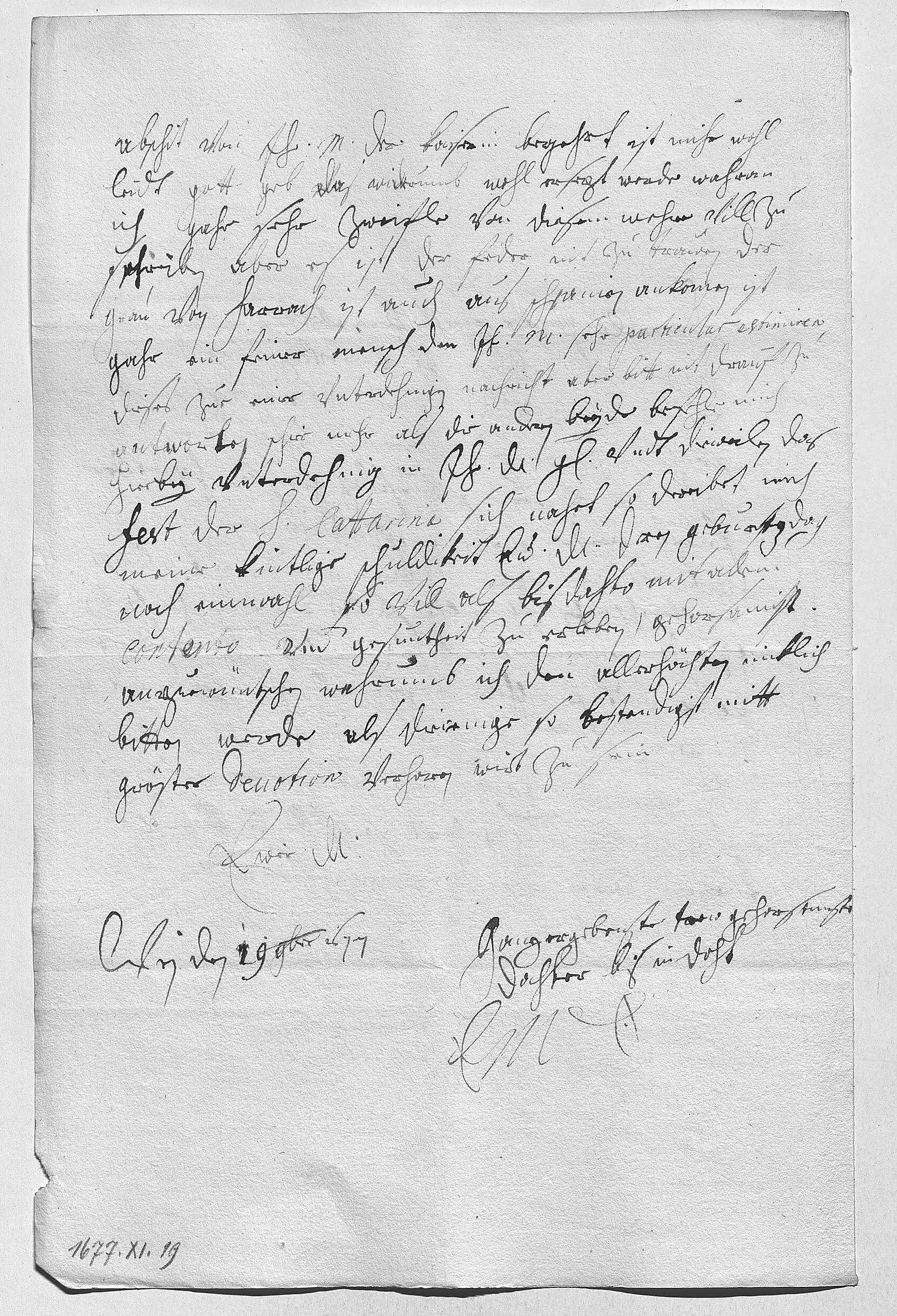0024abschit von ihr Mayestät der Kaiserin begehrt. Ist mihr wohl 0025leidt, gott geb, das widerumb wohl ersezt werde, wahran 0026ich gahr sehr zweifle. Von diesem wehre vill zu 0027schreiben, aber es ist der feder nit zu trawen. Der 0028Grau von Harrach ist auch aus Schpanien ankomen, ist 0029gahr ein feiner mensch, den ihr Mayestät sehr particular estimiren. 0030Dieses zue einer vnterdehnigen nachricht, aber bitt nit drauf zu 0031antworten, schier mehr als die andern beyde. Befehle mich 0032hierbey vnterdehnig in ihr Durchlaucht gnade, vndt dieweilen das 0033fest der heiligen Cattarina sich nahet, so dreibet mich 0034meine kintlige schuldikeit, ewer Durchlaucht deren geburtzdag 0035noch einmahl so vill als bis dahto mit allem 0036contento vnd gesuntheit zu erleben, gehorsamist 0037anzuewüntschen, wahrumb ich den allerhöchsten iniklich 0038bitten werde als dieienige, so bestendigst mitt 0039gröster deuotion verharen wirt zu sein 0040ewer Durchlaucht 0041ganz ergebenste trew gehorsamste 0042dochter bis in doht 0043EMT 0044Wien den 19 novembris 1677