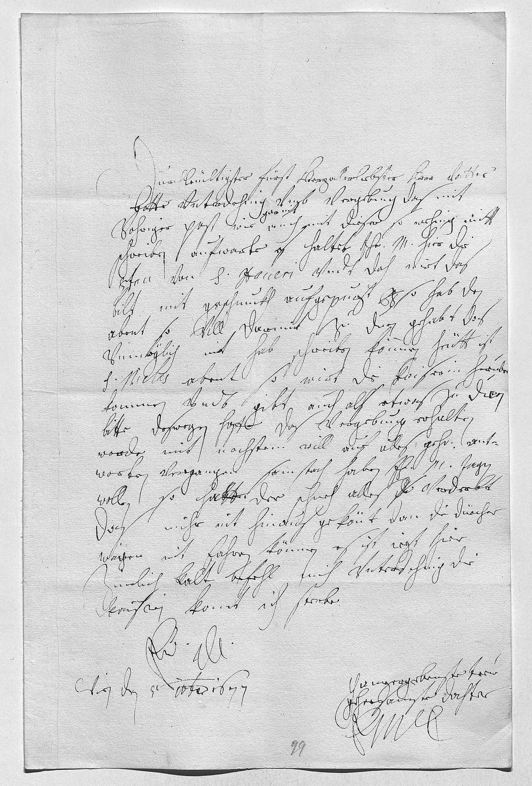 0001Durchleüchtigster Fürst, herzallerliebster herr vatter 0002Bitte vnterdehnig vmb vergebung das mit 0003vohriger post gar nit wie auch mit dieser so wehnig mitt 0004schreiben aufwarte. Es haltet ihr Mayestät hier die 00058ten von Sankt Xaueri, vndt dah wirt das 0006bilt mit geschmukh aufgepuzt, so hab den 0007abent so vill darmit zu duen gehabt, das 0008vnmöglich nit hab schreiben können. Heütt ist 0009Sankt Niclas abent, so wirt die Kaiserin heruber 0010kommen vndt gibt auch als etwas zu duen. 0011Bitte deswegen und hoffe, das vergebung erhalten 0012werde, mit nachstem will auf alles gehorsamst ant- 0013worten. Vergangen samstach haben ihr Mayestät jagen 0014wollen, so hatt der schneh alles so verderbt, 0015das mihr nit hinaus gekönt, dan die düecher 0016wägen nit fahren können. Es ist iezt hier 0017zimlich kalt. Befehl mich vnterdehnig, die 0018Kaiserin komt, ich sterbe 0019ewer Durchlaucht 0020ganzergebenste trew 0021gehorsamste dochter 0022EMT 0023Wien den 5 decembris 1677