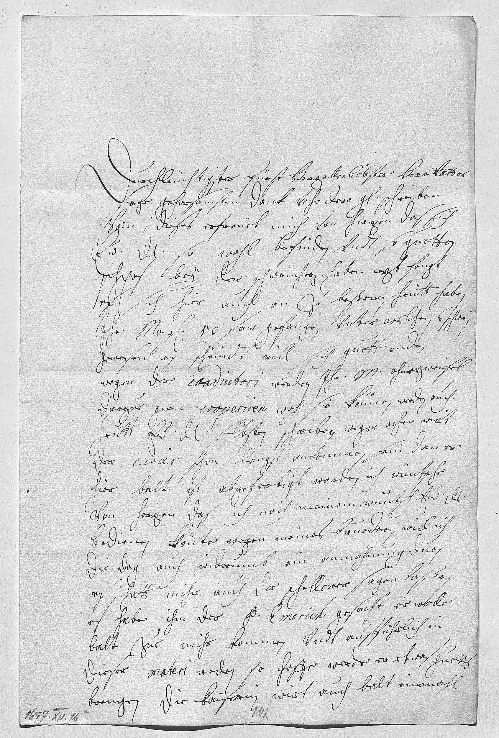 0001Durchleüchtigster Fürst, herzallerliebster herr vatter 0002Sage gehorsamstem dank vohr dero gnädiges schreiben 0003vom 1 dises. Erfreüet mich von herzen, das sich 0004ewer Durchlaucht so wohl befinden vndt so guetten 0005schpas bey der schweinhez haben. Iezt fangt 0006es sich hier auch an zu beßeren, heütt haben 0007ihr Mayestät 50 saw gefangen, vnter welchen 6 schwein 0008gewesen, es scheindt, die jagd will sich guett enden. 0009Wegen der coadiutori werden ihr Mayestät ohne zweifel 0010darzue gern cooperiren woh sie können, werden auch 0011heütt ewer Durchlaucht selbsten schreiben. Wegen Achen wirt 0012der curier schon langst ankommen sein, dan er 0013hier balt ist abgefertigt worden. Ich wüntsche 0014von herzen, das ich nach meinem wuntsch ewer Durchlaucht 0015bedienen könte. Wegen meines bruedern will ich 0016die dag auch widerumb ein anmahnung duen. 0017Es hatt mihr auch der Schellerer sagen laßen, 0018es habe ihm der Pater Emerich gesacht, er wolle 0019balt zue mihr kommen vndt ausführlich in 0020dieser materi reden, so hoffe werde er etwas guetts 0021brengen. Die Kaiserin wirt auch balt einmahl