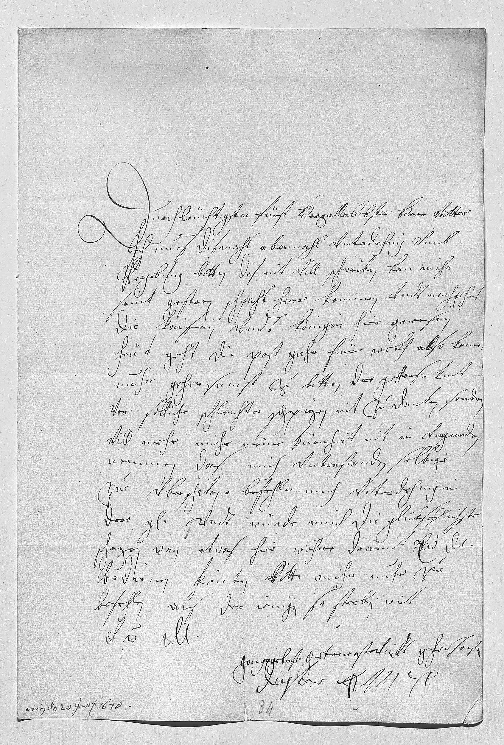 0001Durchleüchtigster Fürst, herzallerliebster herr vatter 0002Ich mues dismahl abermahl vnterdehnig vmb 0003vergebung bitten, das nit vill schreiben kan. Mihr 0004seint gestern schpaht herr kommen vndt nachgehns 0005die Kaiserin vndt Königin hier gewesen. 0006Heüt geht die post gahr früe wekh, also kome 0007nuhr, gehorsamst zu bitten, dero gehorsames kint 0008vor solliche schlechter schpizen nit zu danken, sondern 0009vill mehr mihr meine küenheit nit in vngnaden 0010nemmen, das mich vnterstanden selbige 0011zue überschiken. Befehle mich vnterdehnig in 0012dero gnade vndt würde mich die glüksehlichste 0013schezen, wan etwas hier wehre, darmit ewer Durchlaucht 0014bedienen könte, bitte mihr nuhr zue 0015befehlen als der ienigen, so sterben wirt 0016ewer Durchlaucht 0017ganzergebenste getreweste vndt gehorsamste 0018dochter EMT 0019Wien den 20 januarij 1678