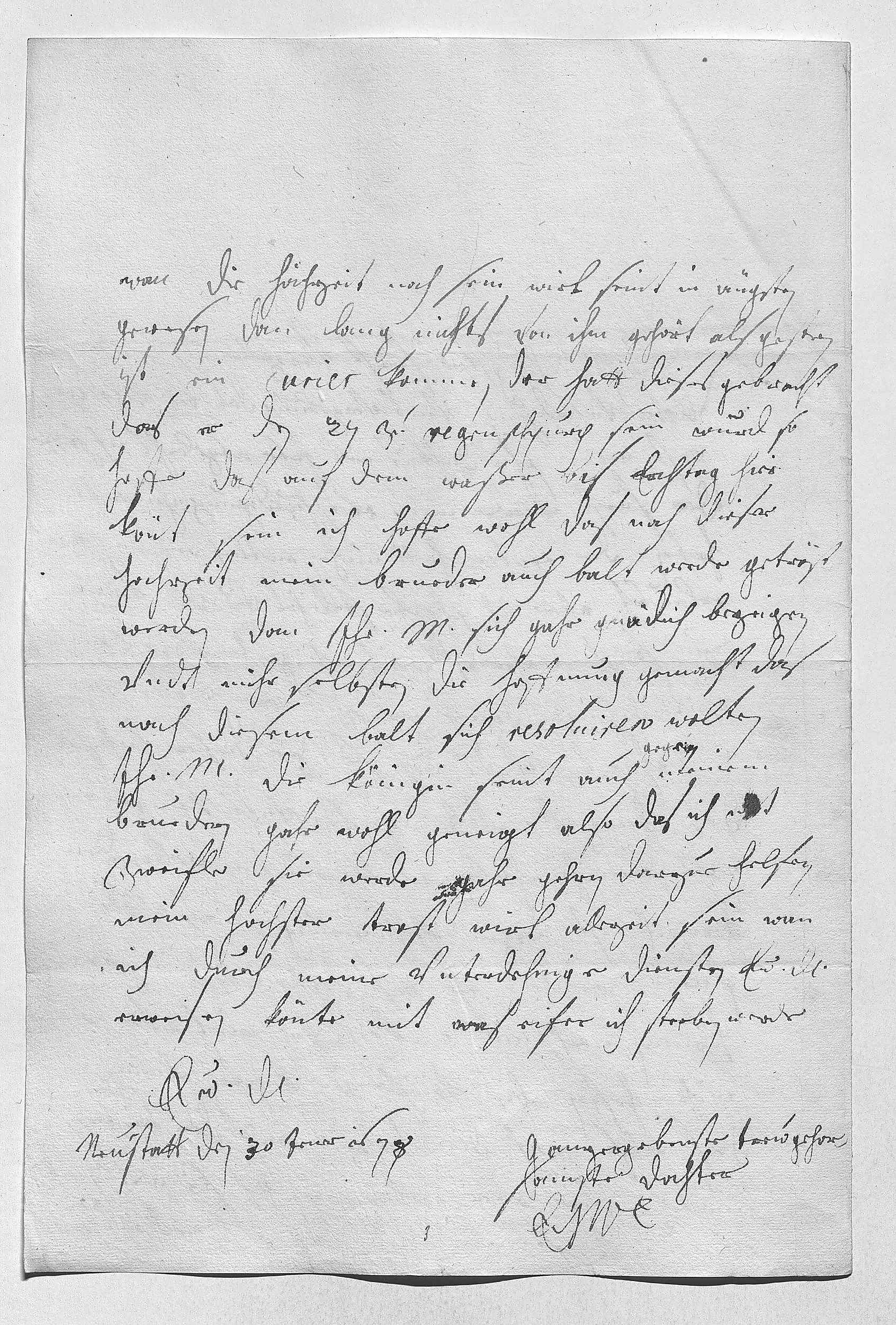 0019wan die höchzeit noch sein wirt. Seint in ängsten 0020gewesen, dan lang nichts von ihm gehört als gestern, da0021ist ein curier kommen, der hatt dieses gebracht 0022das er den 27 zu Regenschpurg sein wurd, so 0023hoffe, das auf dem waßer bis erchtag hier 0024könt sein. Ich hoffe wohl, das nach dieser 0025hochzeit mein brueder auch balt werde getröst 0026werden, dan ihr Mayestät sich gahr gnädich bezeigen 0027vndt mihr selbsten die hoffnung gemacht, das 0028nach diesem balt sich resoluiren wolten. 0029Ihr Mayestät die Königin seint auch gegen meinem 0030bruedern gahr wohl geneigt, also das ich nit 0031zweifle, sie werde gahr gehrn darzue helfen. 0032Mein höchster trost wirt allezeit sein, wan 0033ich durch meine vnterdehnige diensten ewer Durchlaucht 0034erweisen könte, mit was eifer ich sterben werde 0035ewer Durchlaucht 0036ganz ergebenste trewgehor- 0037samste dochter 0038EMT 0039Neustatt den 30 jener 1678