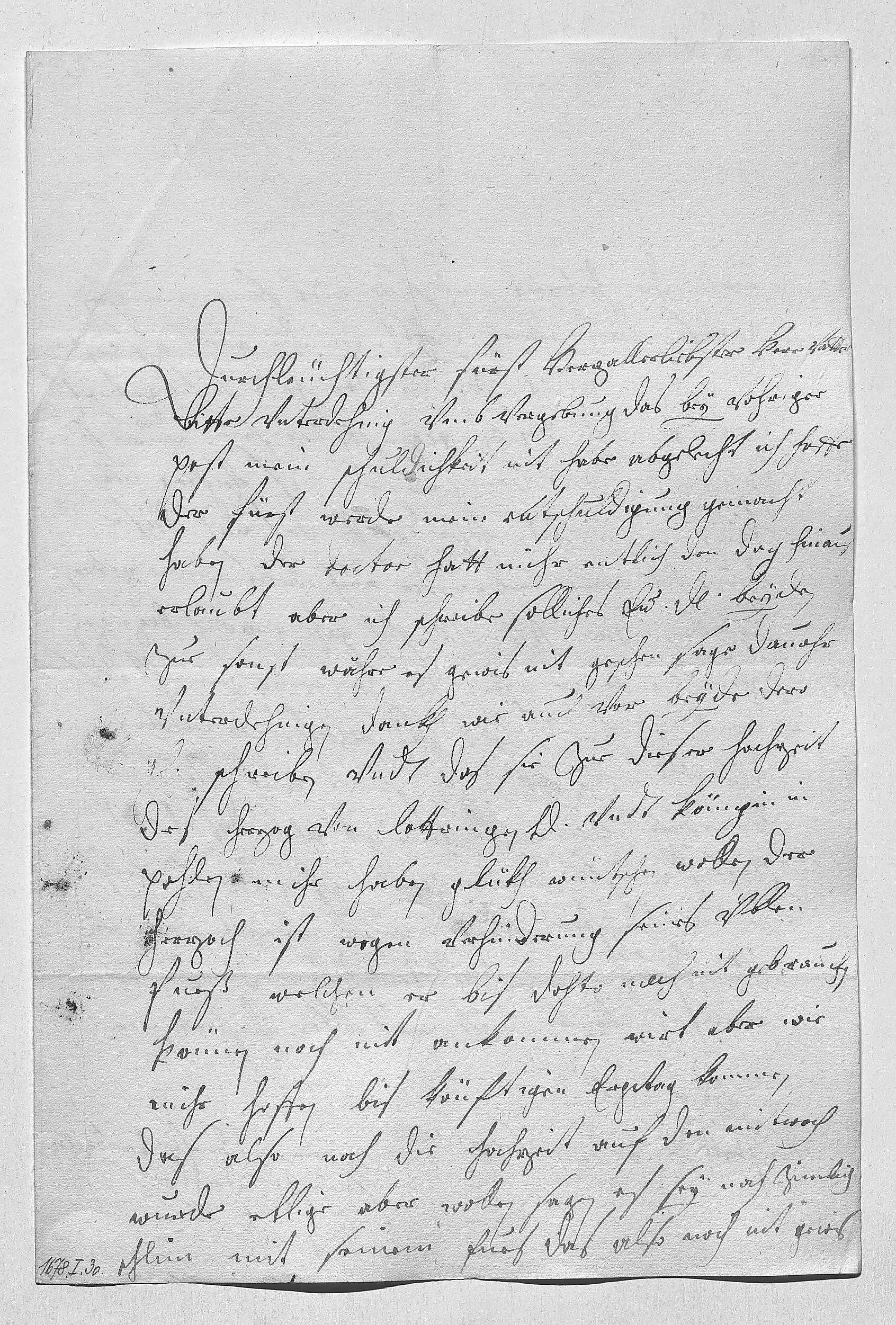 0001Durchleüchtigster Fürst, herzallerliebster herr vatter 0002Bitte vnterdehnig vmb vergebung, das bey vohriger 0003post mein schuldichkeit nit habe abgelecht, ich hoffe, 0004der Fürst werde mein entschuldigung gemacht 0005haben. Der doctor hatt mihr entlich den dag hinaus 0006erlaubt, aber ich schreibe solliches ewer Durchlaucht beyden 0007zue, sonst währe es gewis nit geschen, sage dauohr 0008vnterdehnigen dankh, wie auch vor beyde dero 0009gnädige schreiben vndt das sie zue dieser hochzeit 0010des Herzog vom Lottringen Liebden vndt Königin in 0011Pohlen mihr haben glükh wüntschen wollen. Der 0012Herzoch ist wegen verhinderung seines üblen 0013fueß, welchen er bis dohto noch nit gebrauchen 0014können, noch nit ankommen, wirt aber, wie 0015mihr hoffen, bis könftigen ergtag kommen, 0016das also noch die hochzeit auf den mitwoch 0017wurde stattfinden. Etlige aber wollen sagen, es sey noch zimlich 0018schlim mit seinem fues, das also noch nit gewis,