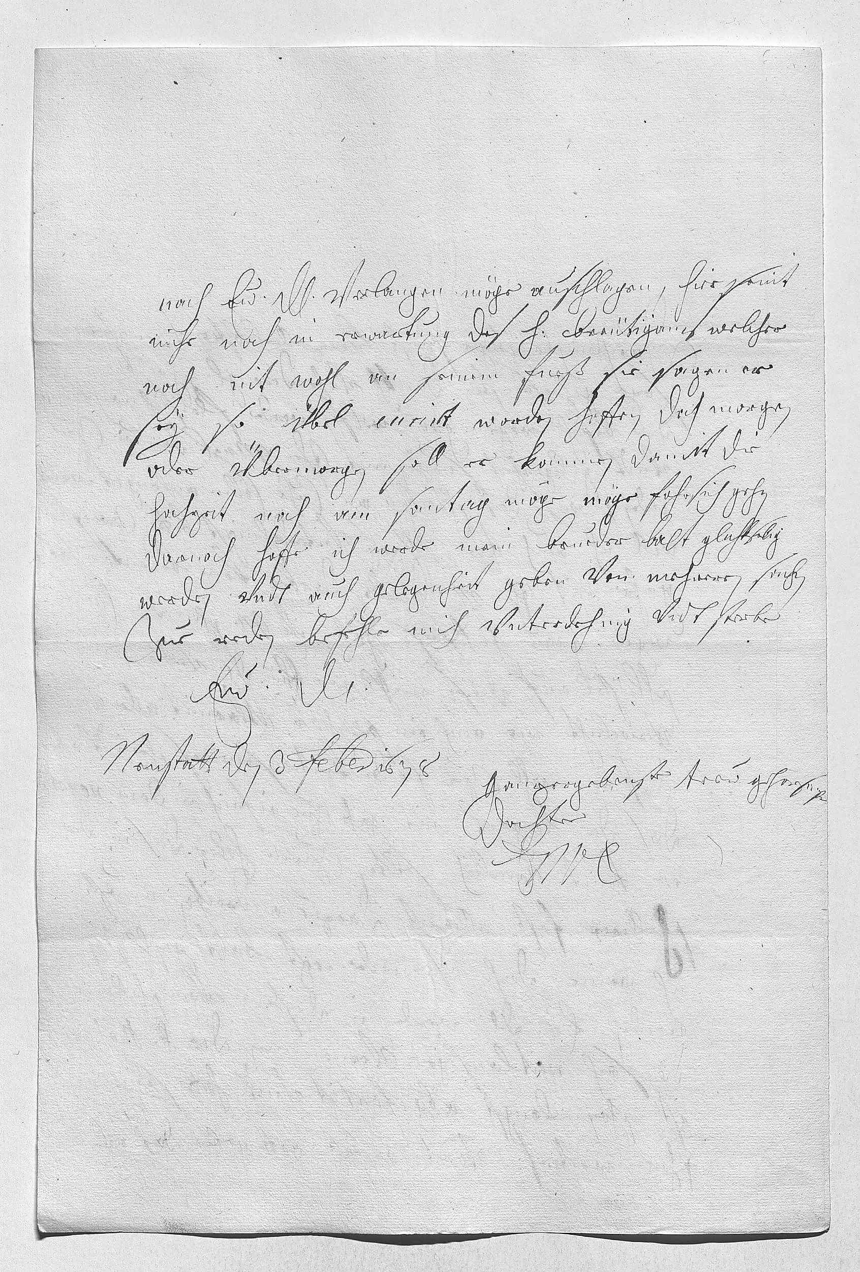 0020nach ewer Durchlaucht verlangen möge auschlagen. Hier seint 0021mihr noch in erwartung des herrn breütigams, welcher 0022noch nit wohl an seinem fueß. Sie sagen, er 0023sey so übel curirt worden, hoffen doch, morgen 0024oder übermorgen soll er kommen, damit die 0025hochzeit noch am sontag möge möge fohrsich gehn. 0026Darnach, hoffe ich, werde mein brueder balt gluhkselig 0027werden vndt auch gelegenheit geben, von mehreren sachen 0028zue reden, befehle mich vnterdehnig vndt sterbe 0029ewer Durchlaucht 0030ganzergebenste trew gehorsamste 0031dochter 0032EMT 0033Neustatt den 3 feber 1678