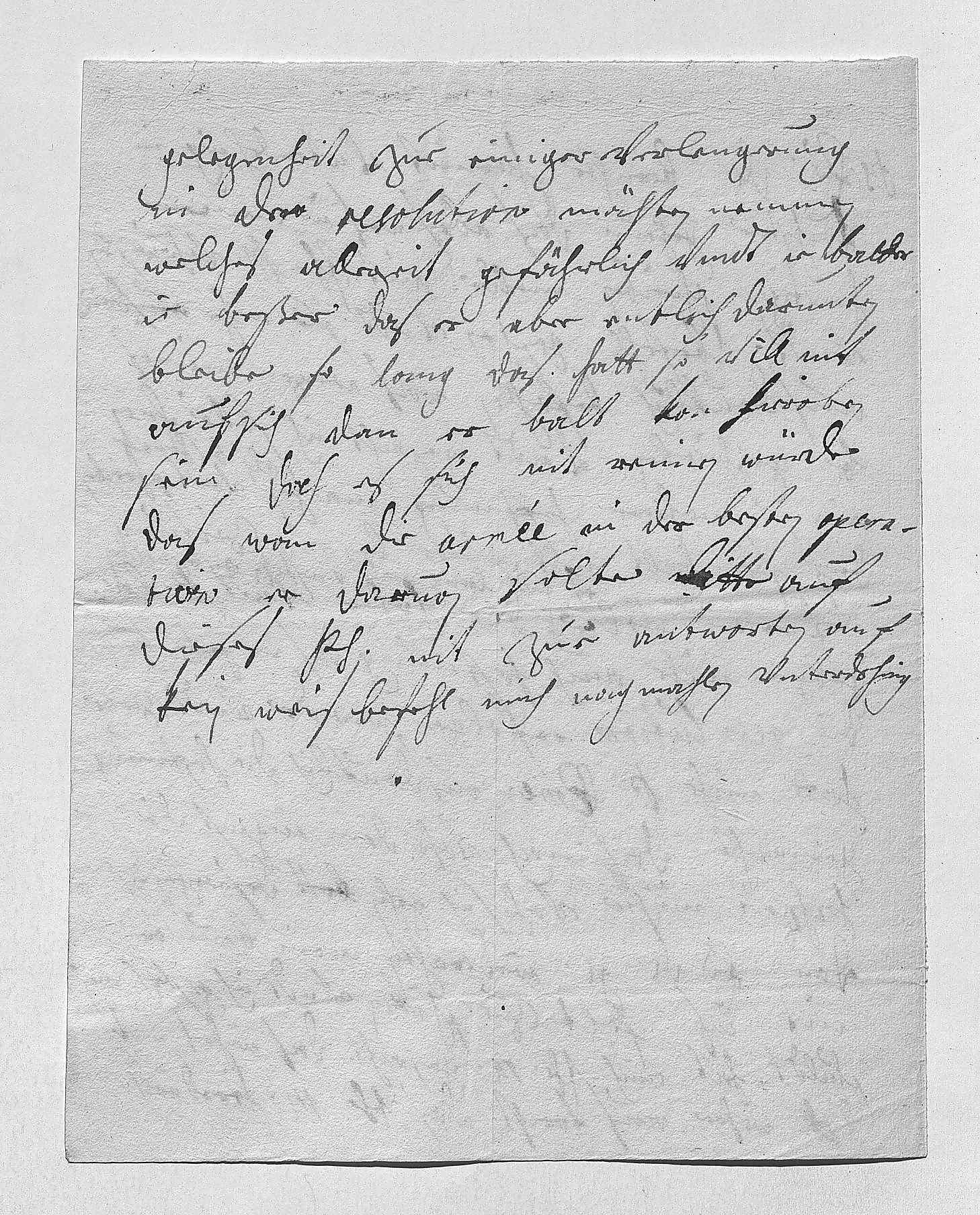 0087gelegenheit zue einiger verlengerung 0088in dero resolution möchten nemmen, 0089welches allezeit gefährlich, vndt ie balder, 0090ie beßer. Das er aber entlich darunten 0091bleibe so lang, das hatt so vill nit 0092aufsich, dan er balt kan hieroben 0093sein, dah es sich nit reimen würde, 0094das, wan die armée in der besten opera- 0095tion, er daruon solte. Bitte auf 0096dieses Postscriptum nit zue antworten, auf 0097kein weis. Befehl mich nochmahlen vnterdehnig.