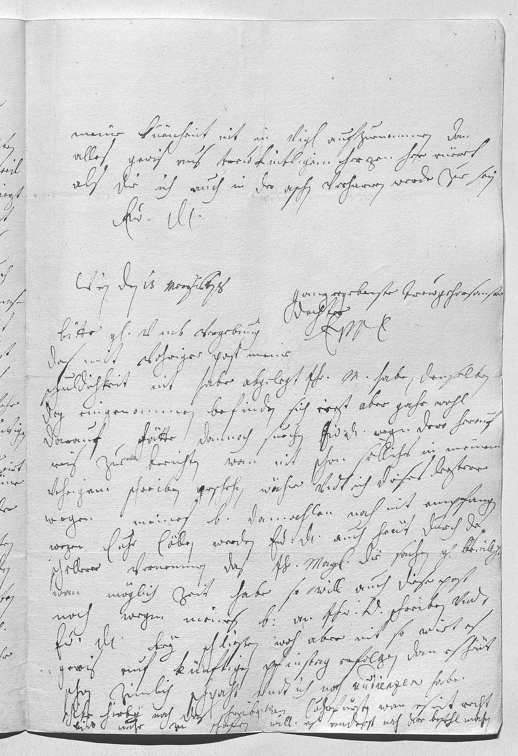 0001Durchleüchtigster Fürst, herz allerliebster herr vatter 0002Drey dero wertesten schreiben habe ich mit hochstem 0003trost empfangen, deren 2 durch die post vndt eins durch 0004den Krenski, dero befehl ich fleisich werde nachkommen 0005vndt ihn ihr Mayestät recomendiren. Was ewer Durchlaucht in dero 0006beyde andere schreiben vom 24 vndt 26 des vohrigen 0007monats vermelden wegen dero vohrhabende reis auf 0008Neüburg, werden selbige schon aus meinem vohrigen 0009schreiben von hier wie auch aus deme, so noch 0010von Neüstatt aus geschrieben, vernommen haben, 0011das nit allein ihr Mayestät, meinem gnädigen Kaiser, 0012nit zuewider, das ewer Durchlaucht diese reis vohrtsezen, 0013sondern sie mihr auch hoffnung gemacht, nachgens 0014balt das glükh vndt trost zue haben, selbige hier 0015persönlich zue bedienen, welches mihr wohl die gröste 0016freüdt von der welt ist vndt ich mit höchstem 0017verlangen der zeit erwarte, das ihr Mayestät 0018selbsten solliches ewer Durchlaucht werden schreiben laßen 0019vndt ich den trost möge haben, dero gegenwart zue 0020genießen. Was aber iezt meinen bruedern angeht,
