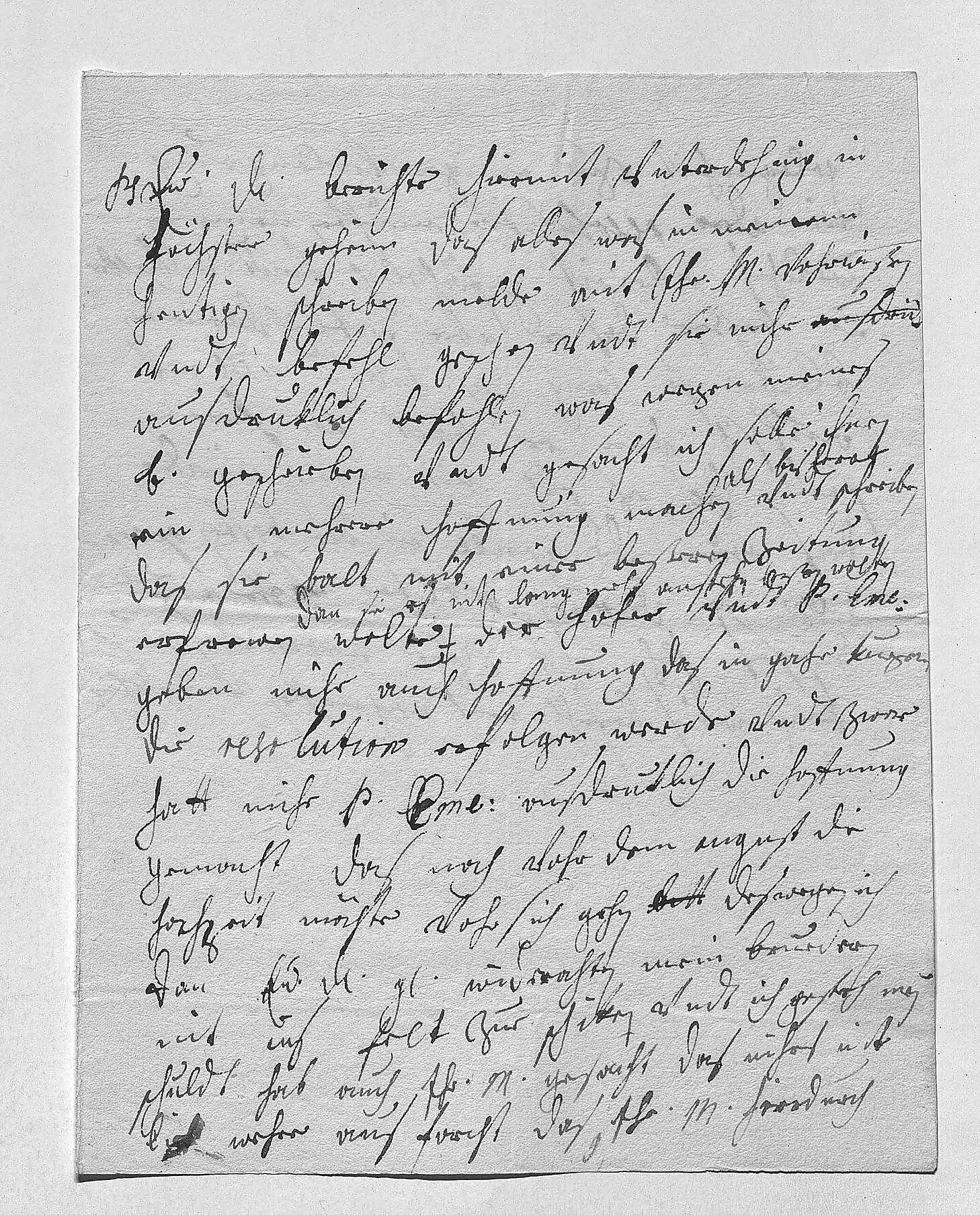 0069Postscriptum Ewer Durchlaucht berichte hiermit vnterdehnig in 0070höchster geheim, das alles, was in meinem 0071heutigen schreiben melde, mit ihr Mayestät vohrwißen 0072vndt befehl geschen vndt sie mihr ausdrük 0073ausdruklich befohlen, was wegen meines 0074bruedern geschrieben vndt gesacht, ich solle ihnen 0075ein mehrere hoffnung machen als bis hero vndt schreiben, 0076das sie balt mit einer beßeren zeitung 0077erfrewen welte, dan sie es nit lang mehr anstehn laßen wolten. Der Hoher vndt Pater Emerik 0078geben mihr auch hoffnung, das in gahr kurzem 0079die resolution erfolgen werde, vndt zwar 0080hatt mihr Pater Emerik ausdruklich die hoffnung 0081gemacht, das noch vohr dem august die 0082hochzeit möchte vohr sich gehn, bitt deswegen ich 0083dan ewer Durchlaucht widerahten, mein bruedern 0084nit ins felt zue schiken. Vndt ich gesteh mein 0085schuldt, hab auch ihr Mayestät gesacht, das mihrs nit 0086lieb wehre, aus forcht, das ihr Mayestät hierdurch