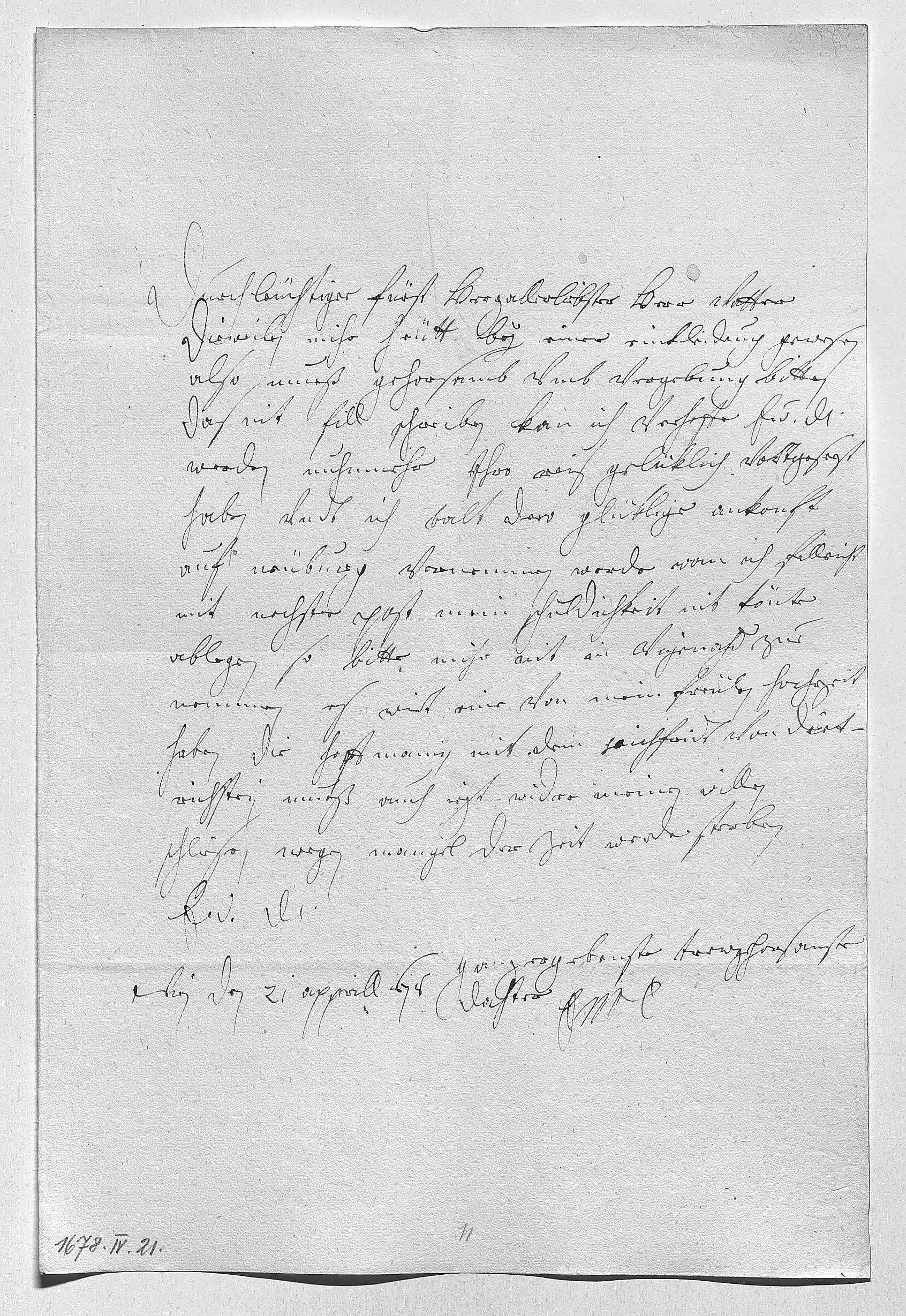 0001Durchleüchtiger Fürst, herzallerliebster herr vatter 0002Dieweilen mihr heütt bey einer einkleidung gewesen, 0003also mueß gehorsamb vmb vergebung bitten, 0004das nit fill schreiben kan. Ich verhoffe, ewer Durchlaucht 0005werden nuhnmehr ihro reis gelüklich vortgesezt 0006haben vndt dass ich balt dero glüklige ankonft 0007auf Neüburg vernemmen werde. Wan ich filleicht 0008mit nechster post mein schuldichkeit nit könte 0009ablegen, so bitte mihr nit in vngenahd zue 0010nemmen. Es wirt eine von mein freülen hochzeit 0011haben, die Hoffmanin, mit dem Seichfridt von Diet- 0012richstein . Mueß auch iezt wider meinen willen 0013schliesen wegen mangel der zeit. Werde sterben 0014ewer Durchlaucht 0015ganzergebenste trewgehorsamste 0016dochter 0017EMT 0018Wien den 21 apprill 1678