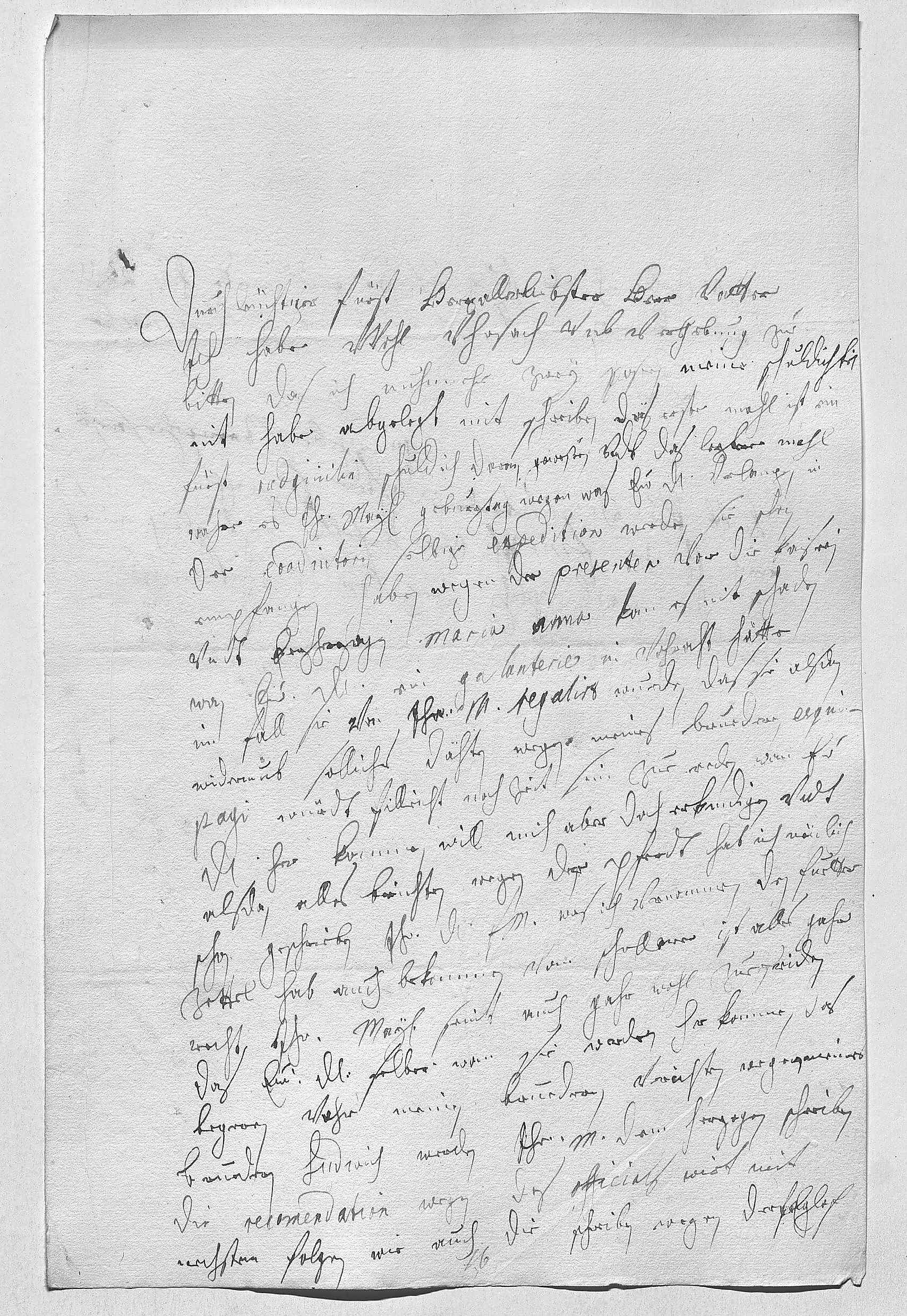 0001Durchleüchtiger Fürst, herzallerliebster herr vatter 0002Ich habe wohl vhrsach, vmb vergebung zu 0003bitten, das ich nuhnmehr zwey posten meine schuldichkeit 0004nit habe abgelegt mit schreiben. Das erste mahl ist ein 0005Fürst Radgiuilin schuldich daran gewesen, vndt das leztere mahl 0006wahre es ihr Mayestät geburztag. Wegen was ewer Durchlaucht verlangen in 0007der coadiutori, selbige expedition werden sie schon 0008empfangen haben. Wegen der presenten vor die Kaiserin 0009vndt Erzherzogin Maria Anna kan es nit schaden, 0010wan ewer Durchlaucht ein galanterie in vohraht hätte, 0011im fall sie von ihr Mayestät regalirt wurden, das sie alsdan 0012widerumb sollichs dähten. Wegen meines bruedern esqui- 0013pagi würdt filleicht noch zeit sein zue reden, wan ewer 0014Durchlaucht her kommen, will mich aber doch erkundigen vndt 0015alsdan alles berichten. Wegen der pferdt hab ich neülich 0016schon geschrieben ihr Durchlaucht fraw mutter, was ich vernommen. Den fuetter 0017zettel hab auch bekommen. Vom Schellerer ist alles gahr 0018recht, ihr Mayestät seint auch gahr wohl zuefriden, 0019das ewer Durchlaucht selber, wan sie werden her kommen, das 0020begern vohr meinen bruedern verichten. Wegen meines 0021bruedern Ludwich werden ihr Mayestät dem Herzogen schreiben, 0022die recomendation wegen des officials wirt mit 0023nechstem folgen, wie auch die schreiben wegen der Eglof .
