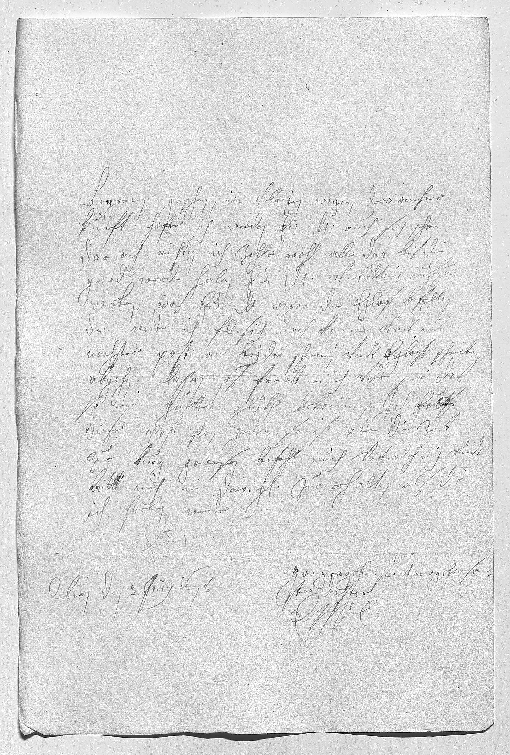 0001Durchleüchtiger Fürst, herz allerliebster herr vatter 0002Ich verhoffe, ewer Durchlaucht werden nuhnmehr auf 0003alles dasienige, was sie verlangen zue wißen, 0004schon durch mein schreiben vernommen haben 0005vndt zuegleich meine entschuldigungen, warumb 0006ich nit ender mit meinem gehorsamsten schreiben 0007aufgewart. Ich gesteh, das keine vergebung verdien, 0008hoffe aber alzuesehr auf ewer Durchlaucht große gütte. 0009Ich habe auch vermeint, die post gienge 0010nuhr einmahl in der wochen wie allezeit 0011auf Neüburg, es hatt mihr aber der Schellerer 0012sagen laßen, das ewer Durchlaucht anstalt gemacht, 0013das zweymahl geht. Als werde mich schon 0014fleisiger mit meiner schuldichkeit einstellen. 0015Was meinen bruder anlanget, werden ewer Durchlaucht 0016aus meinem vohrigen schreiben alles ersehn haben. 0017Wie vndt wan ist noch nit resoluirt, vndt 0018halt ich auch nit dafür, das es werde werden, bis 0019die andren sachen richtig vndt das offentlige