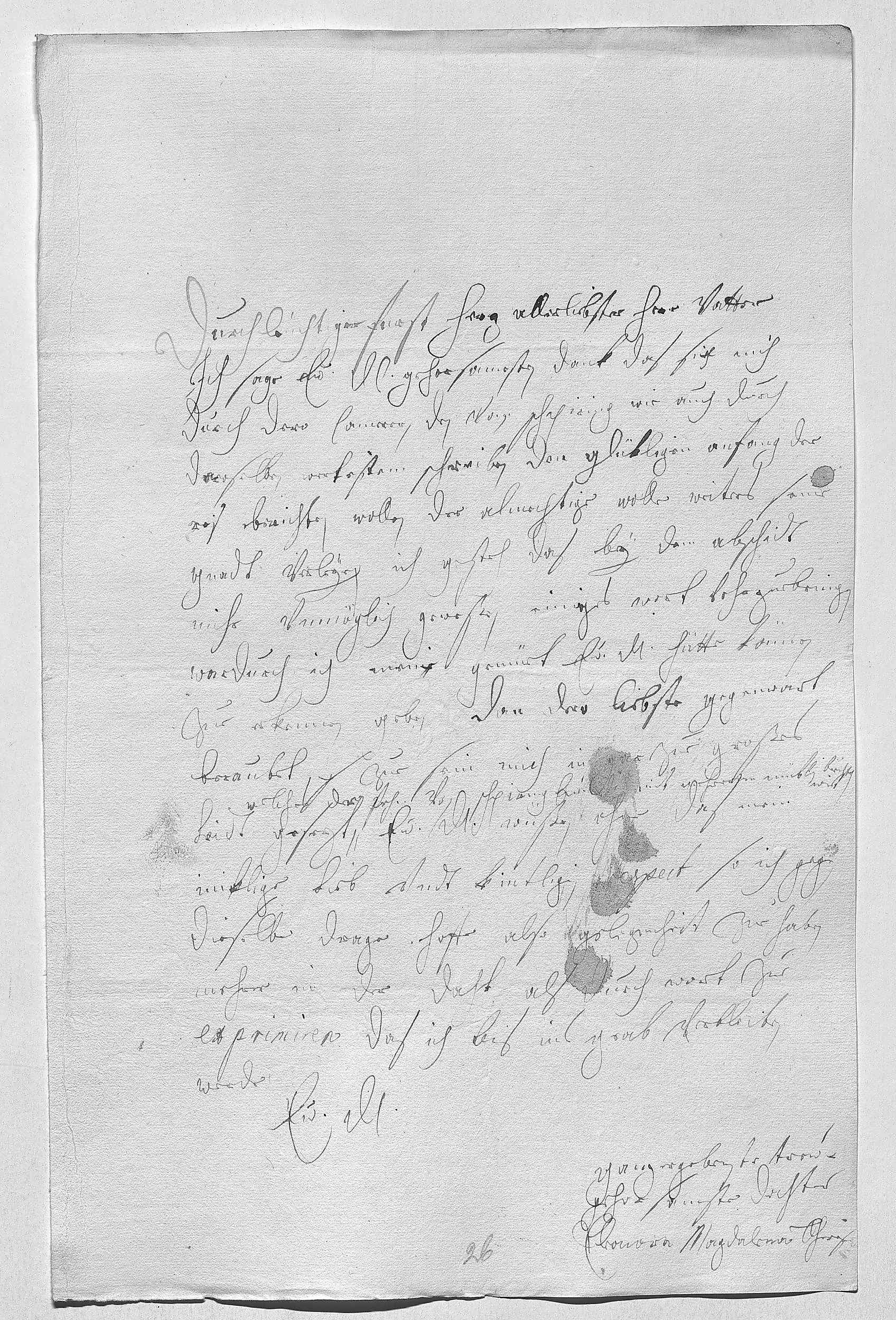 0001Durchleüchtiger Fürst, herz allerliebster herr vatter 0002Ich sage ewer Durchlaucht gehorsamsten dank, das sie mich 0003durch dero camerern, den von Schpiring, wie auch durch 0004deroselben wertestem schreiben von den glükligen anfang der 0005reis berichten wollen, der almechtige wolle weiters seine 0006gnadt verleyen. Ich gesteh, das bey dem abschidt 0007mihr vnmöglich geweßen, einiges wort vohrzuebringen, 0008wardurch ich meine gemüet ewer Durchlaucht hätte können 0009zue erkennen geben, dan dero liebste gegenwart 0010beraubet s zue sein, mich in gar zue großes 0011leidt gesetzt, welches der Freiherr von Schpiring ewer Durchlaucht mit mehrerem müntlich berichten wirt. Ewer Durchlaucht wüßen ohne das mein 0012iniklige lieb vndt kintligen respect, so ich gegen 0013dieselbe drage. Hoffe also gelegenheit zue haben, 0014mehrer in der daht als durch wort zue 0015exprimiren, das ich bis ins grab verbleiben 0016werde 0017ewer Durchlaucht 0018ganz ergebenste trew- 0019gehorsamste dochter 0020Eleonora Magdalena Theresia