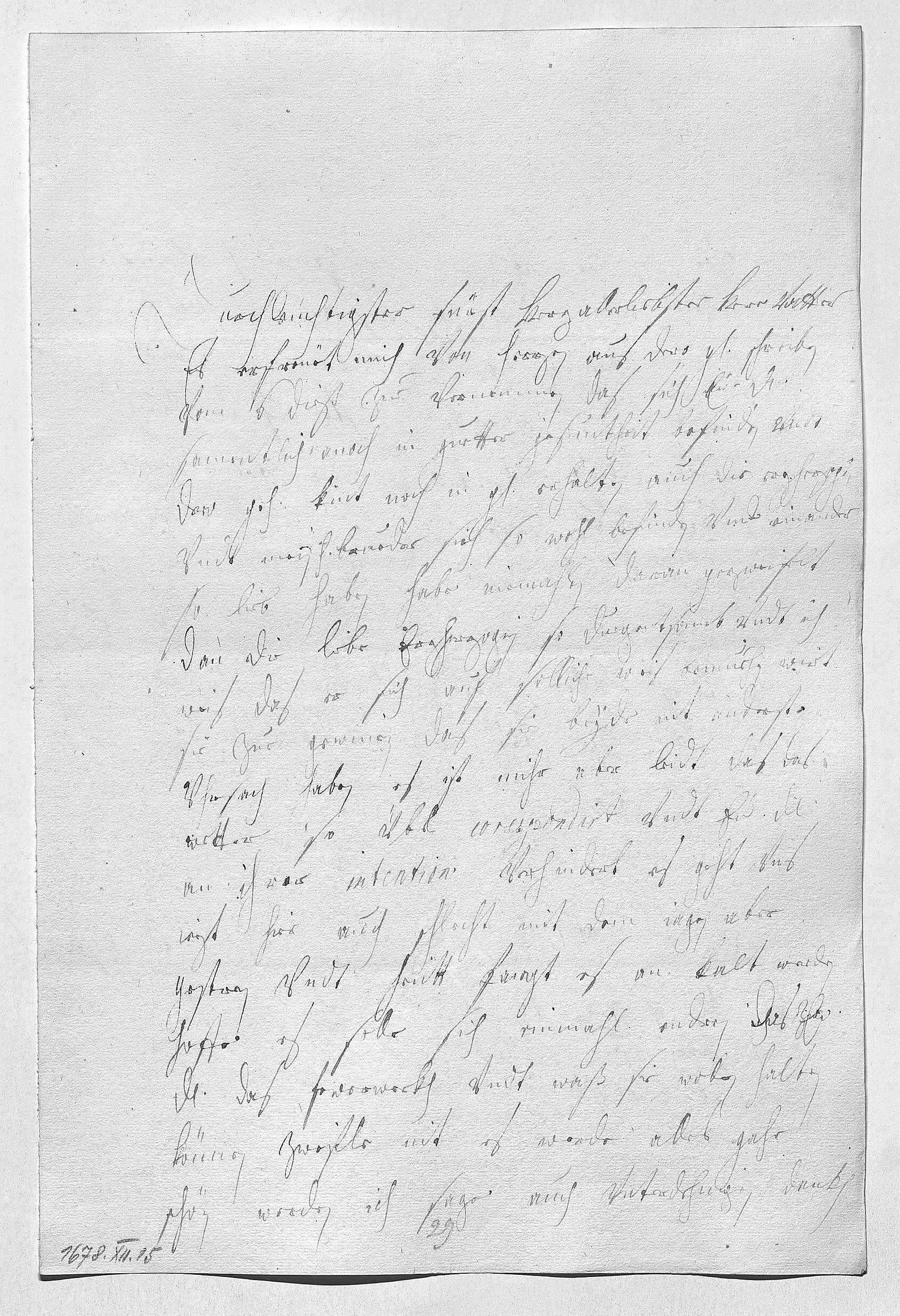 0020vor den wein, ewer Durchlaucht überhaüfen mich allzeit 0021mehrer mit dero gnade, das ich nit worte 0022genuech finden kan, genuechsammen dankh 0023daruohr zue erstatten. Wünste nuhr, das durch 0024meine dienst ich ewer Durchlaucht mein trewe deuotion 0025kunte zue erkennen geben. Berichte gehorsamst, 0026das sunst alle noch wohl auf. Der kleine fangt 0027schon an, ihm wagen herummer zue vahren 0028vndt ist aller lustig. Ich due mich hiermit 0029in ewer Durchlaucht beharlige gnade gehorsamist empfelen, 0030die ich sterben werde 0031ewer Durchlaucht 0032ganz ergebenste trewgehorsamste 0033dochter 0034EMT 0035Wien den 15 decembris 16780036Ewer Durchlaucht berichte, das der Cuhrprinz 0037aus Saxen gestren anhero kommen, 0038will all incognito sein, wirt morgen audienz haben.