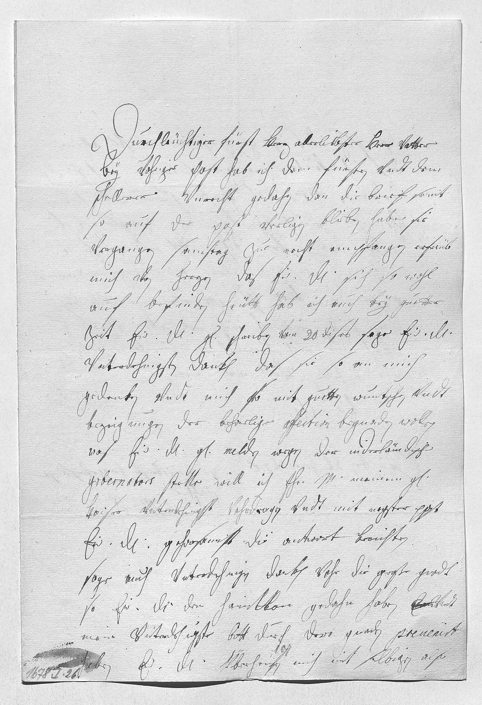 0001Durchleüchtiger Fürst, herz allerliebster herr vatter 0002Bey vohriger post hab ich dem Fürsten vndt dem 0003Schellerer vnrecht gedahn, dan die brief seint 0004so auf der post verligen blieben, habe sie 0005vergangen samstag zue recht empfangen. Erfreüt 0006mich von herzen, das ewer Durchlaucht sich so wohl 0007auf befinden. Heütt hab ich auch bey guetter 0008zeit ewer Durchlaucht schreiben vom 20 dises erhalten, sage euer Durchlaucht 0009vnterdehnigsten dankh, das sie so an mich 0010gedenken vndt mich so mit guetten wuntschen vndt 0011bezeigungen der beharlige affection begnaden wollen. 0012Was ewer Durchlaucht gnädigst melden wegen der niderländischen 0013gobernators stelle will ich ihr Mayestät, meinem gnädigsten 0014Kaiser, vnterdehnigst vohrdragen vndt mit negster post 0015ewer Durchlaucht gehorsamist die antwort berichten. 0016Sage auch vnterdehnigen dankh vohr die große gnadt, 0017so ewer Durchlaucht dem Hamilton gedahn haben ewer vndt 0018meine vnterdehnigste bitt durch dero gnaden preuenirt 0019haben. Ewer Durchlaucht überheufen mich mit selbiger also
