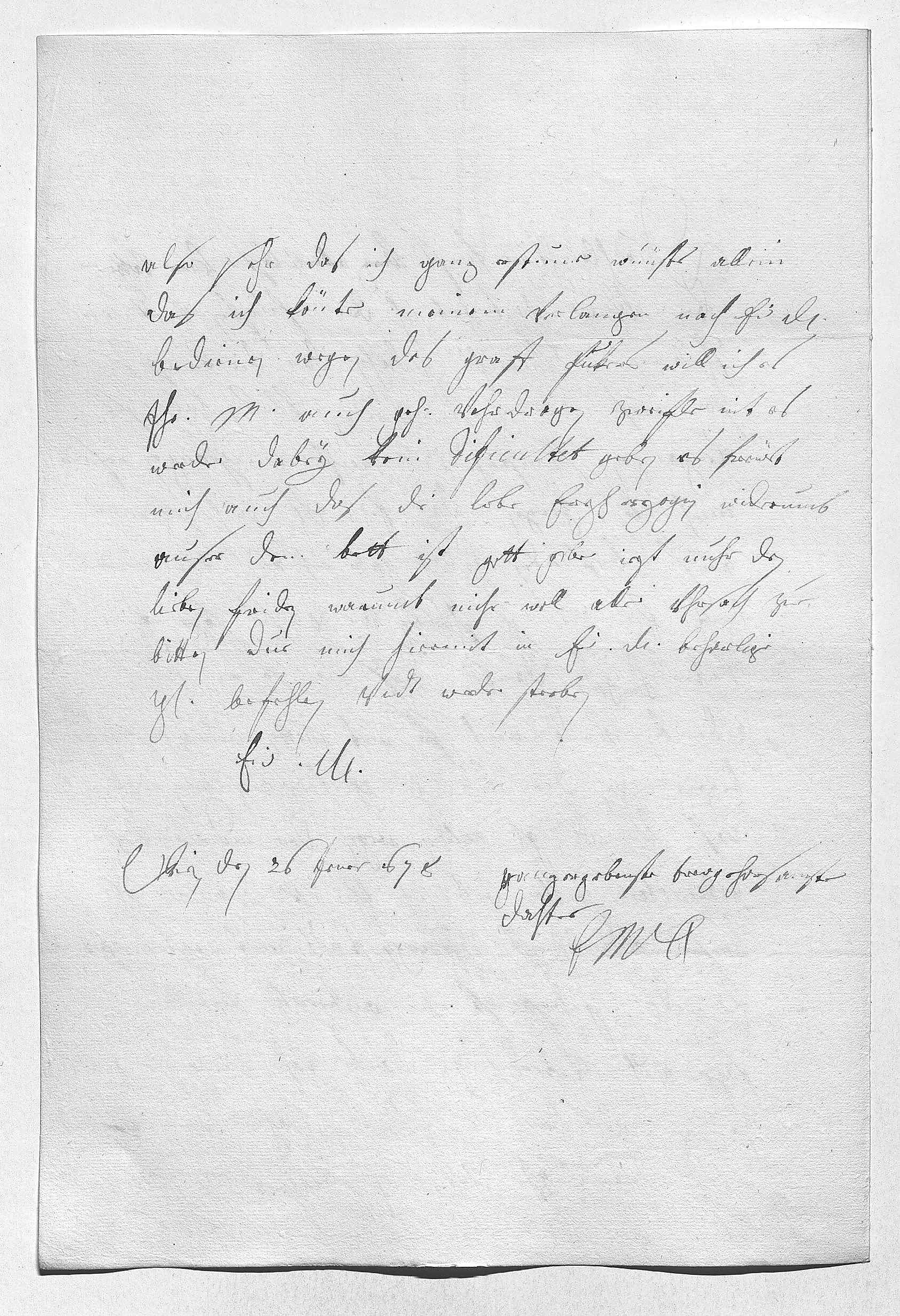 0020also sehr, das ich ganz erstume. Wünste allein, 0021das ich könte meinem verlangen nach ewer Durchlaucht 0022bedienen. Wegen des Graff Fukers will ich es 0023ihr Mayestät auch gehorsamst vohrdragen, zweifle nit, es 0024werde dabey kein dificultet geben. Es freüet 0025mich auch, das die liebe Erzherzogin widerumb 0026auser dem bett ist, gott gebe iezt nuhr den 0027lieben friden, warumb mihr woll alle vhrsach zue 0028bitten. Due mich hiermit in ewer Durchlaucht beharlige 0029gnade befehlen vndt werde sterben 0030ewer Durchlaucht 0031ganzergebenste trewgehorsamste 0032dochter 0033EMT 0034Wien den 126 jener 1678