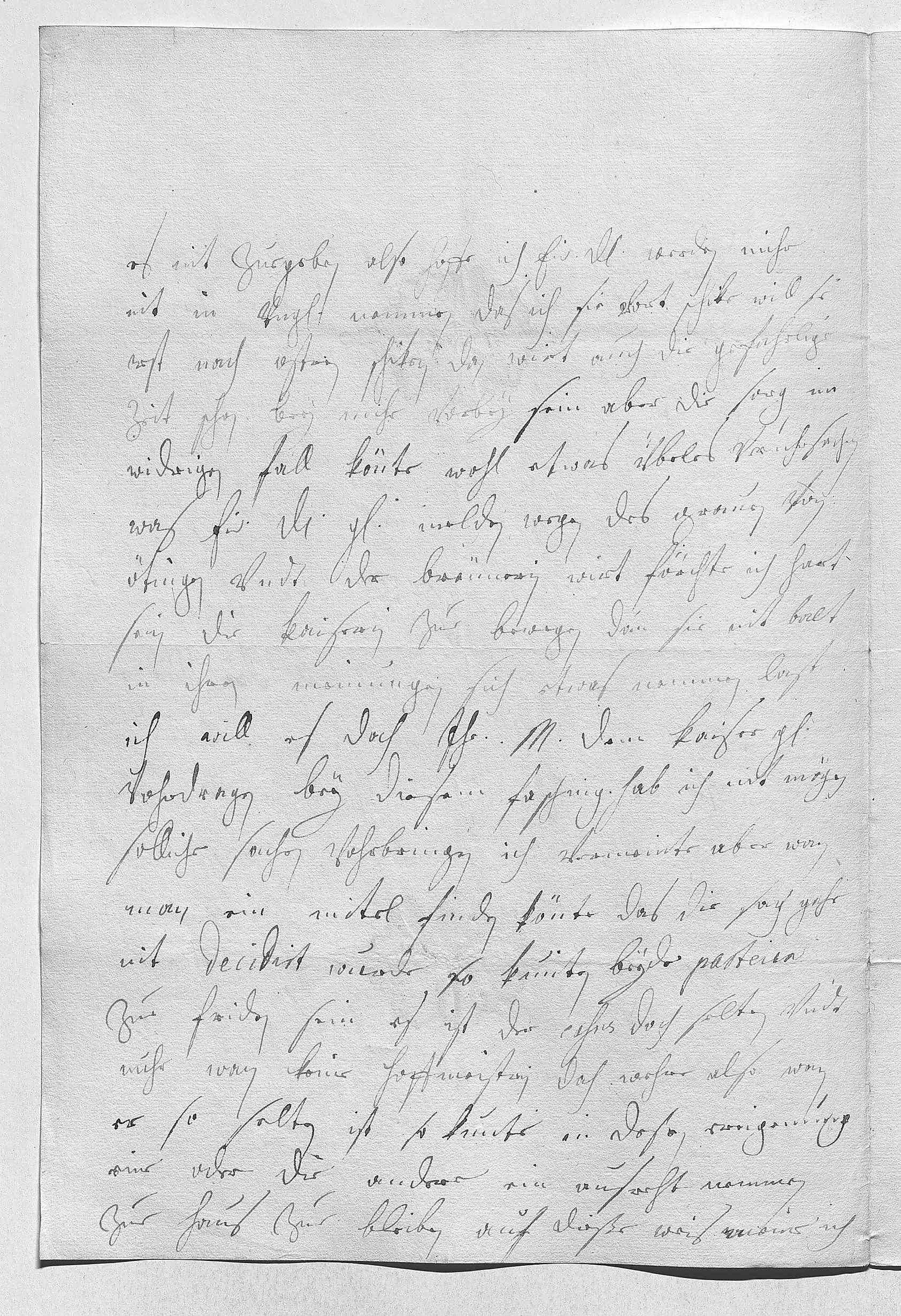 0001Durchleüchtiger Fürst, herzallerliebster herr vatter 0002Beyde dero gnädige schreiben vom 3 vndt 10 dießes habe 0003ich mit großen freüden empfangen, die weilen daraus 0004ewer Durchlaucht erwünsten wohlstant vnd die continuation 0005dero gnade gegen mich ersehn. Ewer Durchlaucht seint gahr 0006zue sorgfältig fohr mich, das sie mihr nit 0007erlauben wollen, die Marta vndt den Doctor 0008hinauf zue schiken. Bitte aber nochmahlen vnterdehnig, 0009mihr dießes nit zue befehlen, dan die große 0010angst vnd sorge, in deren ich leben wurde, 0011mihr gewißlich mehrer schaden wurde vndt ehnder 0012etwas übels veruhrsachen könte, als wan ewer 0013Durchlaucht mihr soliches erlauben wurden, so lebete 0014ich in rue vndt würdt mihr mit gottes hülf 0015niks geschehn. Wan auch etwas geschen solte, so 0016bin ich schon wohl versichert, das die hiesigen 0017doktor mihr nit wurden zur ader laßen, 0018vndt wan sie gleich wolten, ihr Mayestät der Kaiser
