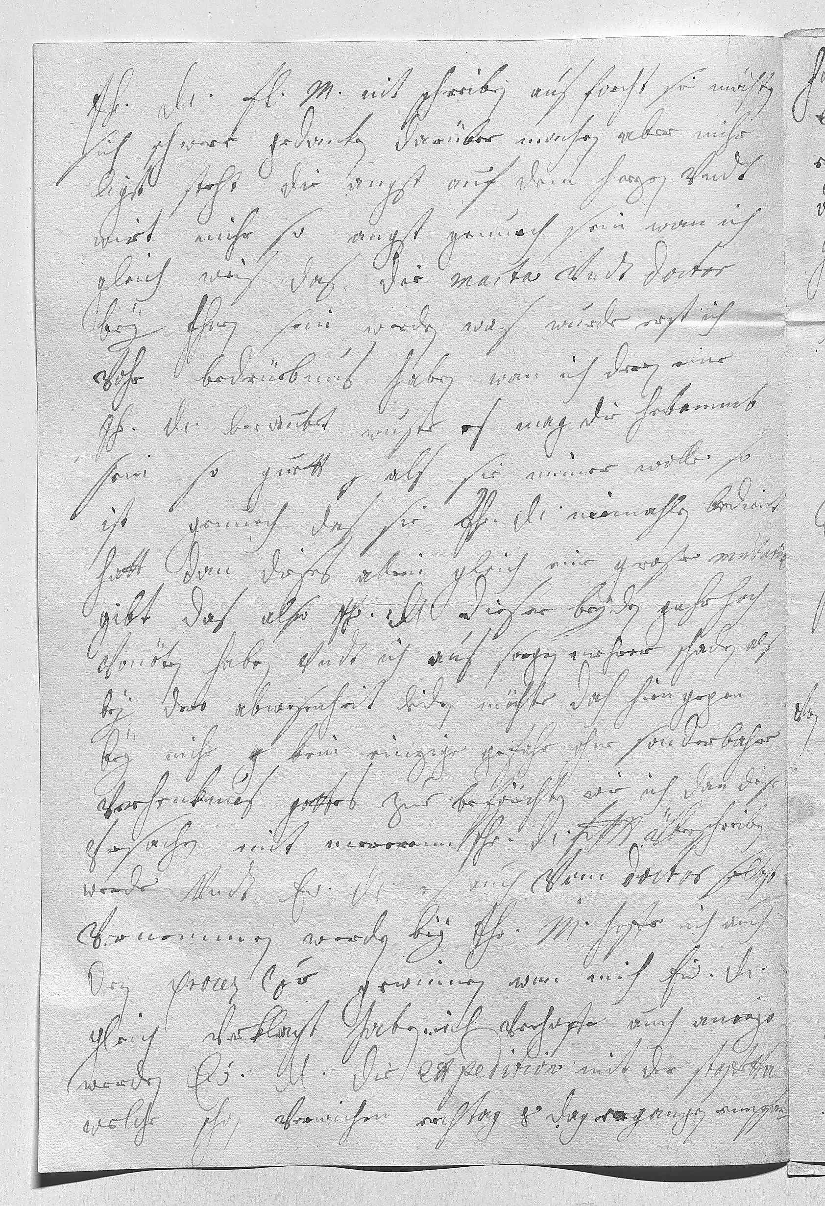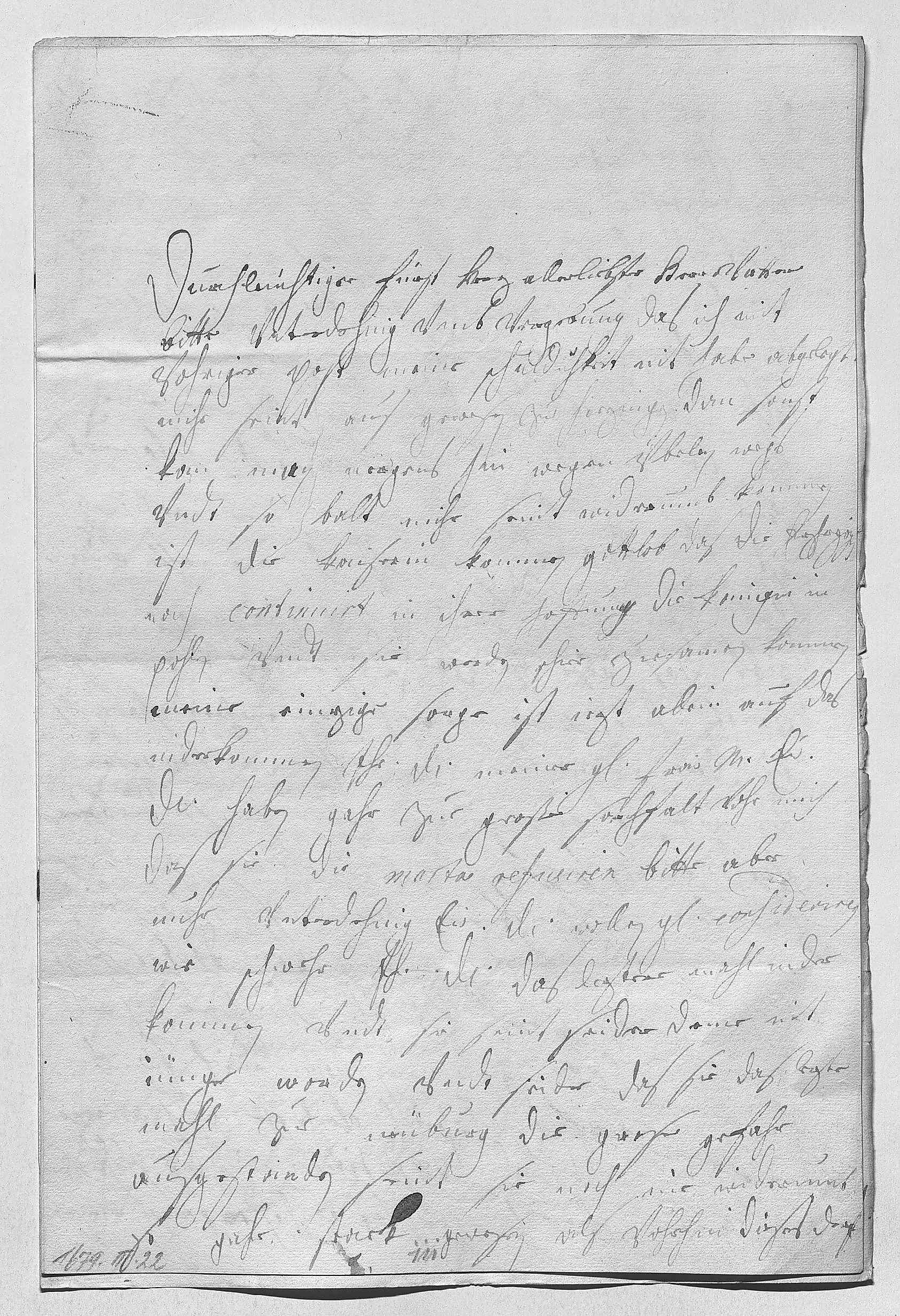 0021ihr Durchlaucht fraw mutter nit schreiben aus forcht, sie möchten 0022sich schwere gedanken darüber machen, aber mihr 0023liget steht die angst auf dem herzen vndt 0024wirt mihr so angst genuech sein, wan ich 0025gleich weis, das die Marta vndt Doctor 0026bey ihnen sein werden. Was wurde erst ich 0027vohr bedrüebnus haben, wan ich deren eine 0028ihr Durchlaucht beraubet wuste. Es mag die hebammb 0029sein, so guett als sie immer wolle, so 0030ist genuech, das sie ihr Durchlaucht niemahlen bedient 0031hatt, dan dieses allein gleich eine große mutation 0032gibt, das also ihr Durchlaucht dieser beyden gahr hoch 0033vonöten haben, vnd ich aus sorgen mehrer schaden als 0034bey dero abwesenheit leiden möchte, dah hien gegen 0035bey mihr g kein einzige gefahr ohne sonderbahre 0036verhenknues gottes zue beförchten, wie ich dan diese 0037vrsachen mit mererem ihr Durchlaucht fraw mutter überschreiben, 0038werde vndt ewer Durchlaucht es auch vom Doctor selbst 0039vernemmen werden. Bey ihr Mayestät hoffe ich auch, 0040den proces zue gewinnen, wan mich ewer Durchlaucht 0041gleich verklagt haben. Ich verhoffe auch, aniezo 0042werden ewer Durchlaucht die expedition mit der staffetta, 0043welche schon verwichen erchtag 8 dag ergangen, empfangen