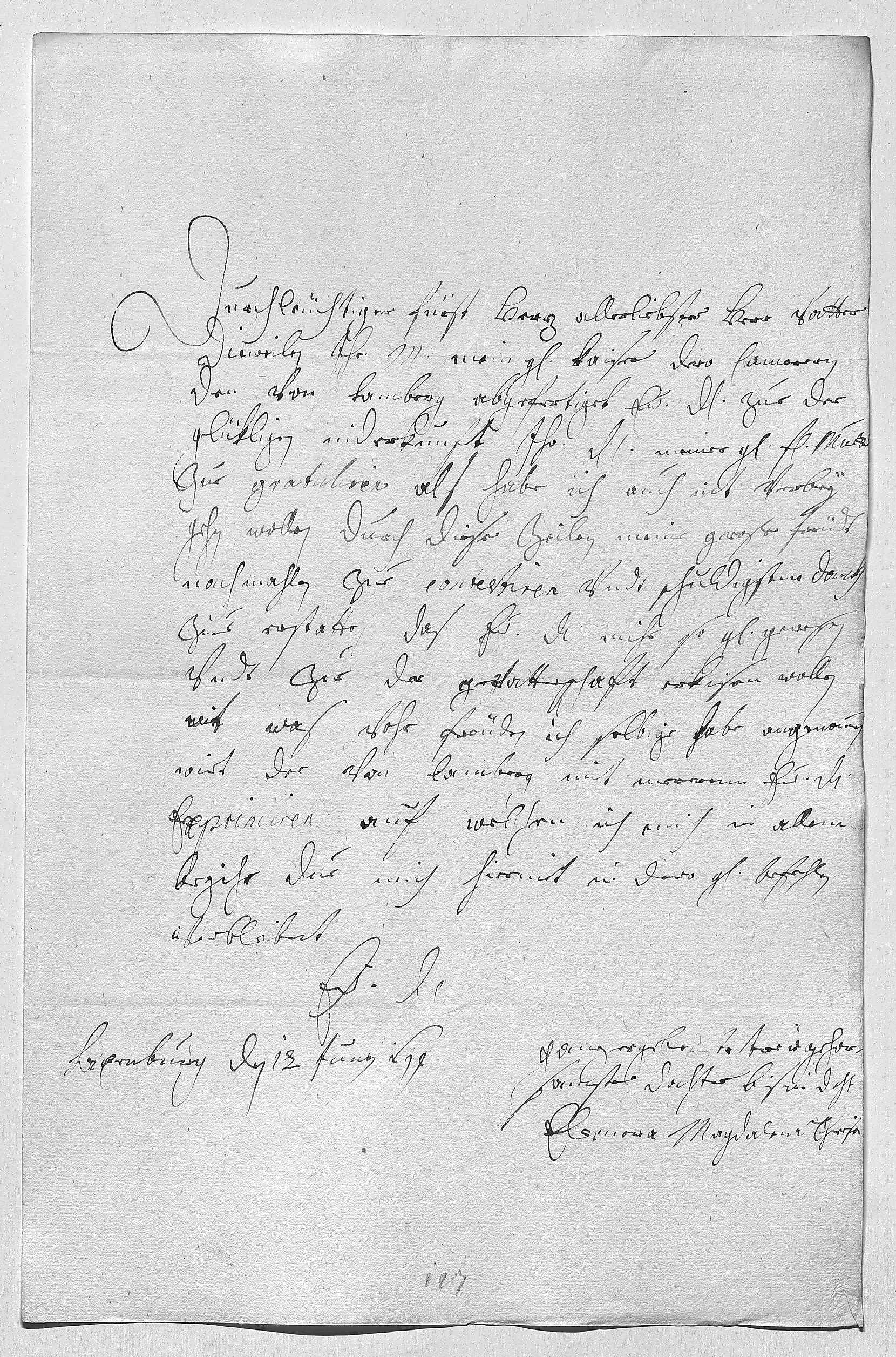 0001Durchleüchtiger Fürst herz allerliebster herr vatter 0002Dieweilen ihr Mayestät, mein gnädigster Kaiser, dero camerern, 0003den von Lamberg, abgefertiget, ewer Durchlaucht zue der 0004glükligen niderkunft ihr Durchlaucht, meiner geliebsten fraw muetter, 0005zue gratuliren, als habe ich auch nit verbey 0006gehn wollen, durch diese zeilen meine große freüdt 0007nachmahlen zue contestiren vndt schuldigsten dankh 0008zue erstatten, das ewer Durchlaucht mihr so gnädig gewesen 0009vndt zue der gevatterschaft erkiesen wollen. 0010Mit was vohr freüden ich selbige habe angenommen, 0011wirt der von Lamberg mit mererem ewer Durchlaucht 0012exprimiren, auf welchen ich mich in allem 0013bezihe. Due mich hiermit in dero gnade befehlen 0014verbleibent 0015ewer Durchlaucht 0016ganzergebenste trewgehor- 0017samste dochter bis in doht 0018Eleonora Magdalena Theresia 0019Laxenburg den 12 junij 1679