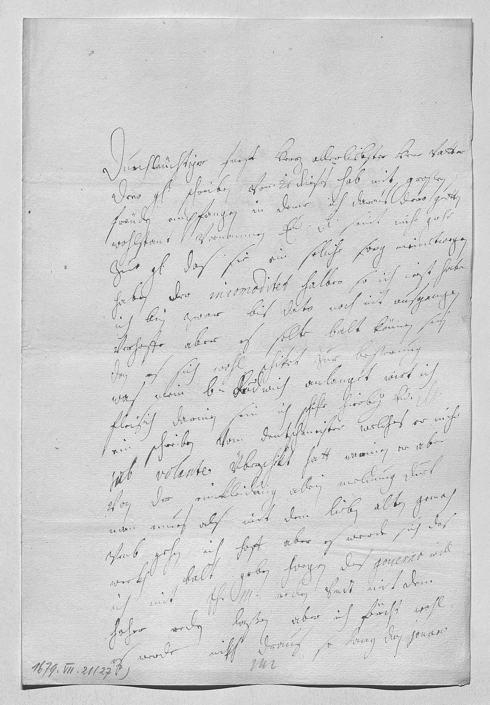 0001Durchleüchtiger Fürst, herz allerliebster herr vatter 0002Dero gnädigstes schreiben vom 21 dieses habe mit großen 0003freüden empfangen, in deme ich daraus dero gutten 0004wohlstant vernommen. Ewer Durchlaucht seint mihr gahr 0005zue gnädig, das sie ein soliche sorg meinetwegen 0006haben der incomoditet halber, so ich iezt habe. 0007Ich bin zwar bis dato noch nit ausgangen, 0008verhoffe aber, es solte balt können sein, 0009dan es sich wohl schiket zur beßerung. 0010Was mein bruder Ludwich anbelanget, wirt ich 0011fleisich darinen sein. Ich schike hierbey ewer Durchlaucht 0012ein schreiben vom Deutschmeister, welches er mihr 0013sub volante übergeschikt hatt, warinen er aber 0014von der einkleidung allein meldung duet. 0015Man mues als mit dem lieben alten gemach 0016vmb gehn, ich hoff aber, es werde sich das 0017werkh balt geben. Wegen des gouerno will 0018ich mit ihr Mayestät reden vndt mit dem 0019Hoher reden laßen, aber ich förcht wohl, 0020es werde niks daraus, so lang Don Jouan