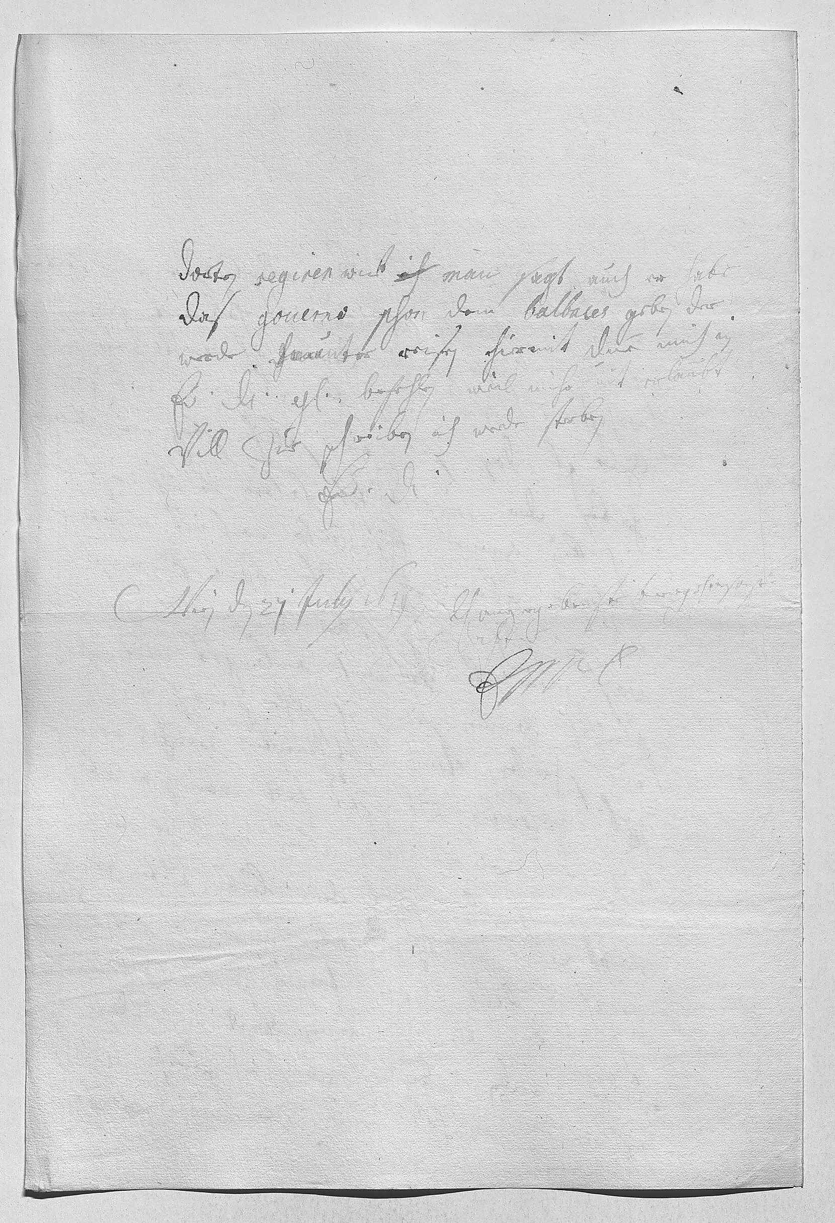 0021dorten regiren wirt. ich Man sagt auch, er habe 0022das gouerno schon dem Balbases geben, der 0023werde herunter reisen. Hirmit due mich in 0024ewer Durchlaucht gnade befehlen, weil mihr nit erlaubt, 0025vill zue schreiben. Ich werde sterben 0026ewer Durchlaucht 0027ganzergebenste trewgehorsamste 0028dochter 0029EMT 0030Wien den 21 julij 1679