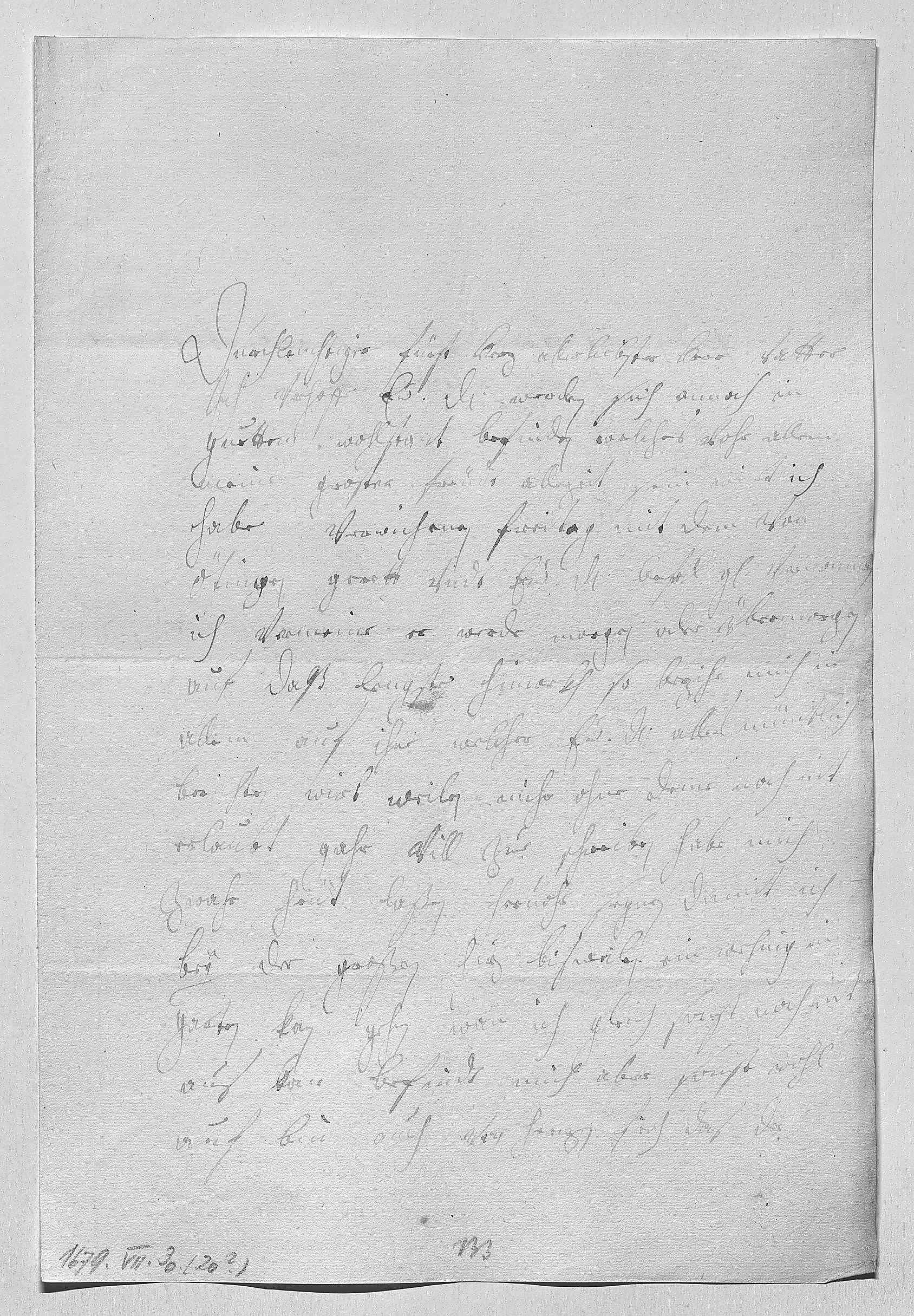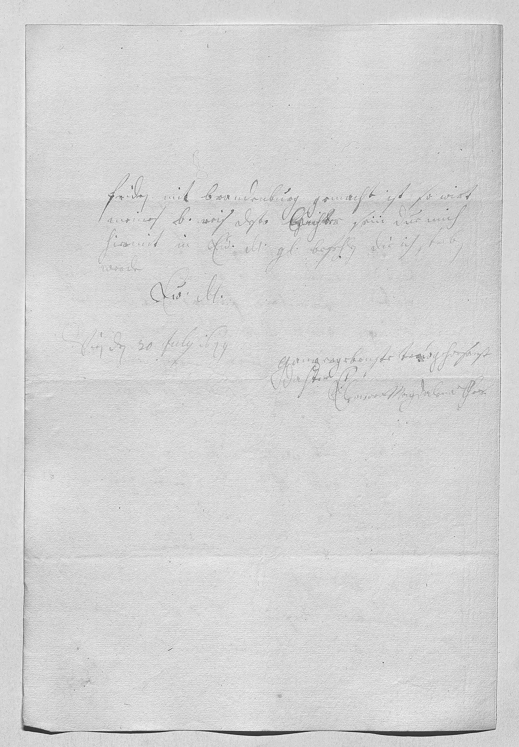 0017friden mit Brandenburg gemacht ist, so wirt 0018meines bruders reis desto ehinder sein. Due mich 0019hiermit in ewer Durchlaucht gnade befehlen, die ich sterben 0020werde 0021ewer Durchlaucht 0022ganz ergebenste trewgehorsamst 0023dochter 0024Eleonora Magdalena Theresia 0025Wien den 20 julij 1679