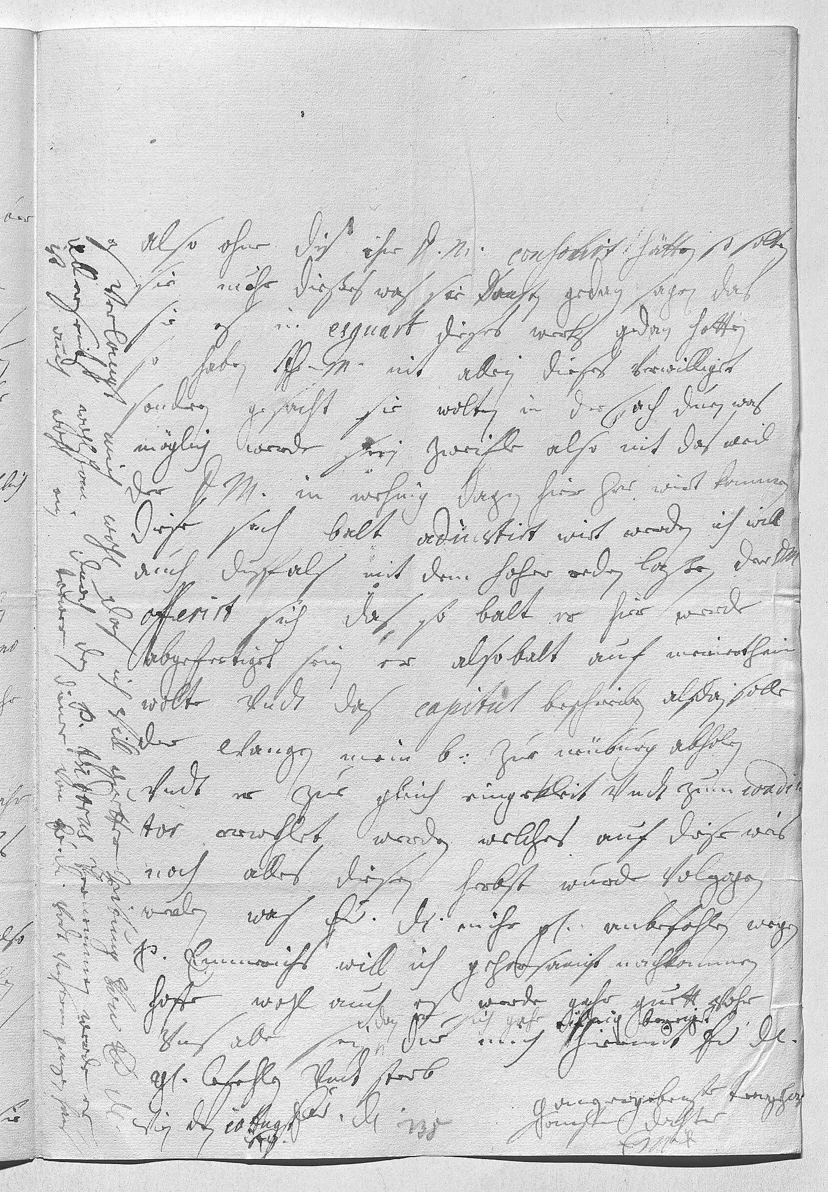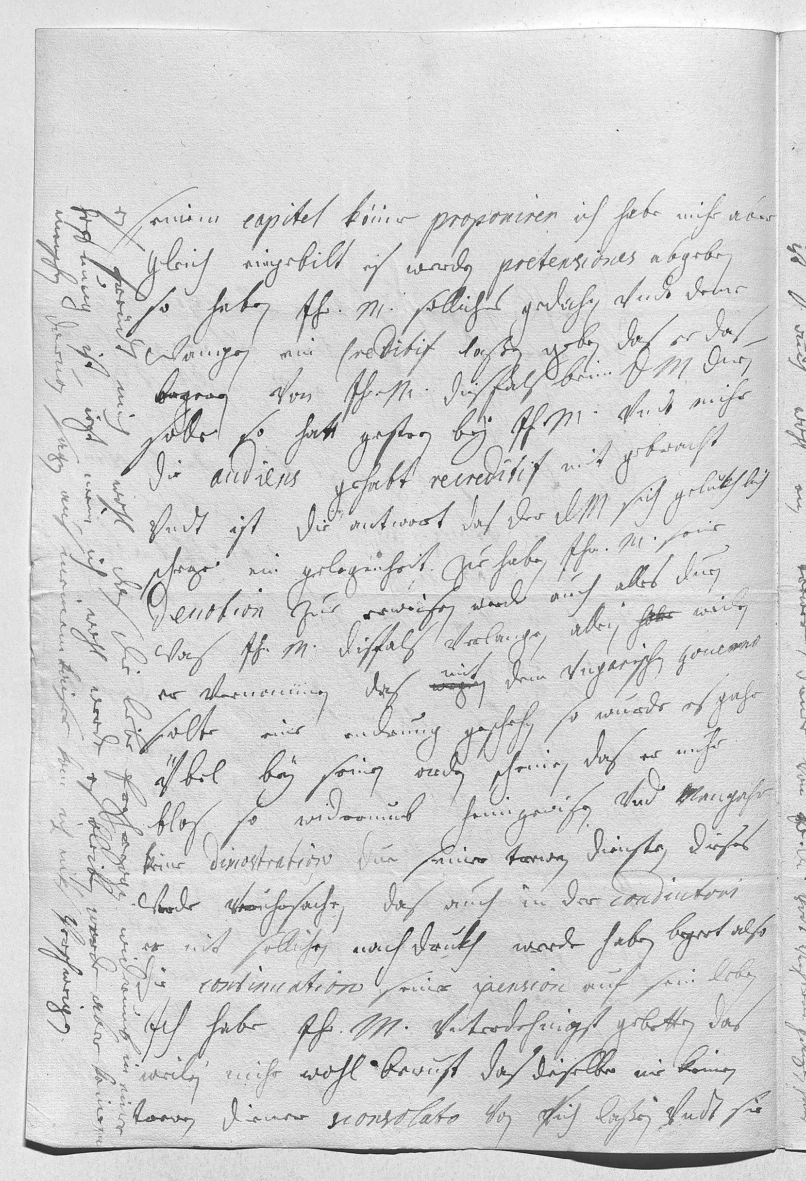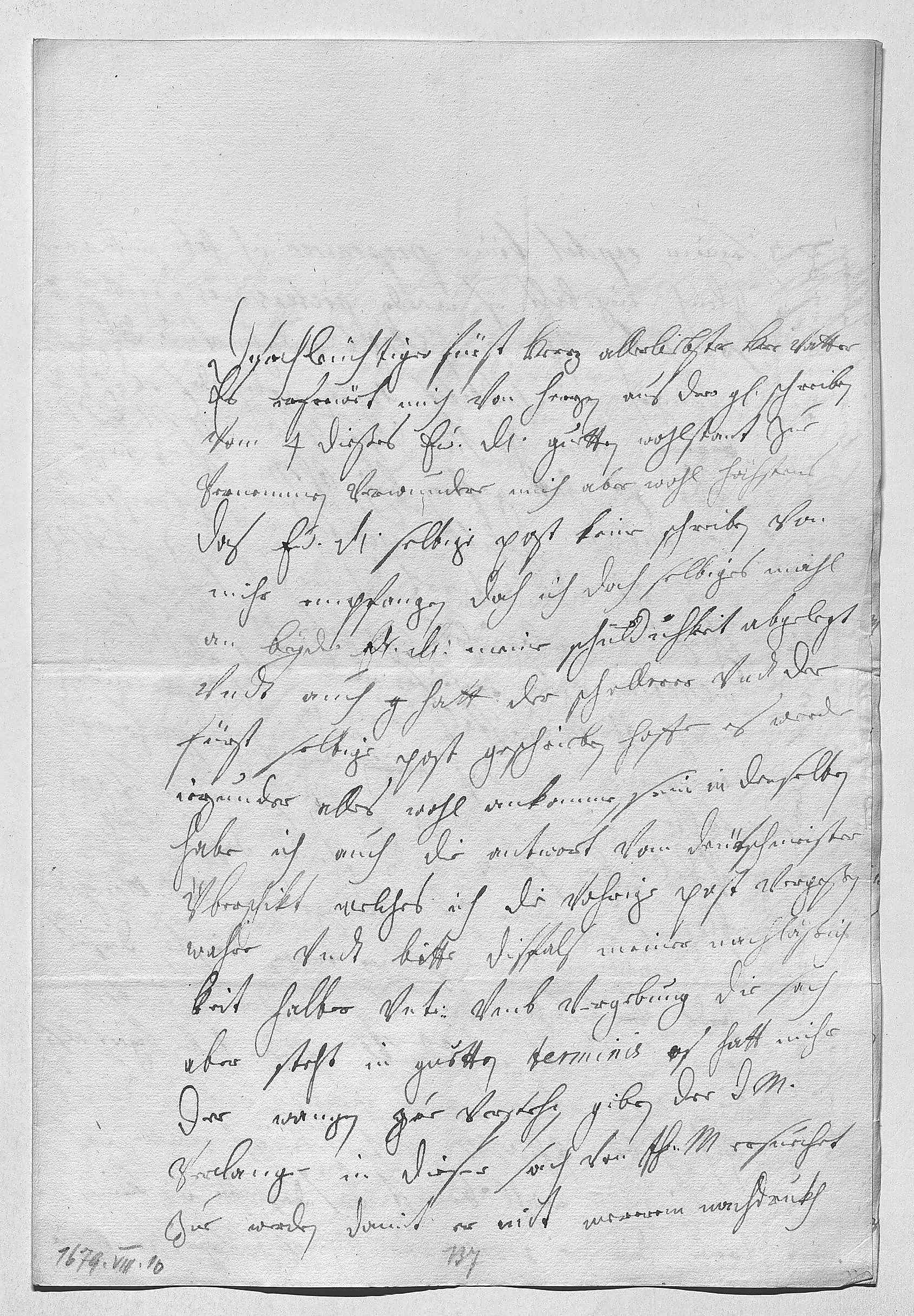 0001Durchleüchtiger Fürst, herz allerliebster herr vatter 0002Es erfrewet mich von herzen, aus dero gnädigstem schreiben 0003vom 4 dießes ewer Durchlaucht gueten wohlstant zue 0004vernemmen. Verwundere mich aber wohl höchstens, 0005das ewer Durchlaucht selbige post keine schreiben von 0006mihr empfangen, dah ich doch selbiges mahl 0007an beyde ewer Durchlauchten meine schuldichkeit abgelegt 0008vndt auch g hatt der Schellerer vndt der 0009Fürst selbige post geschrieben. Hoffe, es werde 0010iezunder alles wohl ankommen sein. In denselben 0011habe ich auch die antwort vom Deütschmeister 0012überschikt, welches ich die vohrige post vergeßen 0013wahre vnd bitte disfals meiner nachläßich- 0014keit halber vnterdehnigst vmb vergebung. Die sach 0015aber steht in guetten terminis. Es hatt mihr 0016der Wangen zue verstehn geben, der Deutschmeister 0017verlange in dieser sach von ihr Mayestät ersuechet 0018zue werden, damit er mit mererem nachdrukh