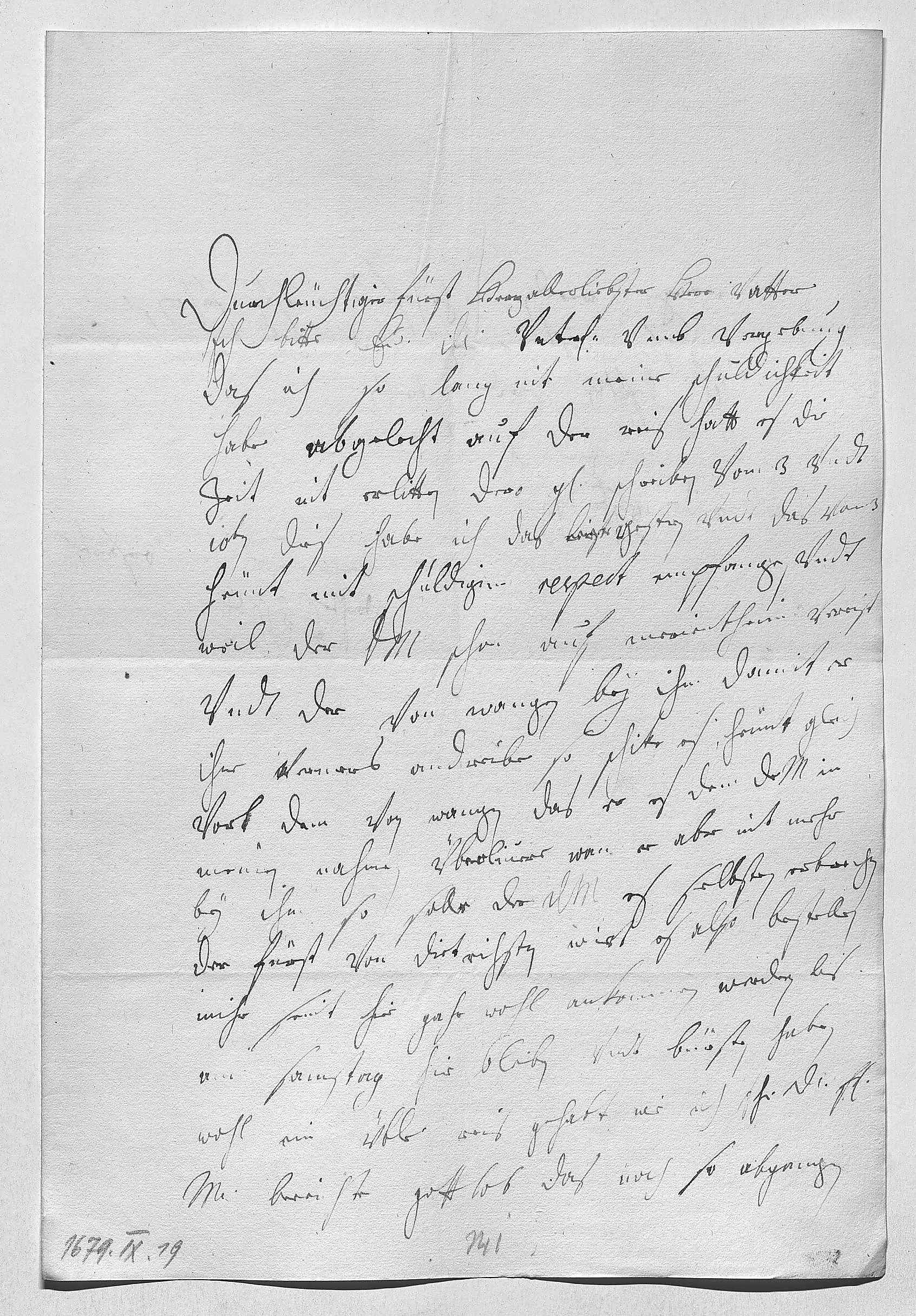 0001Durchleüchtiger Fürst, herzallerliebster herr vatter 0002Ich bitte ewer Durchlaucht vnterthenigst vmb vergebung, 0003das ich so lang nit meine schuldichkeit 0004habe abgelecht. Auf der reis hatt es die 0005zeit nit erlitten. Dero gnädige schreiben vom 3 vndt 000610ten dies habe ich das leste gestren vndt das vom 3 0007heünt mit schuldigem respect empfangen. Vndt 0008weil der Deutschmeister schon auf Merientheim vereist 0009vnd der von Wangen bey ihm, damit er 0010ihne verners andreibe, so schike es heünt gleich 0011vort dem von Wangen, das er es dem Deutschmeister in 0012meinen nahmen überliuere. Wan er aber nit mehr 0013bey ihm, so solle der Deutschmeister es selbsten erbrechen. 0014Der Fürst von Dietrichstein wirt es also bestellen. 0015Mihr seint hier gahr wohl ankommen, werden bis 0016am samstag hier bleiben vndt bürsten. Haben 0017wohl ein üble reis gehabt, wie ich ihr Durchlaucht fraw 0018mutter berichte. Gottlob, das noch so abgangen.