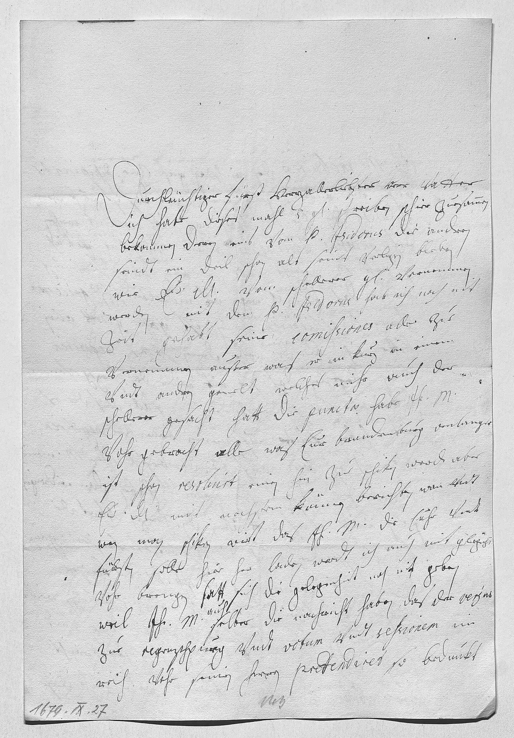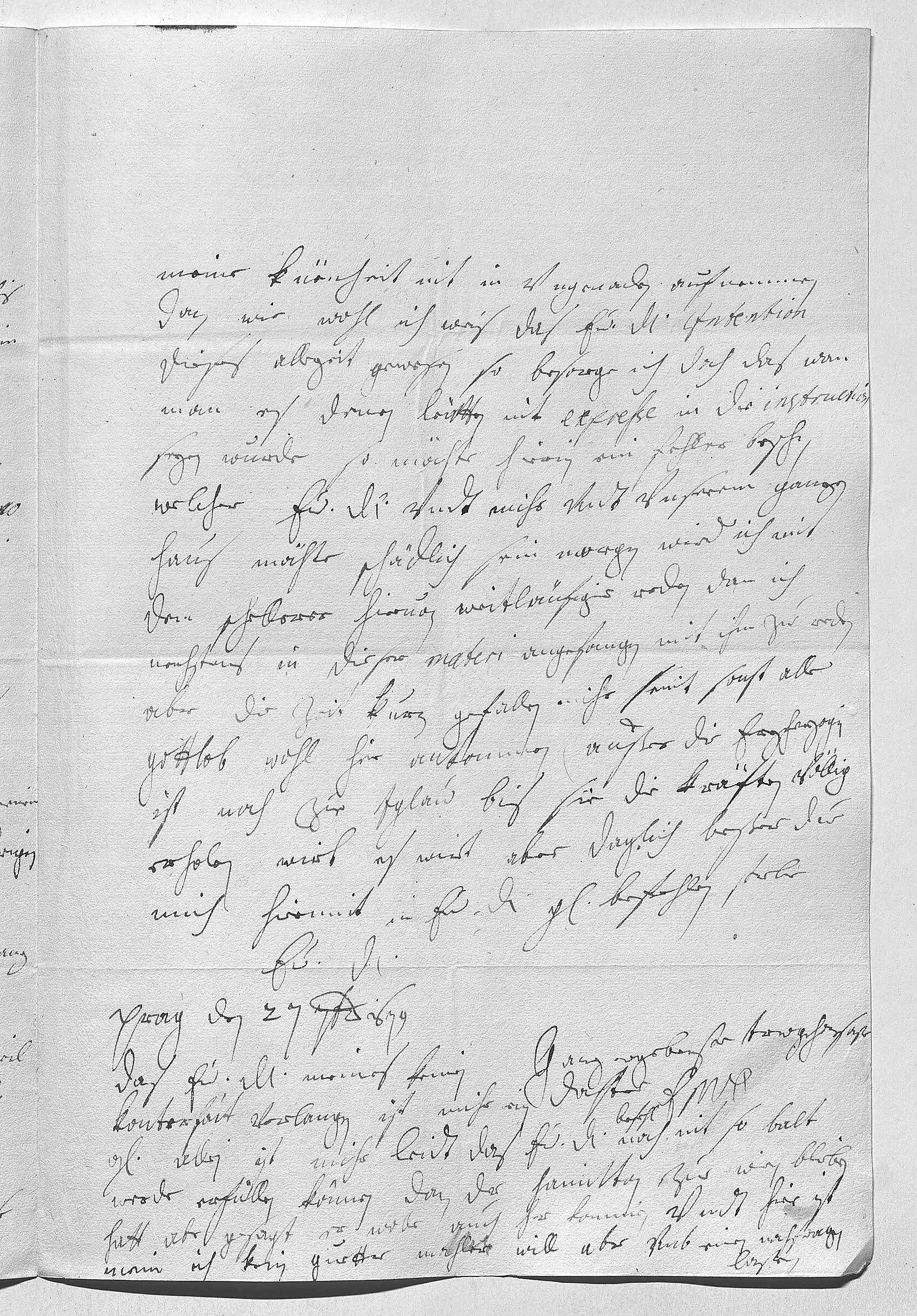 0040meine küenheit nit in vngenaden aufnemmen, 0041dan wie wohl ich weis, das ewer Durchlaucht intention 0042dieses allezeit gewesen, so besorge ich doch, das wan 0043man es denen leütten nit expresse in die instruction 0044sezen wurde, so möchte hierin ein fehler beschen, 0045welcher ewer Durchlaucht vndt mihr vndt vnserem ganzen 0046haus möchte schädlich sein. Morgen wird ich mit 0047dem Schellerer hieruon weitläufiger reden, dan ich 0048nechstens in diser materi angefangen, mit ihm zue reden, 0049aber die zeit kurz gefallen. Mihr seint sonst alle 0050gottlob wohl hier ankommen, außer die Erzherzogin, 0051ist noch zu Iglaw, bis sie die kräften völlig 0052erholen wirt. Es wirt aber daglich beßer. Due 0053mich hiermit in ewer Durchlaucht gnade befehlen, sterbe 0054ewer Durchlaucht 0055ganz ergebenste trewgehorsamste 0056dochter 0057EMT 0058Prag den 27 septembris 16790059Das ewer Durchlaucht meines kleinen 0060konterfait verlangen, ist mihr ein 0061gnad, allein ist mihr leidt, das ewer Durchlaucht befehl noch nit so balt 0062werde erfüllen können, dan der Hamilton zue Wien blieben. 0063Hatt aber gesagt, er wolle auch her kommen, vndt hier ist 0064mein ich, kein guetter mahler, will aber vmb einen nachfragen 0065laßen.