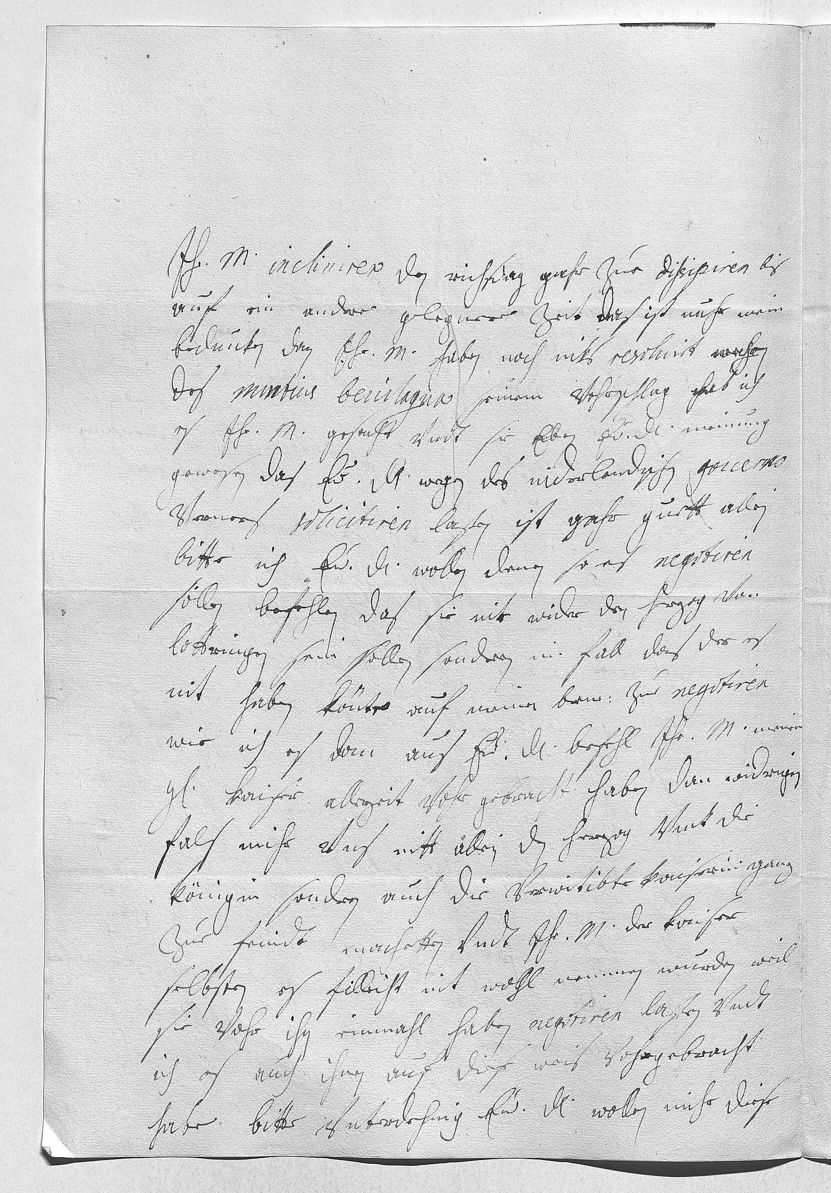 0020ihr Mayestät incliniren, den reichsdag gahr zue dissipiren bis 0021auf ein andere gelegnere zeit. Das ist nuhr mein 0022bedunken, dan ihr Mayestät haben noch niks resoluirt. Wegen 0023des Nuntius Beuilagua seinem vohrschlag hab ich 0024es ihr Mayestät gesacht, vndt sie eben ewer Durchlaucht meinung 0025gewesen. Das ewer Durchlaucht wegen des niderlandischen gouerno 0026verners solicitiren laßen, ist gahr guett, allein 0027bitte ich, ewer Durchlaucht wollen denen, so es negotiren 0028sollen, befehlen, das sie nit wider den Herzog von 0029Lottringen sein sollen, sondern im fall, das der es 0030nit haben könte, auf meinen bruder zue negotiren, 0031wie ich es dan aus ewer Durchlaucht befehl ihr Mayestät, meinem 0032gnädigsten Kaiser, allezeit vohr gebracht haben. Dan widrigen 0033fals mihr vns nitt allein den Herzog vndt die 0034Königin, sondern auch die verwitibte Kaiserin ganz 0035zue feindt machetten, vndt ihr Mayestät der Kaiser 0036selbsten es filleicht nit wohl nemmen wurden, weil 0037sie vohr ihn einmahl haben negotiren laßen vndt 0038ich es auch ihnen auf diese weis vohrgebracht 0039habe. Bitte vnterdehnig, ewer Durchlaucht wollen mihr diese