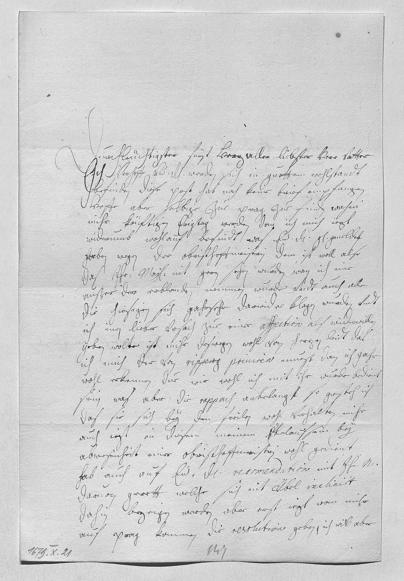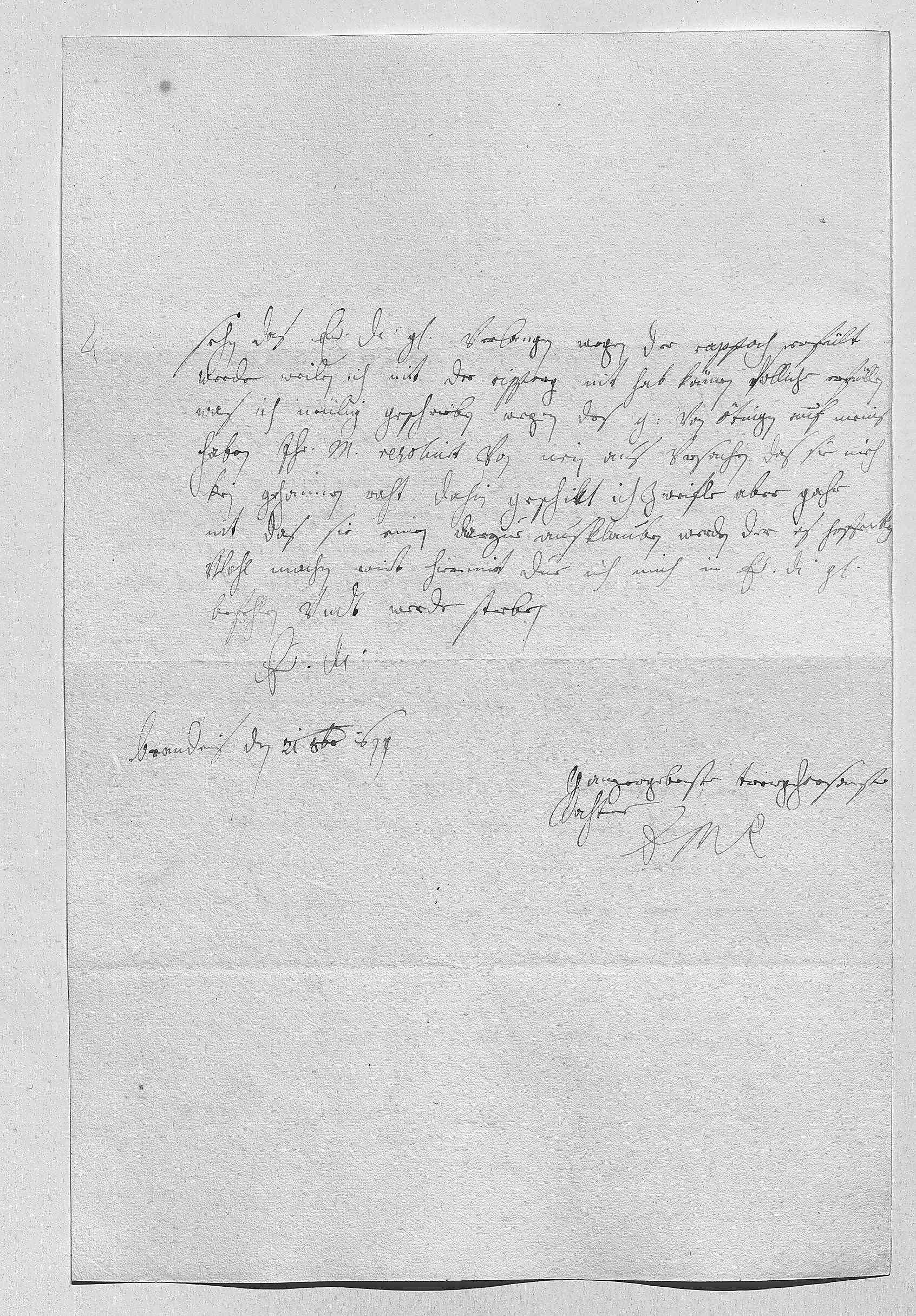 0023sehn, das ewer Durchlaucht gnädiges verlangen wegen der Rappach erfült 0024werde, weilen ich mit der Ripperg nit hab könen solliche erfüllen. 0025Was ich neülig geschrieben wegen des Grafen von Ötingen reise auf Meins 0026haben ihr Mayestät resoluirt von nein aus vrsachen, das sie nieh 0027kein gehaimen raht dahin geschikt. Ich zweifle aber gahr 0028nit, das sie einen darzue ausklauben werden, der es hoffentlich0029wohl machen wirt. Hiermit due ich mich in ewer Durchlaucht gnade 0030befehlen vndt werde sterben 0031ewer Durchlaucht 0032ganzergebenste trewgehorsamste 0033dochter 0034EMT 0035Brandeis den 21 octobris 1679