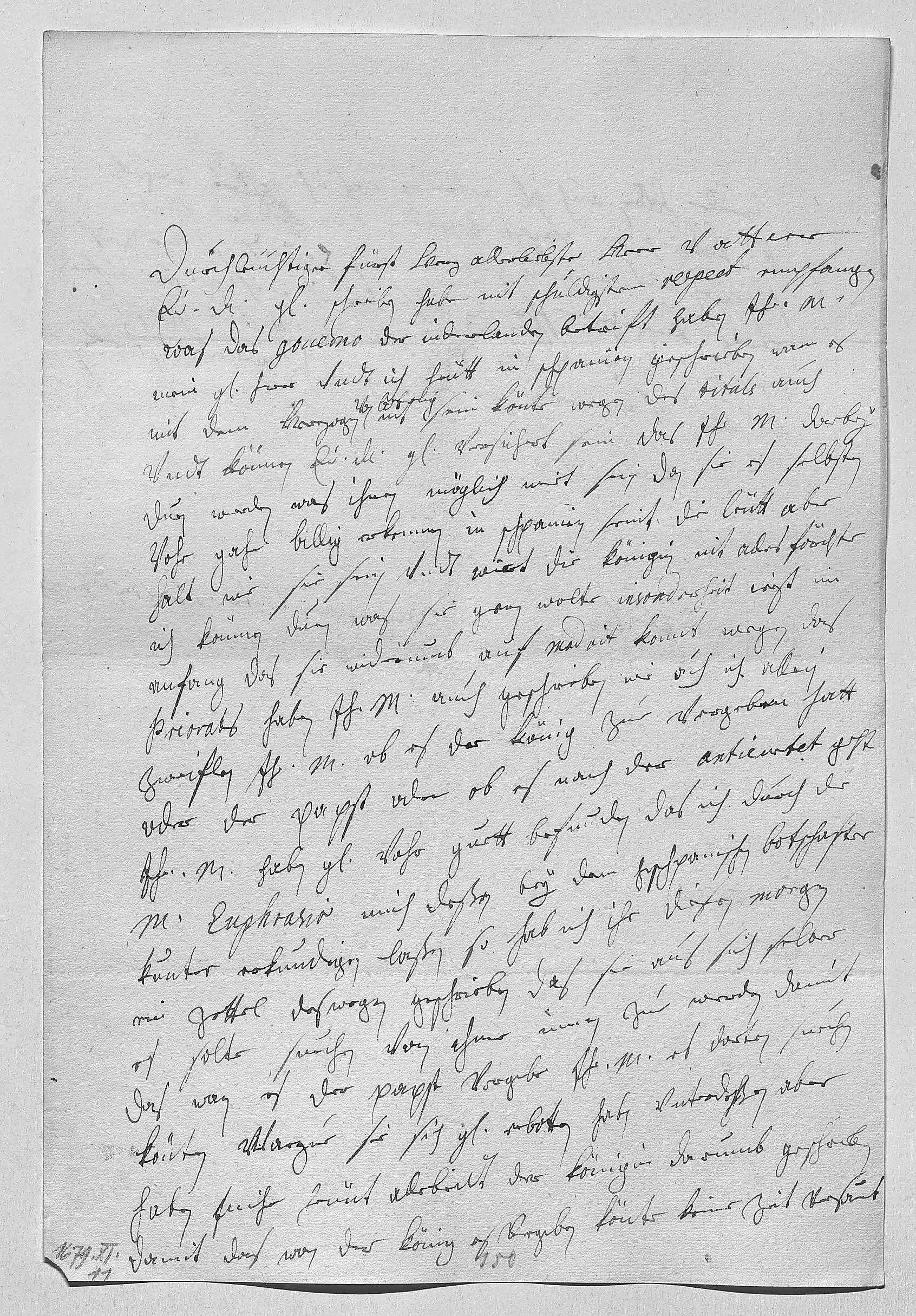 0001Durchleüchtiger Fürst, herz allerliebster herr vatterer 0002Ewer Durchlaucht gnädiges schreiben habe mit schuldigstem respect empfangen. 0003Was das gouerno der Niderlanden betrift, haben ihr Mayestät, 0004mein gnädigster herr, vndt ich heütt in Schpanien geschrieben, wan es 0005mit dem Herzogen von Lotring nit sein könte wegen des tituls auch, 0006vndt können ewer Durchlaucht gnädigst versichert sein, das ihr Mayestät darbey 0007duen werden, was ihnen möglich wirt sein, dan sie es selbsten 0008vohr gahr billig erkennen. In Schpanien seint die leütt aber 0009halt wie sie sein, vndt wirt die Königin nit alles, förchte 0010ich, können duen, was sie gern wolte, insonderheit iezt in 0011anfang, das sie widerumb auf Madrit komt. Wegen das 0012priorats haben ihr Mayestät auch geschrieben, wie auch ich, allein 0013zweiflen ihr Mayestät, ob es der König zue vergeben hatt 0014oder der Papst oder ob es nach der antienetet geht. 0015Ihr Mayestät haben gnädigst vohr guett befunden, das ich durch die 0016mutter Euphrasia mich deßen bey dem schpanischen botschafter 0017kunte erkundigen laßen. So hab ich ihr diesen morgen 0018ein zettel deswegen geschrieben, das sie aus sich selber 0019es solte suechen von ihme innen zue werden, damit 0020das, wan es der Papst vergebe, ihr Mayestät es dorten suechen 0021könten, warzue sie sich gehorsamst erbotten haben. Vnterdeßen aber 0022haben mihr heünt allebeidt der Königin darumb geschriben, 0023damit das, wan der König es vergeben könte, keine zeit versaumt
