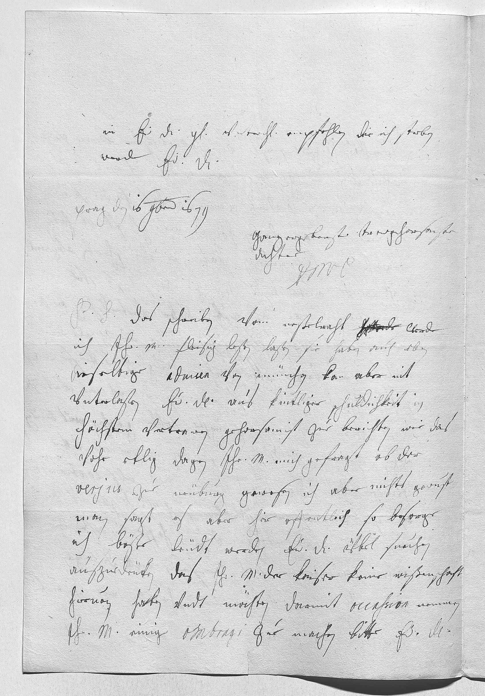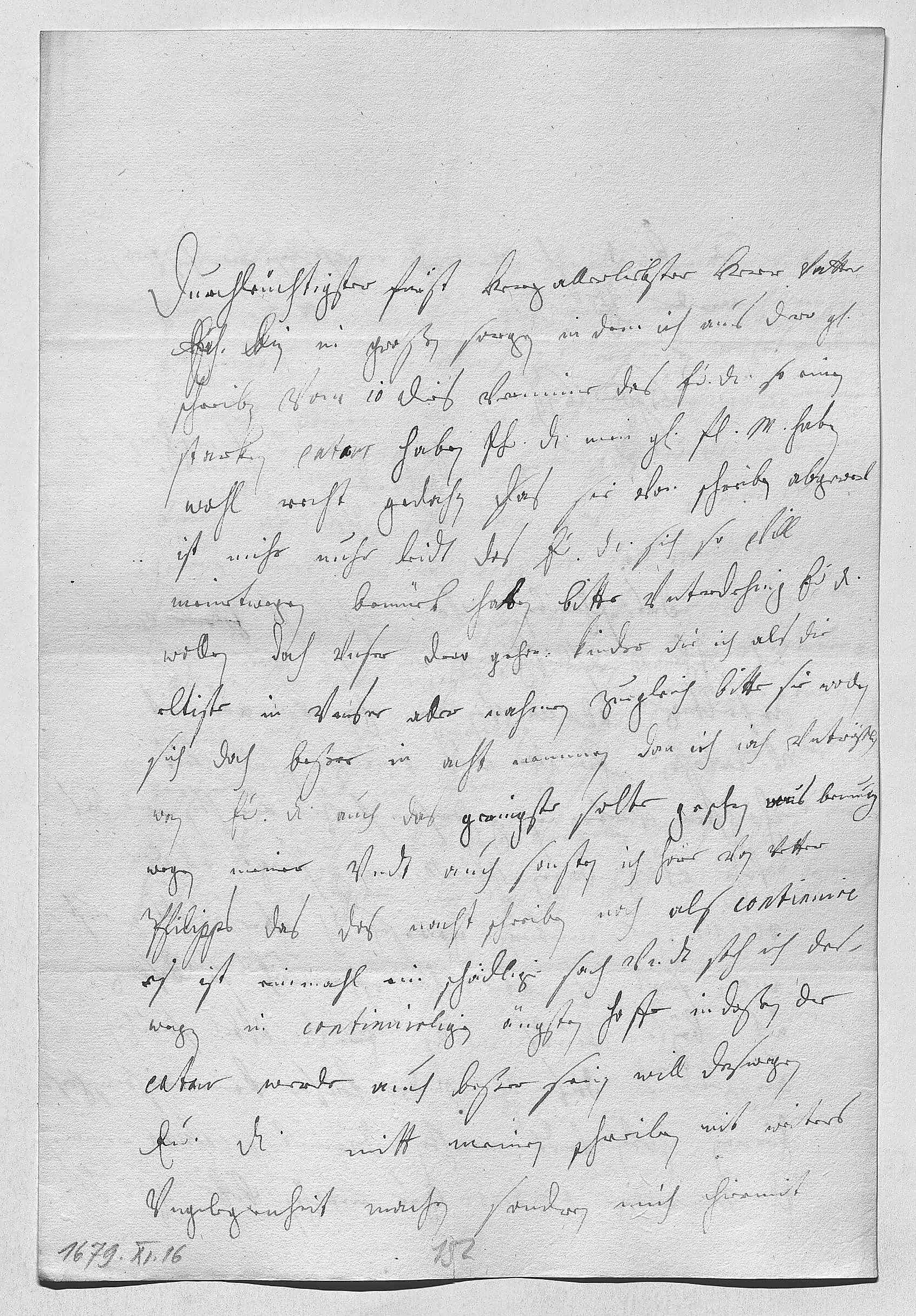 0001Durchleüchtigster Fürst, herzallerliebster herr vatter 0002Ich bin in großen sorgen, in dem ich aus dero gnädigem 0003schreiben vom 10 dies vernime, das ewer Durchlaucht so einen 0004starken catarr haben. Ihr Durchlaucht, mein geliebste fraw mutter, haben 0005wohl recht gedahn, das sie von schreiben abgeret. 0006Ist mihr nuhr leidt, das ewer Durchlaucht sich so vill 0007meinetwegen bemüet haben, bitte vnterdehnig, ewer Durchlaucht 0008wollen doch vnser, dero gehorsamste kinder, die ich als die 0009eltiste in vnser aller nahmen zuegleich bitte, sie wollen 0010sich doch beßer in acht nemmen, dan ich iah vntröstlich, 0011wan ewer Durchlaucht auch das geringste solte geschen aus bemüung 0012wegen meiner vndt auch sonsten. Ich höre von vetter 0013Pfilipps, das das nacht schreiben noch als continuire. 0014Es ist einmahl ein schädlige sach, vndt steh ich des- 0015wegen in continuirligen ängsten, hoffe indeßen, der 0016catar werde auch beßer sein. Will deswegen 0017ewer Durchlaucht mitt meinen schreiben nit weiters 0018vngelegenheit machen, sondern mich hiermit