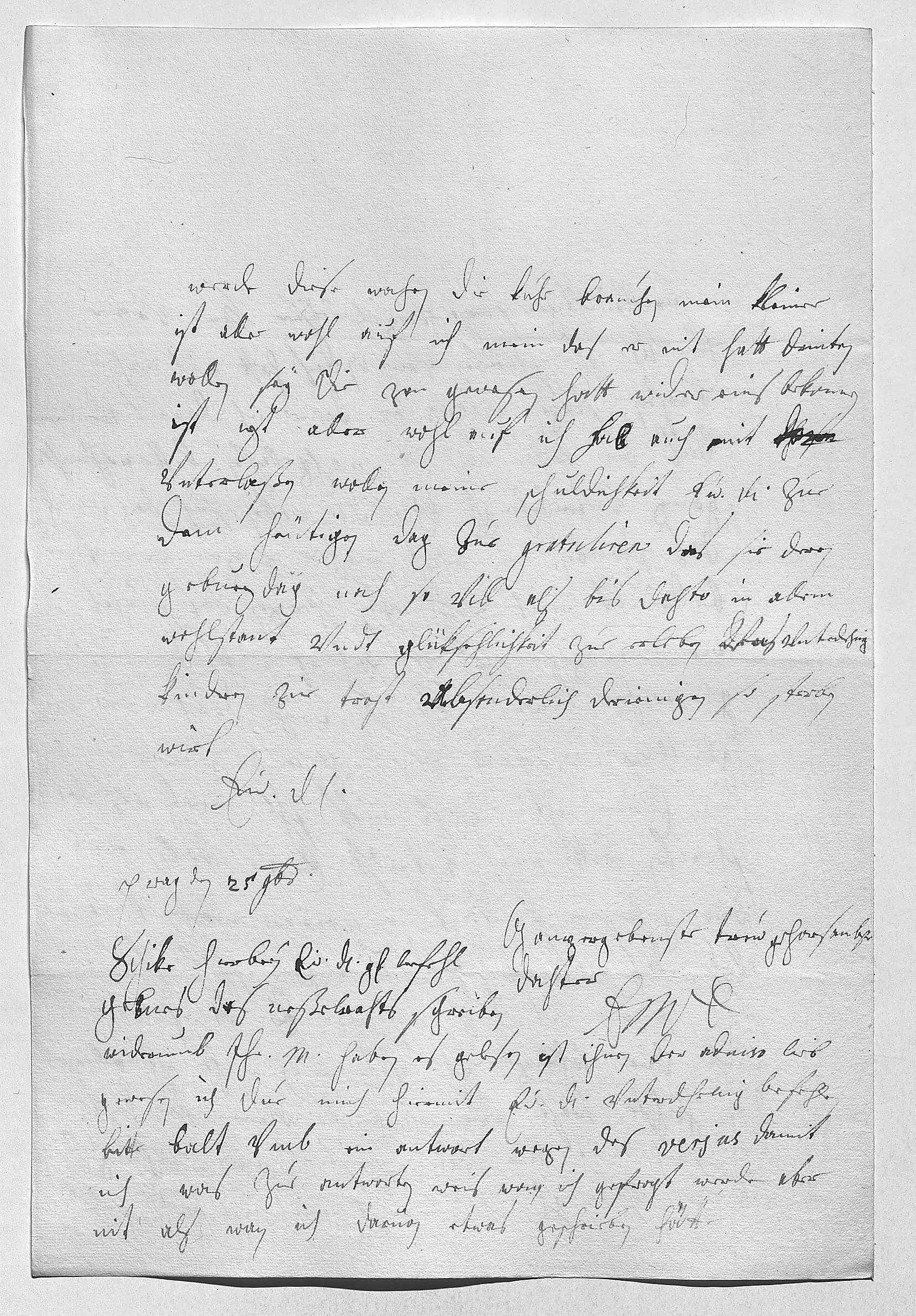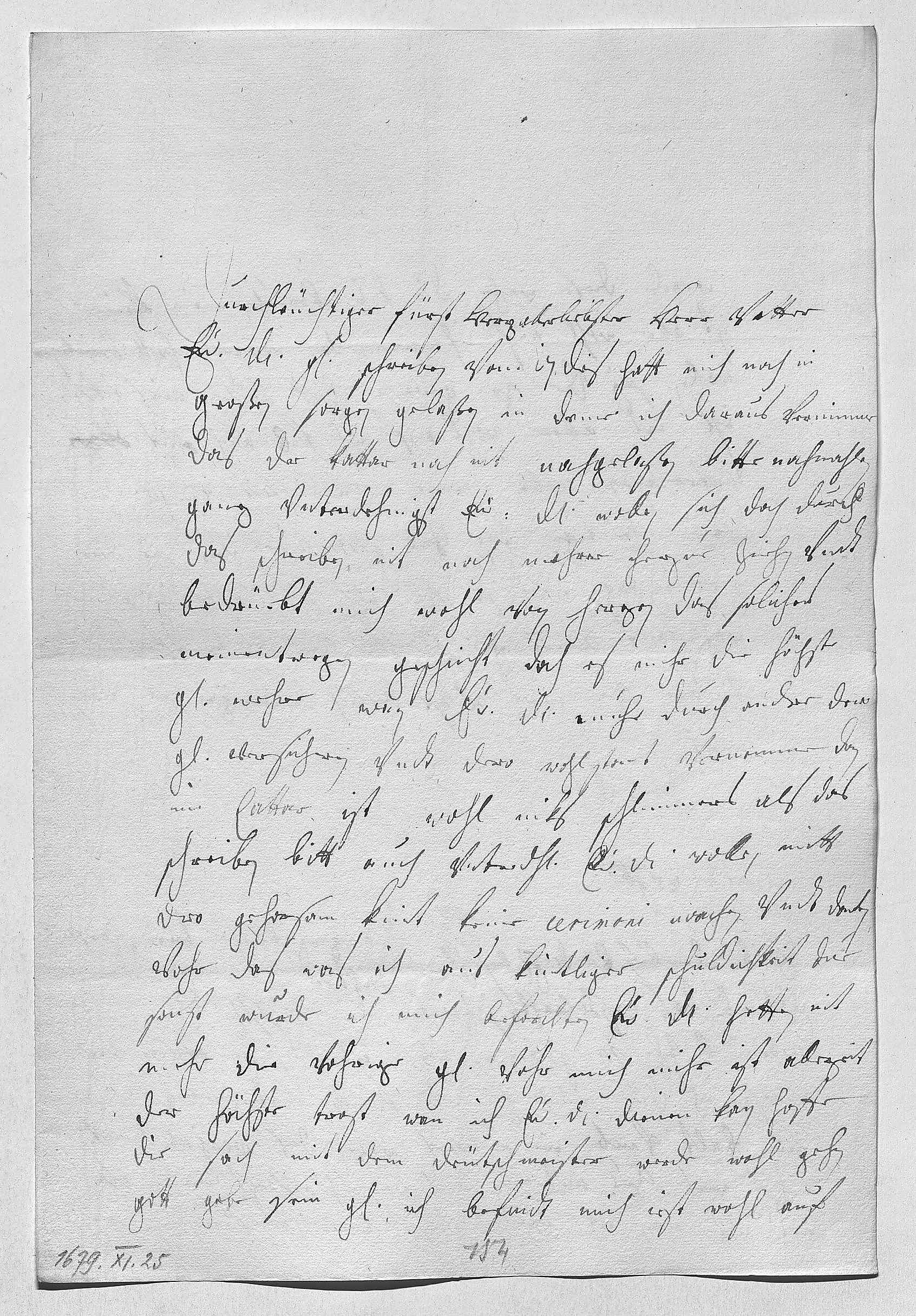 0001Durchleüchtiger Fürst, herzallerliebster herr vatter 0002Ewer Durchlaucht gnädiges schreiben vom 17 dies hatt mich noch in 0003großen sorgen gelaßen, in deme ich daraus vernimme, 0004das der kattar noch nit nachgelaßen. Bitte nochmahlen 0005ganz vnterdehnigst, ewer Durchlaucht wollen sich doch durch 0006das schreiben nit noch mehrer herzue ziehen vndt 0007bedrüebt mich wohl von herzen, das soliches 0008meinentwegen geschicht, dah es mihr die höchste 0009gnade wehre, wan ewer Durchlaucht nuhr durch andere mir dero 0010gnade versicheren vndt dero wohlstant vernemme, dan 0011ein cattar ist wohl niks schlimmers als das 0012schreiben. Bitt auch vnterdehnigst, ewer Durchlaucht wollen mitt 0013dero gehorsam kint keine cerimoni machen vndt danken 0014vohr das, was ich aus kintliger schuldichkeit due, 0015sonst wurde ich mich beforchten, ewer Durchlaucht hetten nit 0016mehr die vohrige gnade vohr mich. Mihr ist allezeit 0017der höchste trost, wan ich ewer Durchlaucht dienen kan. Hoffe, 0018die sach mit dem Deütschmeister werde wohl gehn, 0019gott gebe sein gnade . Ich befindt mich izt wohl auf,