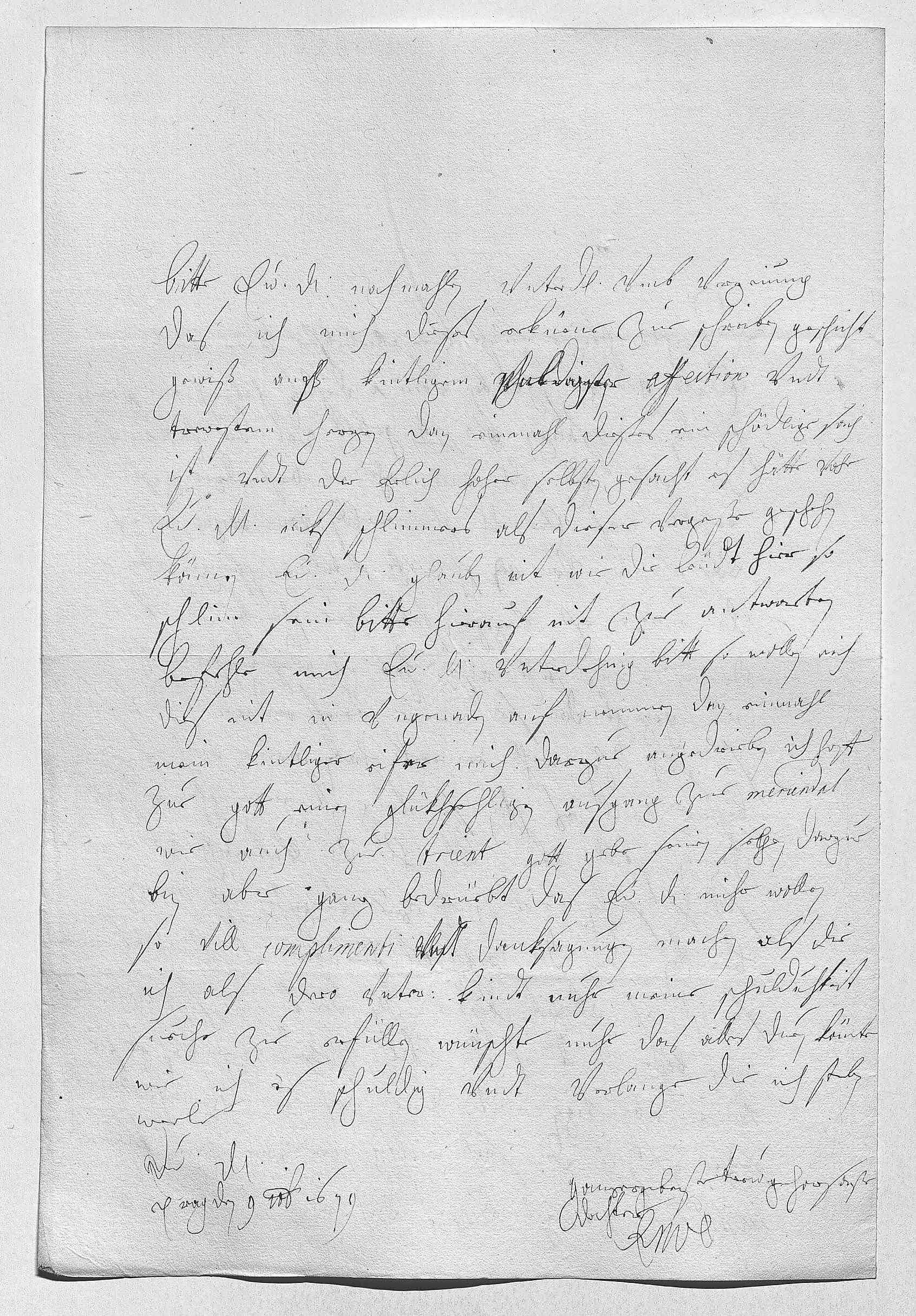 0020Bitte ewer Durchlaucht nochmahlen vnterdehnigst vmb verzeiung, 0021das ich mich dieses erküene zue schreiben, geschicht 0022gewiß auß kintligem schuldigster affection vndt 0023trewestem herzen, dan einmahl dießes ein schädlige sach 0024ist vndt der erlich Hoher selbsten gesacht, es hätte vohr 0025ewer Durchlaucht niks schlimmers als dieser vergeße geschehn 0026können. Ewer Durchlaucht glauben nit, wie die leüdt hier so 0027schlim sein. Bitte hierauf nit zue antworten. 0028Befehle mich ewer Durchlaucht vnterdehnig, bitt so wollen auch 0029dis nit in vngenaden auf nemmen, dan einmahl 0030mein kintliger eifer mich darzue angedrieben. Ich hoff 0031zue gott einen glükhsehligen ausgang zue Meriendal 0032wie auch zue Trient, gott gebe seinen segen darzue. 0033Bin aber ganz bedrüebt, das ewer Durchlaucht mihr wollen 0034so vill complimenti vndt danksagungen machen, als die 0035ich als dero vnterdehnigstes kindt nuhr meine schuldichkeit 0036sueche zue erfüllen. Wünschte nuhr, das alles duen könnte, 0037wie ich es schuldig vndt verlange, die ich sterben 0038werde 0039ewer Durchlaucht 0040ganzergebenste trewgehosamste 0041dochter 0042EMT 0043Prag den 9 december 1679