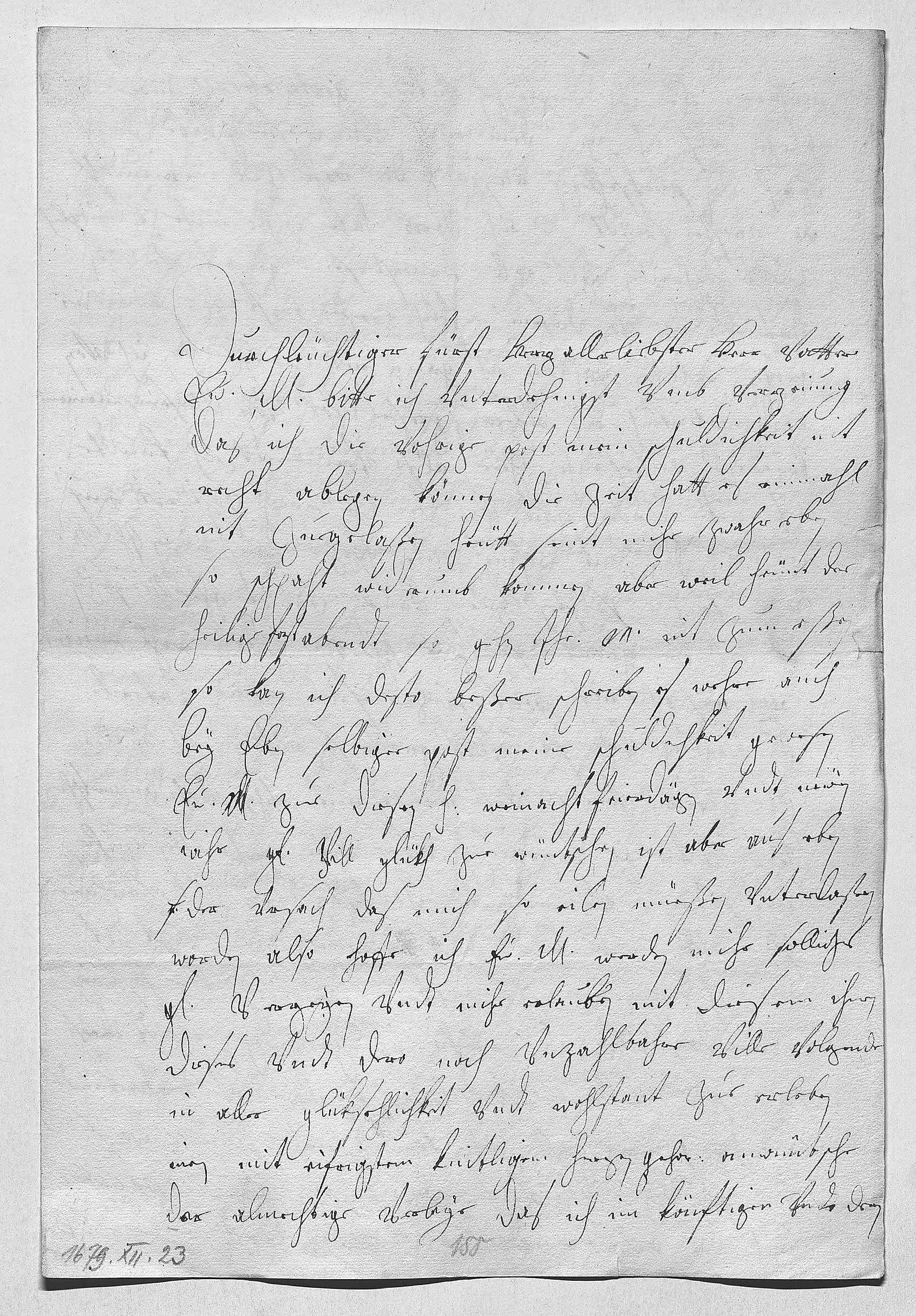 0001Durchleüchtiger Fürst, herz allerliebster herr vatter 0002Ewer Durchlaucht bitte ich vnterdehnigst vmb verzeiung, 0003das ich die vohrige post mein schuldichkeit nit 0004recht ablegen können. Die zeit hatt es einmahl 0005nit zuegelaßen. Heütt seint mihr zwahr eben 0006so schpaht widerumb kommen, aber weil heünt der 0007heilige fastabendt, so gehn ihr Mayestät nit zum eßen. 0008So kan ich desto beßer schreiben. Es wehre auch 0009bey eben selbiger post meine schuldichkeit gewesen, 0010ewer Durchlaucht zue diesen heiligen weinachtfeierdägen vndt newen 0011iahr gehorsamst vill glükh zue wüntschen, ist aber aus eben 0012der vrsach, das mich so eilen müeßen, vnterlaßen 0013worden. Also hoffe ich, ewer Durchlaucht werden mihr solliches 0014gnädigst verzeyen vndt mihr erlauben, das mit diesem ihnen 0015dieses vndt dero noch vnzahlbahre ville volgende 0016in aller glüksehlichkeit vndt wohlstant zue erleben 0017inen mit eifrigstem kintligem herzen gehorsamst anwüntsche. 0018Der almechtige verleye, das ich im könftigen jahr vnde denen