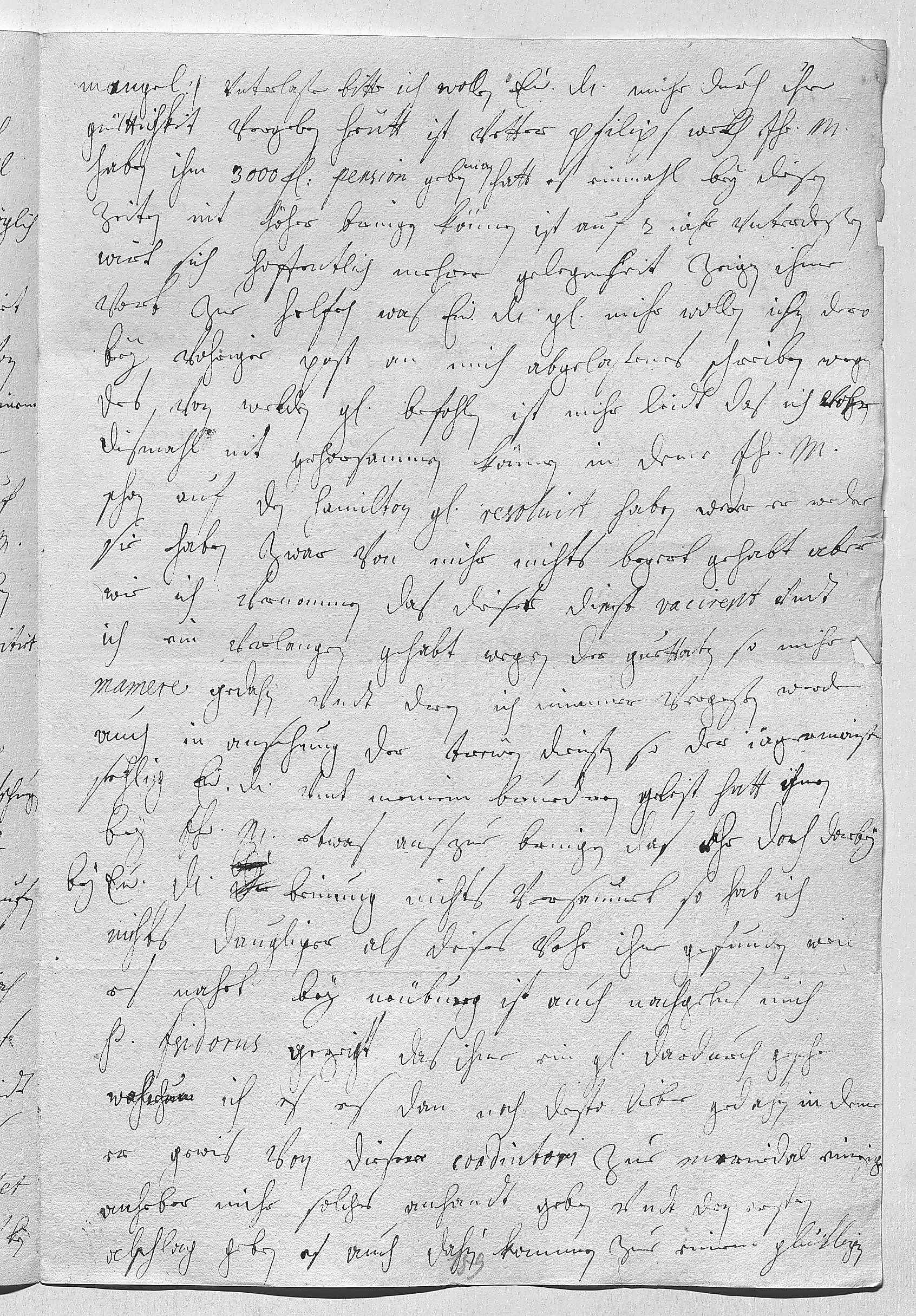 0044mangel) vnterlaße, bitte ich, wollen ewer Durchlaucht mihr durch ihre 0045güettichkeit vergeben. Heütt ist vetter Pfilips wekh. Ihr Mayestät 0046haben ihm 3000 Gulden pension geben. Man hatt es einmahl bey diesen 0047zeiten nit höher bringen können, ist auf 2 iahr. Vnterdeßen 0048wirt sich hoffentlich mehrere gelegenheit zeigen, ihme 0049vort zue helfen. Was ewer Durchlaucht gnädig mihr wollen ihn dero 0050bey vohriger post an mich abgelaßenes schreiben wegen 0051des von Welden gnädig befohlen, ist mihr leidt, das ich vohr 0052dismahl nit gehorsammen können, in deme ihr Mayestät 0053schon auf den Hamilton gnädigst resoluirt haben. Weder er weder 0054sie haben zwar von mihr nichts begert gehabt, aber 0055wie ich vernommen, das dieser dienst vacirent vndt 0056ich ein verlangen gehabt, wegen der guettaten, so mihr 0057Mamere gedahn vndt deren ich nimmer vergeßen werde, 0058auch in ansehung der trewen diensten, so der Iägermaister 0059sehlig ewer Durchlaucht vndt meinem bruedren geleist hatt, ihnen 0060bey ihr Mayestät etwas auszue bringen, das ehr doch darbey 0061bey ewer Durchlaucht du bedinung nichts versaumet. So hab ich 0062nichts daugliger als dieses vohr ihne gefunden, weil 0063es nahet bey Neüburg ist, auch nachgehns mich 0064Pater Isidorus gezeigt, das ihme ein gnade dardurch gesche, 0065welchem ich es es dan noch desto lieber gedahn, in deme 0066er gewis von dieser coadiutori zue Meriendal einziger 0067anheber, mihr solches anhandt geben vndt den ersten 0068alschlag geben, es auch dahin kommen, zue einem glükligen
