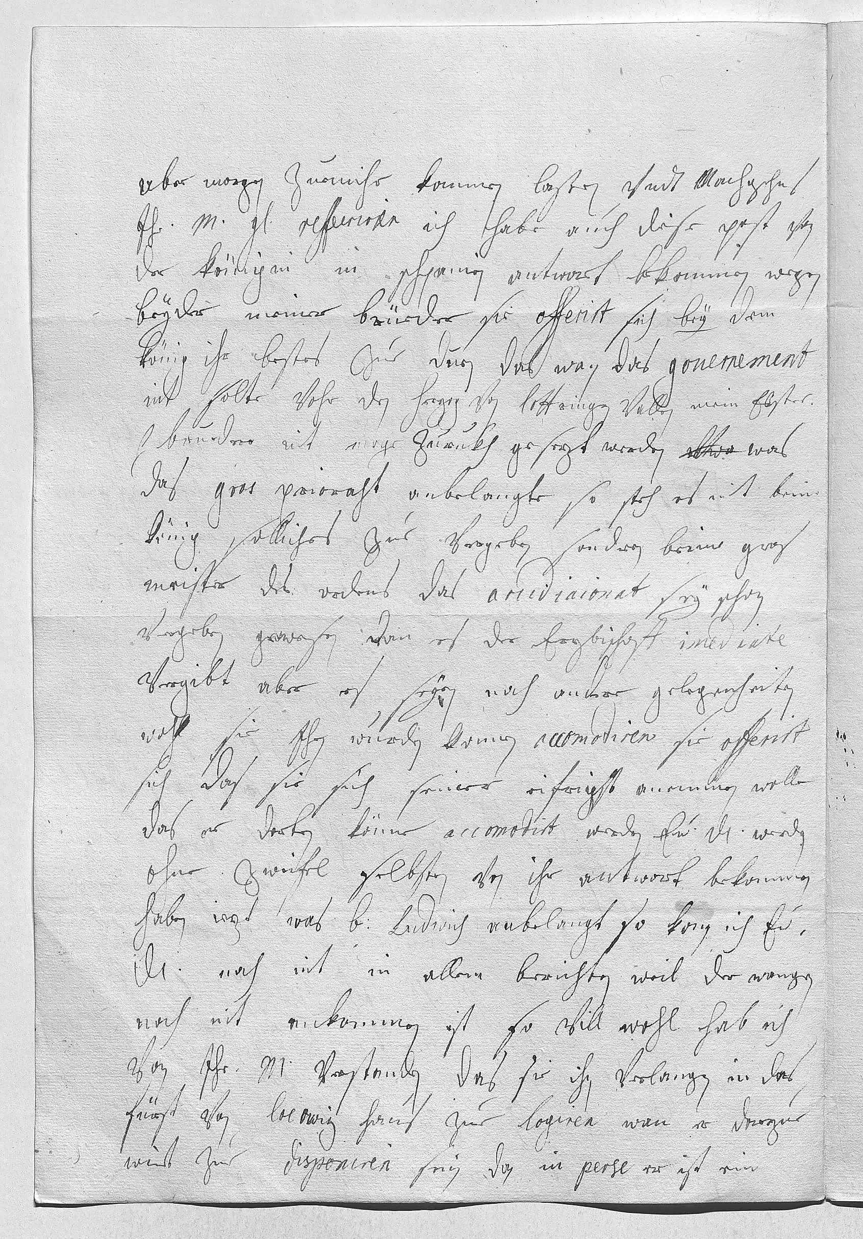 0021aber morgen zuemihr kommen laßen vndt nachgehns 0022ihr Mayestät gehorsamst reffeeriren. Ich habe auch diese post von 0023der Königin in Schpanien antwort bekommen wegen 0024beyder meiner brüeder . Sie offerirt sich, bey dem 0025König ihr bestes zue duen, das wan das gouernement 0026nit solte vohr den Herzog von Lottringen vallen, mein elster 0027herr brueder nit moge zurukh gesezt werden. etwa Was 0028das gros prioraht anbelangte, so steh es nit beim 0029König, solliches zue vergeben, sondren beim gros 0030meister des ordens . Das arcidiaconat sey schon 0031vergeben gewesen, dan es der Erzbischoff imediate 0032vergibt, aber es seyen noch andere gelegenheiten, 0033woh sie ihen wurden konnen accomodiren. Sie offerirt 0034sich, das sie sich seiner eifrigst anemmen wolle, 0035das er dorten könne accomodirt werden. Ewer Durchlaucht werden 0036ohne zweifel selbsten von ihr antwort bekommen 0037haben. Iezt was bruder Ludwich anbelangt, so kan ich ewer 0038Durchlaucht noch nit in allem berichten, weil der Wangen 0039noch nit ankommen ist. So vill wohl hab ich 0040von ihr Mayestät verstanden, das sie ihn verlangen in des 0041Fürst von Locowiz haus zue logiren, wan er darzue 0042wirt zu disponiren sein, dan in perse er ist ein