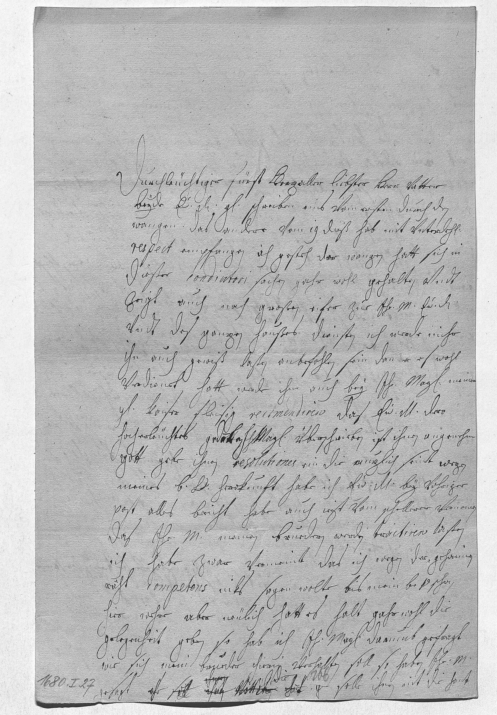 0001Durchleüchtiger Fürst, herzaller liebster herr vatter 0002Beyde ewer Durchlaucht gnädige schreiben, eins vom ersten durch den 0003Wangen, das andere vom 19 dieß, hab mit vnterdehnigstem 0004respect empfangen. Ich gesteh, der Wangen hatt sich in 0005dießer coadiutori sachen gahr wohl gehalten vndt 0006zeigt auch noch großen eifer zue ihr Mayestät, ewer Durchlaucht 0007vndt des ganzen haußes diensten. Ich werde mihr 0008ihn auch gewiß laßen anbefohlen sein, dan er es wohl 0009verdienet hatt, werde ihn auch bey ihr Mayestät, meinem 0010gnädigsten Kaiser, fleisig recomendiren. Das ewer Durchlaucht dero 0011hocherleüchtes gedanken ihr Mayestät überschrieben, ist ihnen angenehm, 0012gott gebe ihnen resolutiones ein, die nuzlich seint. Wegen 0013meines bruders Liebden herokunft habe ich ewer Durchlaucht bey vohriger 0014post alles bericht, habe auch iezt vom Schellerer vernomen, 0015das ihr Mayestät meinen bruedern werden tractiren laßen. 0016Ich habe zwar vermeint, das ich wegen der gehaimen 0017räht competens niks sagen wolte, bis mein bruder Liebden schon 0018hier wehre, aber neülich hatt es halt gahr wohl die 0019gelegenheit geben, so hab ich ihr Mayestät darumb gefragt, 0020wie sich mein brueder hierin verhalten soll, so haben ihr Mayestät 0021gesagt, ehr soll ihnen ??? die hant g solle ihnen nit die hant