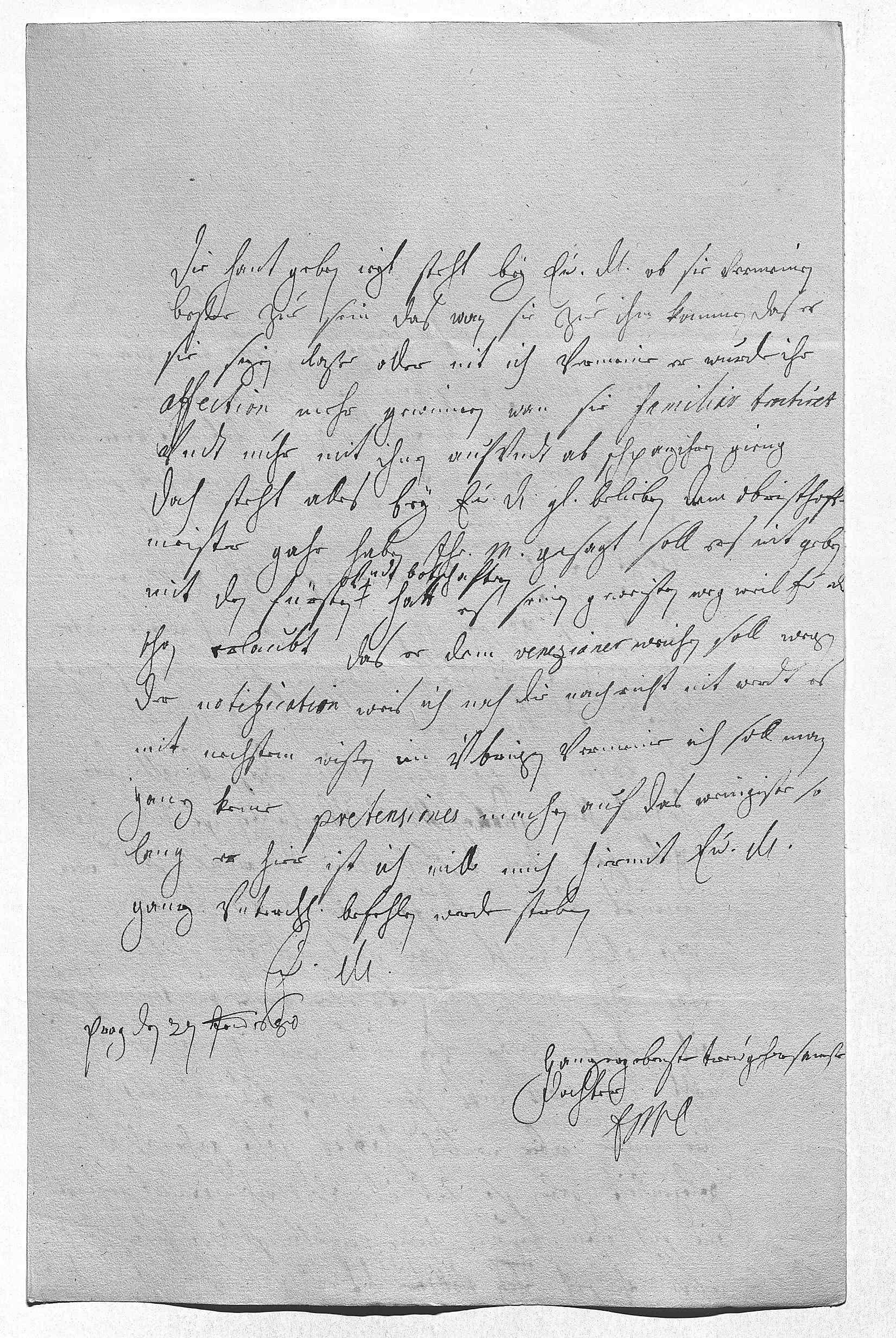 0022die hant geben. Iezt steht bey ewer Durchlaucht, ob sie vermeinen, 0023beßer zue sein, das wan sie zue ihm kommen, das er 0024sie sizen laße oder nit. Ich vermeine, er wurde ihr 0025affection mehr gewinnen, wan er sie familiar tractiret 0026vndt nuhr mit ihnen auf vndt ab schpazihren gieng, 0027doch steht alles bey ewer Durchlaucht gnädigsten belieben. Dem Obristhoff- 0028meister gahr, haben ihr Mayestät gesagt, soll ers nit geben, 0029mit den fürsten vndt botschaftern hatt es seinen gewisten weg, weil ewer Durchlaucht 0030schon erlaubt, das er dem venezianer weichen soll. Wegen 0031der notification weis ich noch die nachricht nit, werdt es 0032mit nechstem wißen. Im übrigen, vermeine ich, soll man 0033ganz keine pretensiones machen, auf das wenigiste so 0034lang er hier ist. Ich will mich hiermit ewer Durchlaucht 0035ganz vnterdehnigst befehlen, werde sterben 0036ewer Durchlaucht 0037ganzergebenste trewgehorsamste 0038dochter 0039EMT 0040Prag den 27 januarij 1680