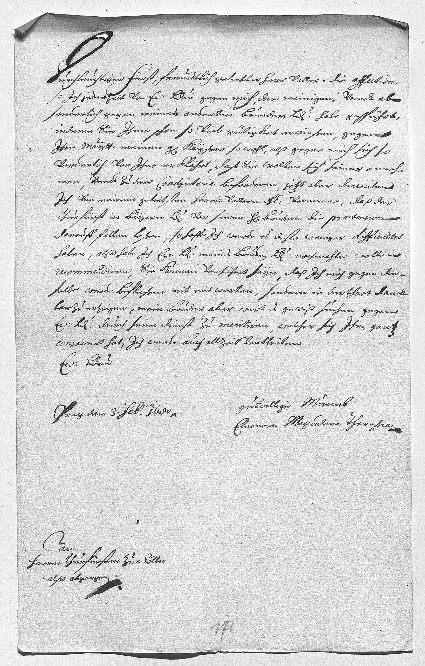 0021Ich bin von herzen froh, das der Cuhrfürst zue Münichen 0022die pretension vohr seinen bruedern vallen laßen, iezt, hoff 0023ich, werde es leichter gehn als zuefohr, welches ich wohl 0024von herzen wüntsche, vndt das ewer Durchlaucht dergleichen zuefriden- 0025heiten der almechtige vill woll verleyen. Ich aber 0026werde sterben 0027ewer Durchlaucht 0028ganzergebenste trewgehorsamste 0029dochter Eleonora Magdalen Theres 0030Prag den den 3 februarij 16800031Postscriptum Bitt vnterdehnigst, ewer Durchlaucht machen doch mit dero gehorsamst 0032kindt nit so vill complimenti vndt dank vohr so schantligen 0033rosen krans. Ich förchte, ich sey ganz in vngenaden. Schike hierbey das 0034schreiben an den Cuhrfürst von Cöllen, wan es so nit recht ist, will ich 0035ein anders machen. Mues disen fasching in vohrsorg 0036vmb gnädigste vergebeung bitten, wan etwas nachläßig in meiner 0037schuldichkeit bin, es ist die zeit gahr cuhrz mit den naredey, 0038die mihr haben.