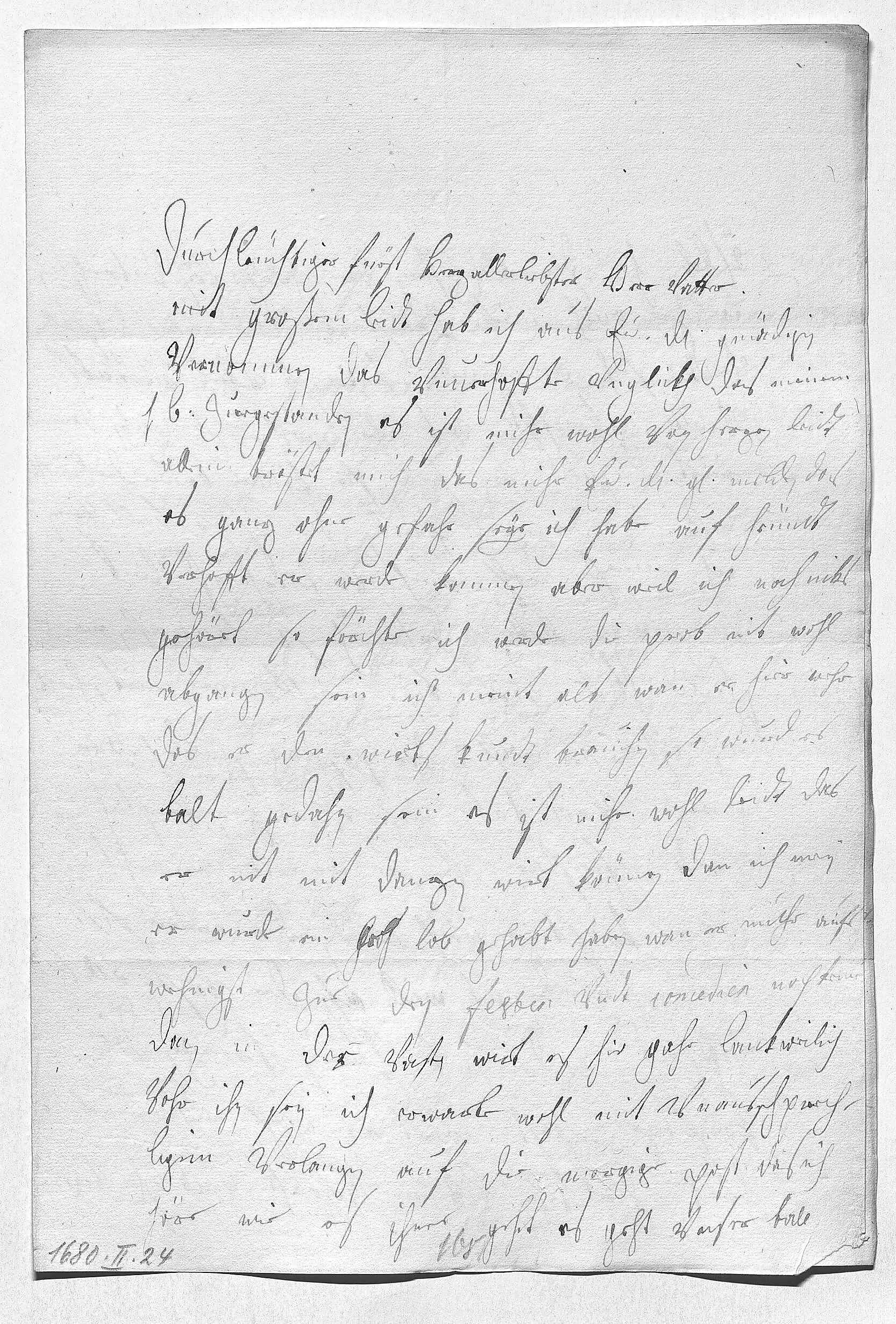 0001Durchleüchtiger Fürst, herzallerliebster herr vatter 0002Mit großem leidt hab ich aus ewer Durchlaucht gnädigen 0003vernommen das vnuerhoffte vnglükh, das meinem 0004herrn bruder zuegestanden. Es ist mihr wohl von herzen leidt, 0005allein tröstet mich, das mihr ewer Durchlaucht gnädig melden, das 0006es ganz ohne gefahr seye. Ich habe auf heündt 0007verhofft, er werde kommen, aber weil ich noch niks 0008gehöret, so förchte ich, werde die prob nit wohl 0009abgangen sein. Ich meint als wan er hier wehr, 0010das er den Wirts kundt brauchen, so wurd es 0011balt gedahn sein. Es ist mihr wohl leidt, das 0012er nit mit danzen wirt können, dan ich mein, 0013er wurde ein hoch lob gehabt haben, wan er nuhr aufs 0014wehnigst zue den festen vndt comedien noch keme, 0015dan in der vasten wirt es hie gahr lankweilich 0016vohr ihn sein. Ich erwarte wohl mit vnausschprech- 0017ligen verlangen auf die morgige post, das ich 0018höre, wie es ihme gehet. Es geht vnser ball