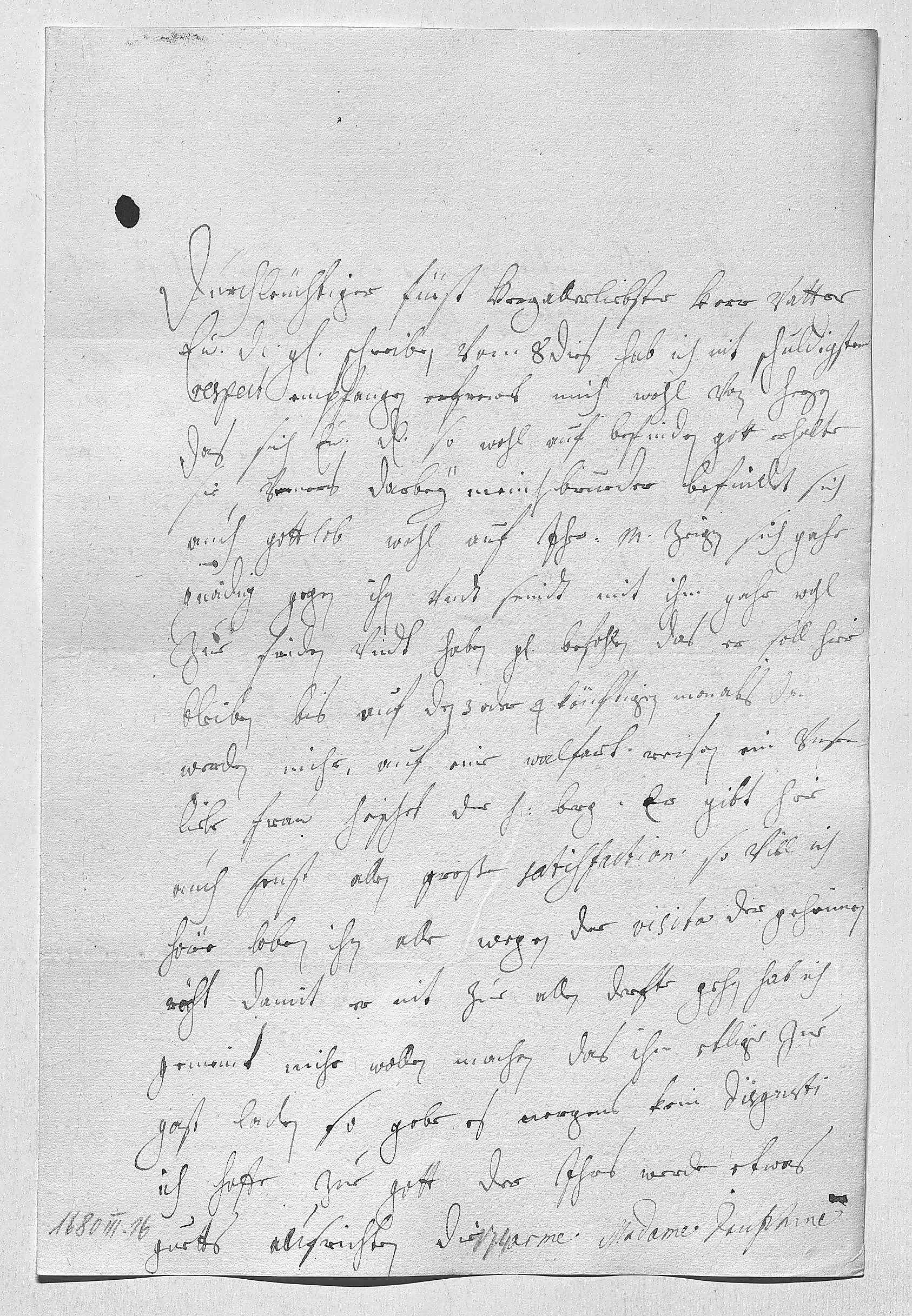 0001Durchleüchtiger Fürst, herzallerliebster herr vatter 0002Ewer Durchlaucht gnädiges schreiben vom 8 dies hab ich mit schuldigsten 0003respect empfangen. Erfrewet mich wohl von herzen, 0004das sich ewer Durchlaucht so wohl auf befinden, gott erhalte 0005sie verners darbey. Mein herr brueder befindet sich 0006auch gottlob wohl auf. Ihro Mayestät zeigen sich gahr 0007gnädig gegen ihn vndt seindt mit ihm gahr wohl 0008zue friden vndt haben gnädigst befohlen, das er soll hier 0009bleiben bis auf den 3 oder 4 könftigen monats. Dan 0010werden mihr auf eine walfart reisen, ein vnsere 0011liebe frau, heischet der Heilige Berg . Er gibt hier 0012auch sonst allen große satisfaction, so vill ich 0013höre, loben ihn alle wegen der visita der geheimen 0014räht. Damit er nit zue allen derfte gehen, hab ich 0015gemeint, mihr wollen machen, das ihn etlige zue 0016gast laden, so gebe es nirgens kein disgusti. 0017Ich hoffe zue gott, der Ihrs werde etwas 0018guetts ausrichten. Die arme Madame Dauphine