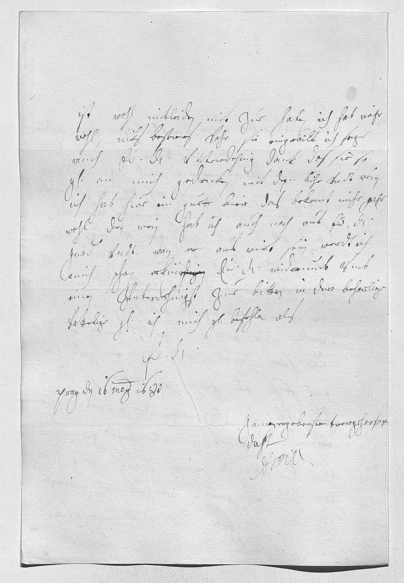 0019ist wohl mitleiden mit zue haben. Ich hab mihr 0020wohl niks beßeres vohr sie eingebilt. Ich sage 0021auch ewer Durchlaucht vnterdehnig dank, das sie so 0022gnädig an mich gedenken mit dem bihr vndt wein. 0023Ich hab hier ein guett bier, das bekomt mihr gahr 0024wohl, den wein hab ich auch noch aus ewer Durchlaucht 0025gnad vndt wan er aus wirt sein, werdt ich 0026mich schon erkünendigen , ewer Durchlaucht widerumb vmb 0027einen vnterdehnigst zue bitten. In dero beharlige 0028vatterlige gnade ich mich gehorsamst befehle als 0029ewer Durchlaucht 0030ganzergebenste trewgehorsamst 0031dochter 0032EMT 0033Prag den 16 merz 1680