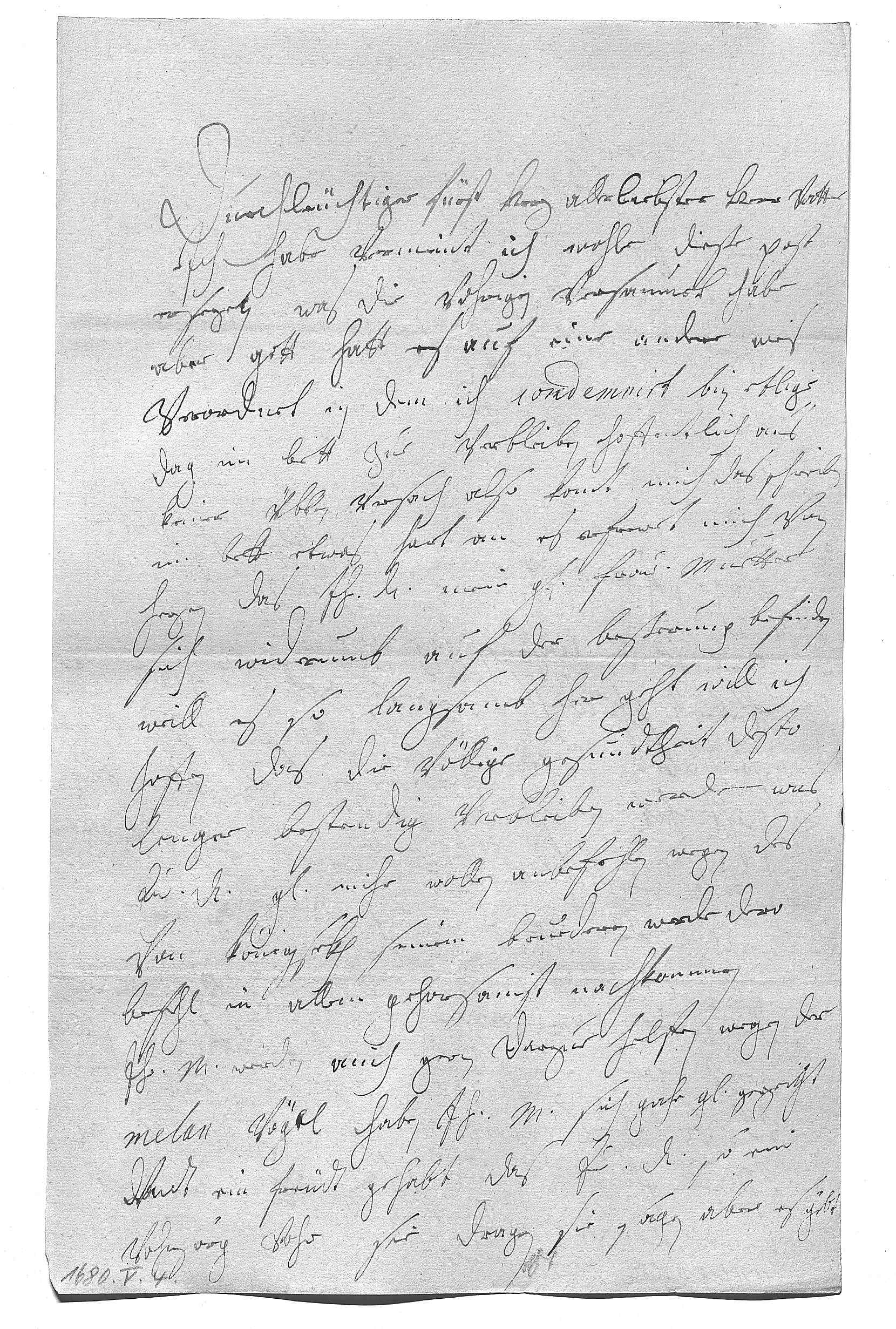 0001Durchleüchtiger Fürst, herz allerliebster herr vatter 0002Ich habe vermeint, ich wohle dieße post 0003ersezen, was die vohrigen versaumet habe, 0004aber gott hatt es auf eine andere weis 0005verordnet, in dem ich condemnirt bin, etlige 0006dag im bett zue verbleiben, hoffentlich aus 0007keiner üblen vrsach. Also komt mich das schreiben 0008im bett etwas hart an. Es erfrewet mich von 0009herzen, das ihr Durchlaucht mein geliebste fraw muetter 0010sich widerumb auf der beßerung befinden. 0011Weill es so langsamb her geht, will ich 0012hoffen, das die völlige gesundtheit desto 0013lenger bestendig verbleiben werde. Was 0014ewer Durchlaucht gnädig mihr wollen anbefehlen wegen des 0015von Königsekh seinem bruederen werde dero 0016befehl in allem gehorsamist nachkommen. 0017Ihr Mayestät werden auch gern darzue helfen. Wegen der 0018melan vögel haben ihr Mayestät sich gahr gnädig gezeicht 0019vndt ein freüdt gehabt, das ewer Durchlaucht so ein 0020vohrsorg vohr sie dragen. Sie sagen aber, es gibt