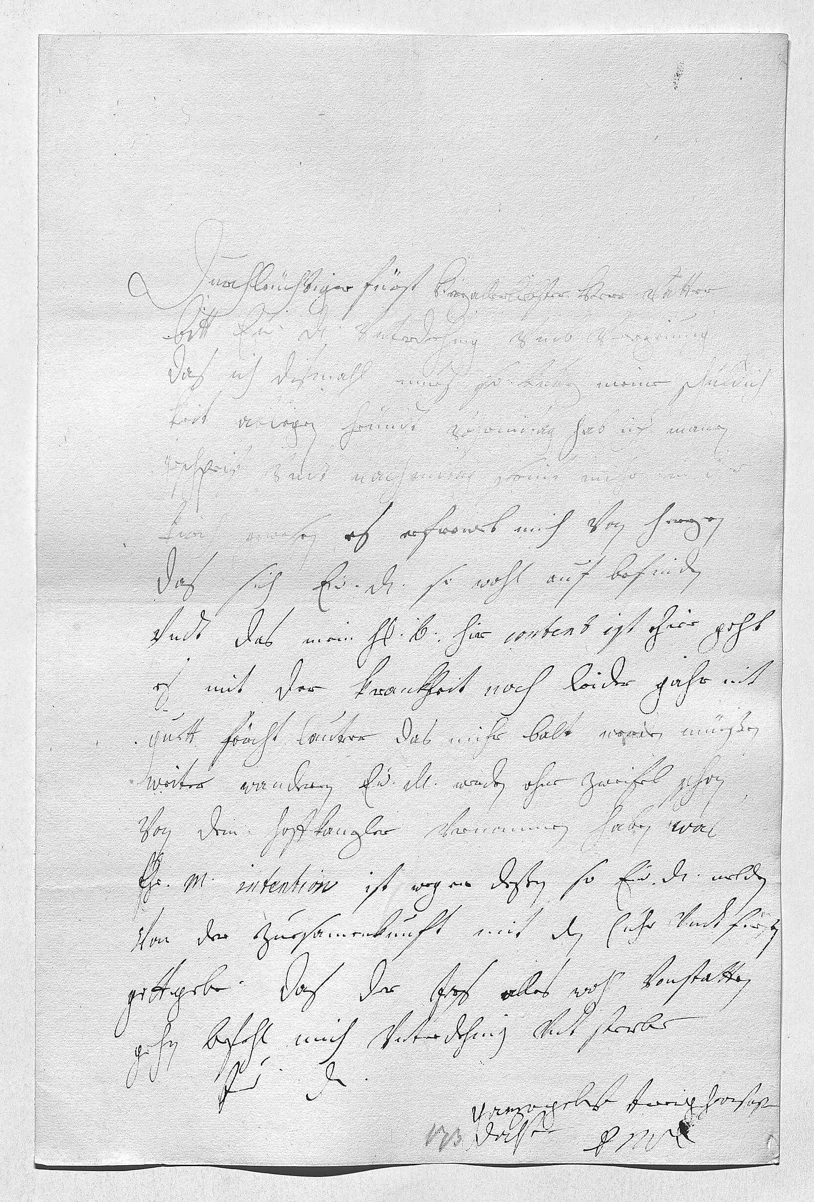0001Durchleüchtiger Fürst, herzallerliebster herr vatter 0002Bitt ewer Durchlaucht vnterdehnig vmb verzeiung, 0003das ich dismahl mues so kurz meine schuldich- 0004keit ablegen. Heündt vormitag hab ich manen 0005geschpeist vndt nachmitag seint mihr in der 0006kirch gewesen. Es erfrewet mich von herzen, 0007das sich ewer Durchlaucht so wohl auf befinden 0008vndt das mein herr bruder hir content ist. Hier geht 0009es mit der krankheit noch leider gahr nit 0010guett, förcht lauter, das mihr balt werden müeßen 0011weiter wandren. Ewer Durchlaucht werden ohne zweifel schon 0012von dem Hoffkanzler vernommen haben, was 0013ihr Mayestät intention ist wegen deßen, so ewer Durchlaucht melden 0014von der zuesamenkunft mit den cuhr vndt fürsten. 0015Gottgebe, das der Iers alles wohl vonstatten 0016gehn. Befehl mich vnterdehnig vndt sterbe 0017ewer Durchlaucht 0018ganzergebenste trewgehorsamste 0019dochter 0020EMT