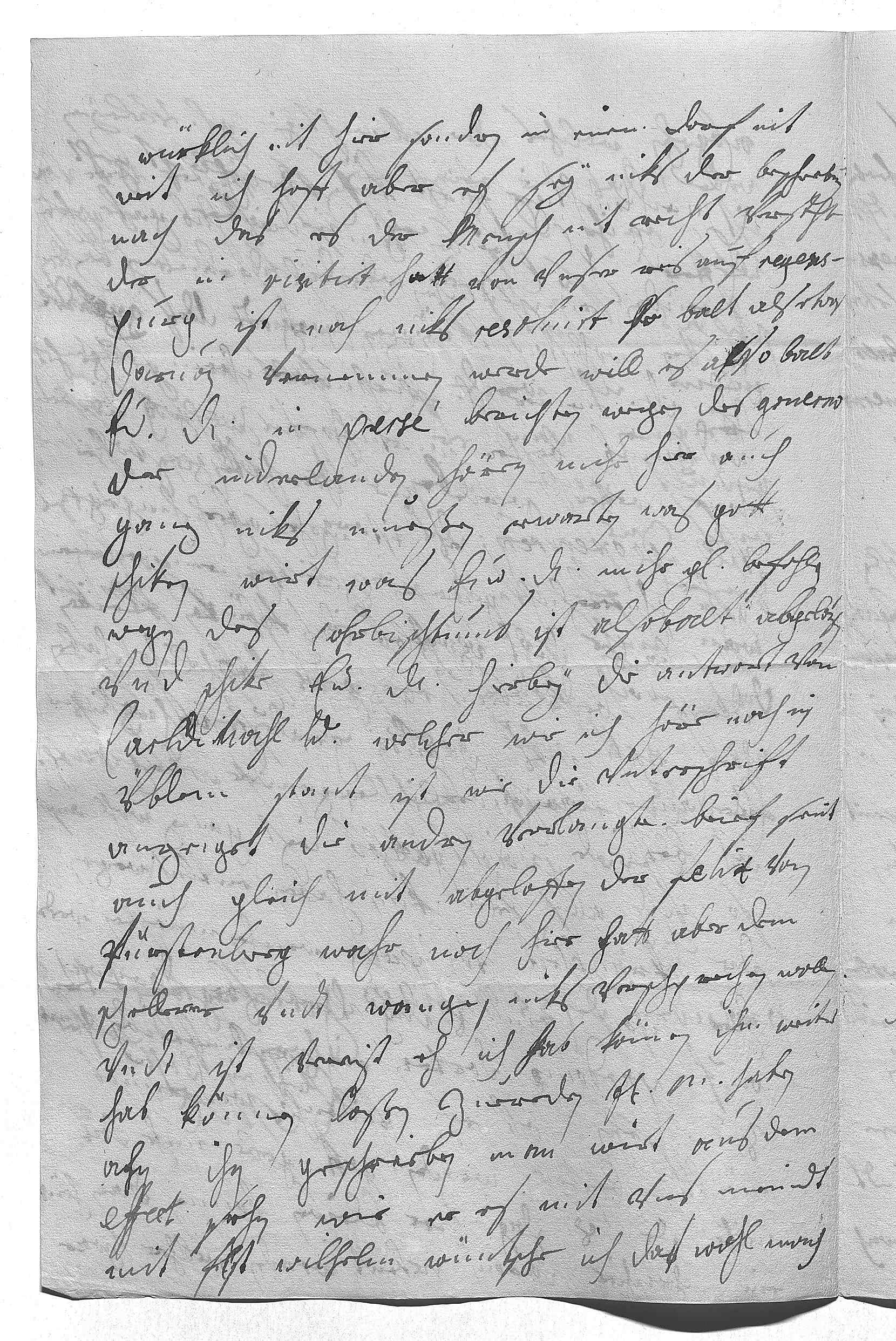 0023würklich nit hier, sondern in einem dorf nit 0024weit, ich hoff aber, es sey niks der beschreibung 0025nach, das es der mensch nit recht versteht, 0026der in visitirt hatt. Von vnser reis auf Regens- 0027purg ist noch niks resoluirt, so balt als etwas 0028daruon vernemmen werde, will es also balt 0029ewer Durchlaucht in persé berichten. Wegen des gouerno 0030der Niderlanden hören mihr hier auch 0031ganz niks, mueßen erwarten, was gott 0032schiken wirt. Was ewer Durchlaucht mihr gnädig befehlen 0033wegen des cohrbischtums, ist alsobalt abgelofen, 0034vnd schike ewer Durchlaucht hierbey die anwort von 0035Carldinahl Liebden, welcher, wie ich höre, noch in 0036üblem stant ist, wie die vnterschrift 0037anzeiget. Die andren verlangten brief seint 0038auch gleich mit abgeloffen. Der Felix von 0039Fürstenberg wahr noch hier, hatt aber dem 0040Schellerer vndt Wangen niks verschprechen wollen 0041vndt ist vereist, eh ich hab können ihm weiter 0042hab können laßen zuereden. Ihr Mayestät haben 0043ahn ihn geschrieben, man wirt aus dem 0044effect sehn, wie er es mit vns meindt. 0045Mit Fürst Wilhelm wüntsche ich, das wohl mach
