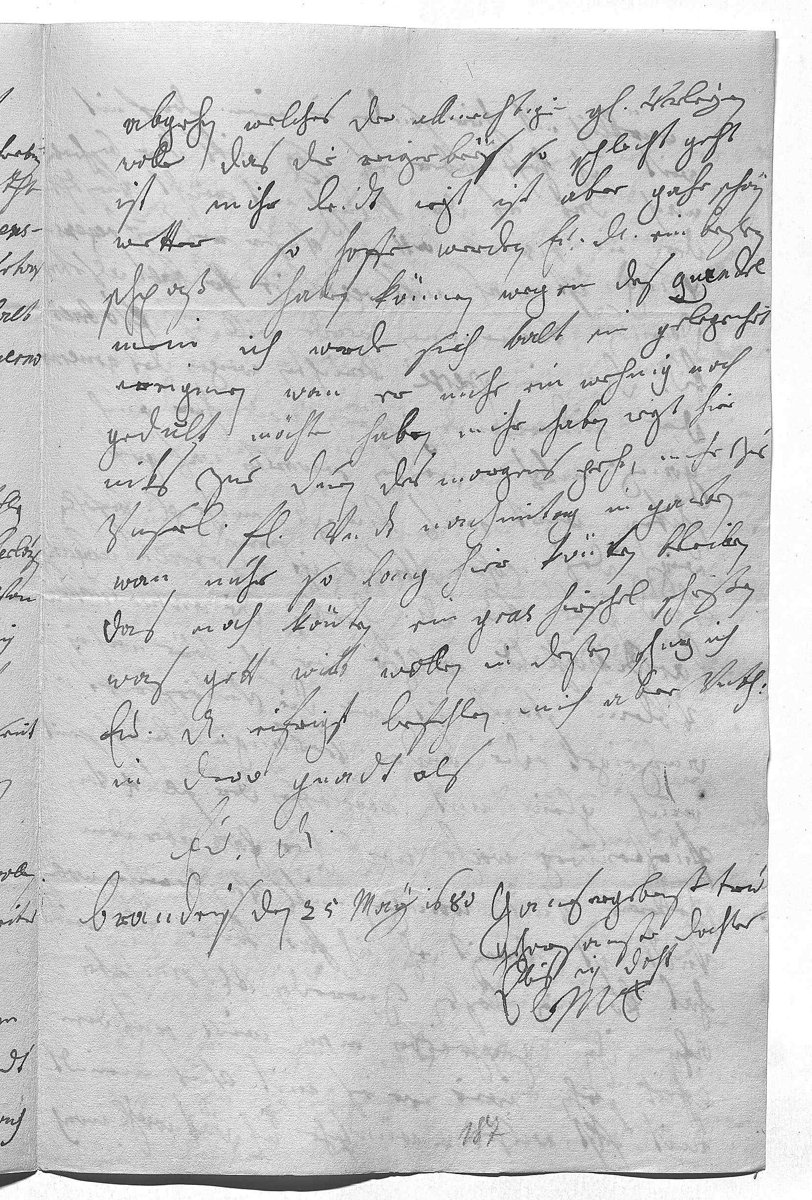0046abgehn, welches der allmechtige gnädig verleyen 0047wolle. Das die reigerbeys so schlecht geht, 0048ist mihr leidt. Iezt ist aber gahr schön 0049wetter, so hoffe werden ewer Durchlaucht ein beßern 0050schpaß haben können. Wegen des Quendel, 0051mein ich, werde sich balt ein gelegenheit 0052ereigenen, wan er nuhr ein wehnig noch 0053gedult möchte haben. Mihr haben iezt hier 0054niks zue duen, des morgens gehen mihr zue 0055vnser lieben frawen, vndt nachmitag in garten. 0056Wan nuhr so lang hier könten bleiben, 0057das noch könten ein gras hirschel schießen. 0058Was gott wirt wollen, in deßen schuz ich 0059ewer Durchlaucht eifrigst befehlen, mich aber vnterthenig 0060in dero gnadt als 0061ewer Durchlaucht 0062ganzergebenst trew 0063gehorsamste dochter 0064bis in doht 0065EMT 0066Brandeis den 25 maij 1680
