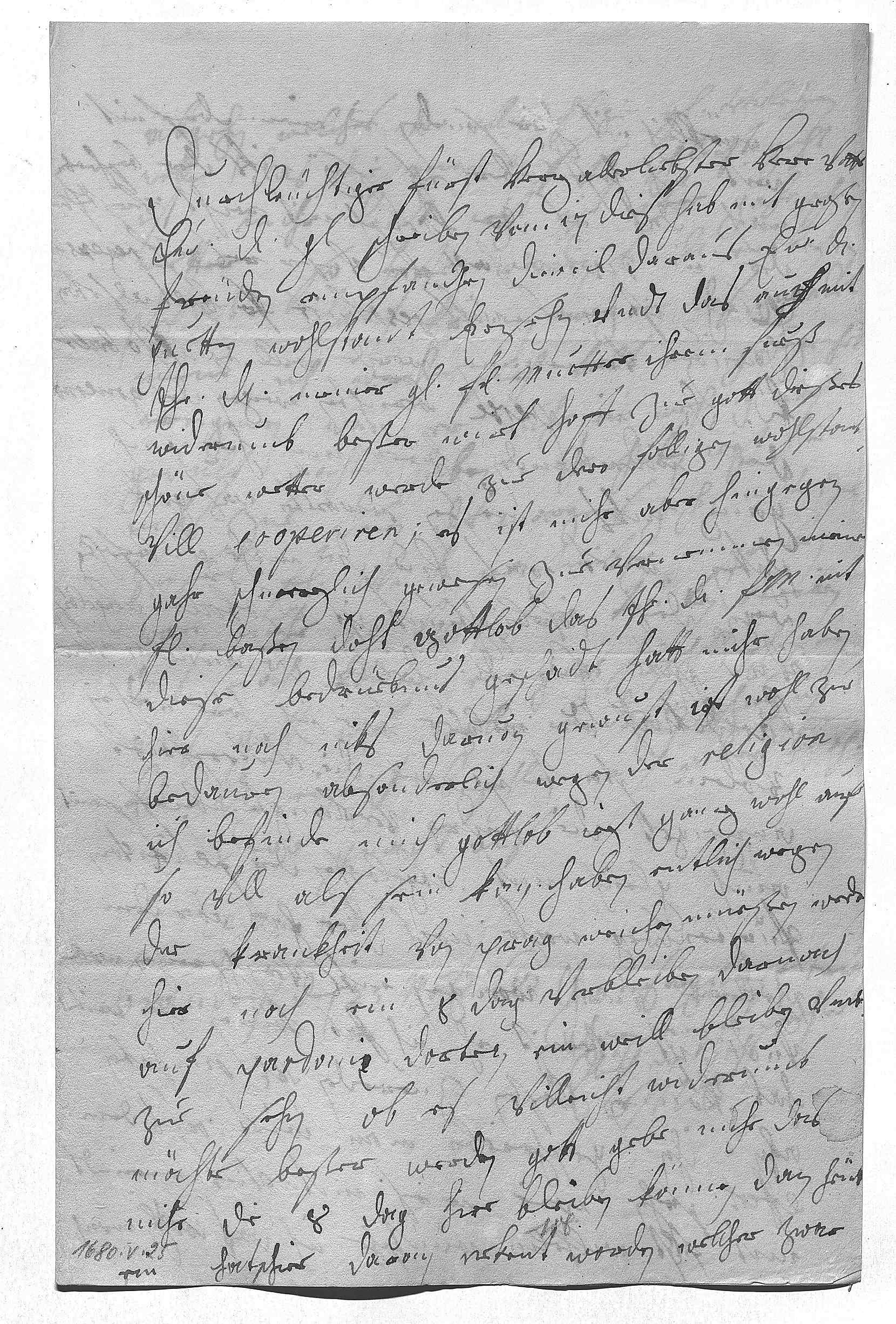 0001Durchleüchtiger Fürst, herz allerliebster herr vatter 0002Ewer Durchlaucht gnädiges schreiben vom 17 dies hab mit großen 0003freüden empfangen, dieweil daraus ewer Durchlaucht 0004guetten wohlstant ersehn vndt das auch mit 0005ihr Durchlaucht meiner geliebsten frau muetter ihrem fueß 0006widerumb beßer wirt. Hoff zue gott, dießes 0007schöne wetter werde zue dero fölligen wohlstant 0008vill cooperiren; es ist mihr aber hingegen 0009gahr schmerzlich gewesen zue vernemmen meiner 0010fraw baßen doht. Gottlob, das ihr Durchlaucht fraw mutter nit 0011diese bedrüebnus geschadt hatt. Mihr haben 0012hier noch niks daruon gewust, ist wohl zue 0013bedauren, absonderlich wegen der religion. 0014Ich befinde mich gottlob iezt ganz wohl auf, 0015so vill als sein kan. Haben entlich wegen 0016der krankheit von Prag weichen müeßen, werden 0017hier noch ein 8 dag verbleiben, darnach 0018auf Pardouiz, dorten ein weill bleiben vmb 0019zue sehn, ob es villeicht widerumb 0020möchte beßer werden. Gott gebe nuhr, das 0021mihr die 8 dag hier bleiben können, dan heüt 0022ein hatschier daran erkent worden, welcher zwar
